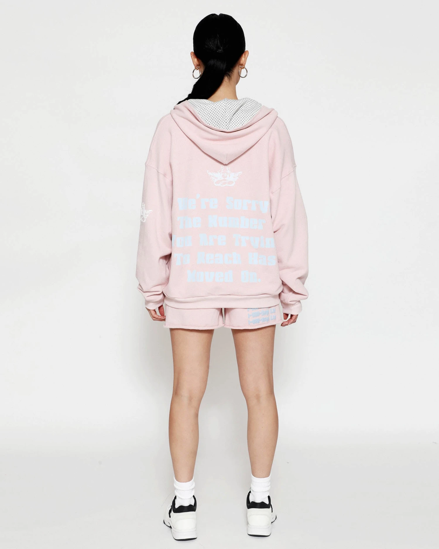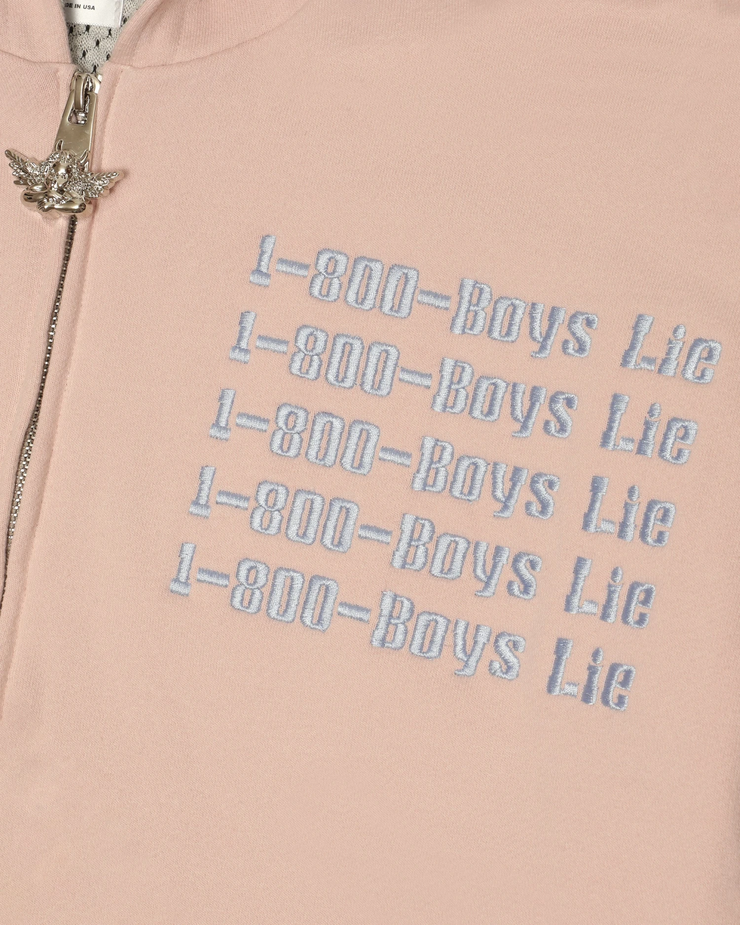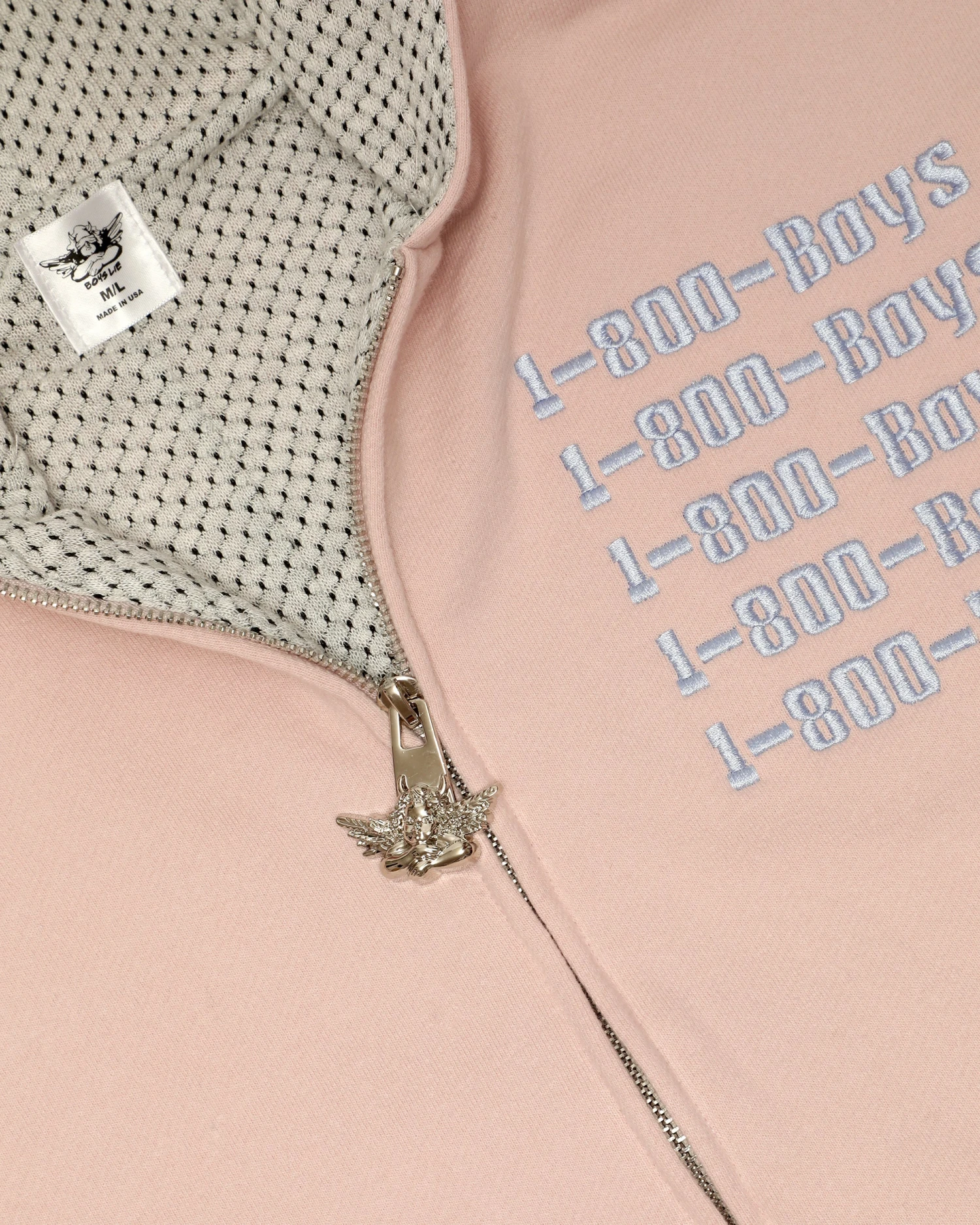 French terry fabric in dusty pink. Oversized zip up hoodie with inside lining, front pockets, and ribbed cuffs. Features extra large Boys Lie logo zipper pull, puff print and embroidered details.