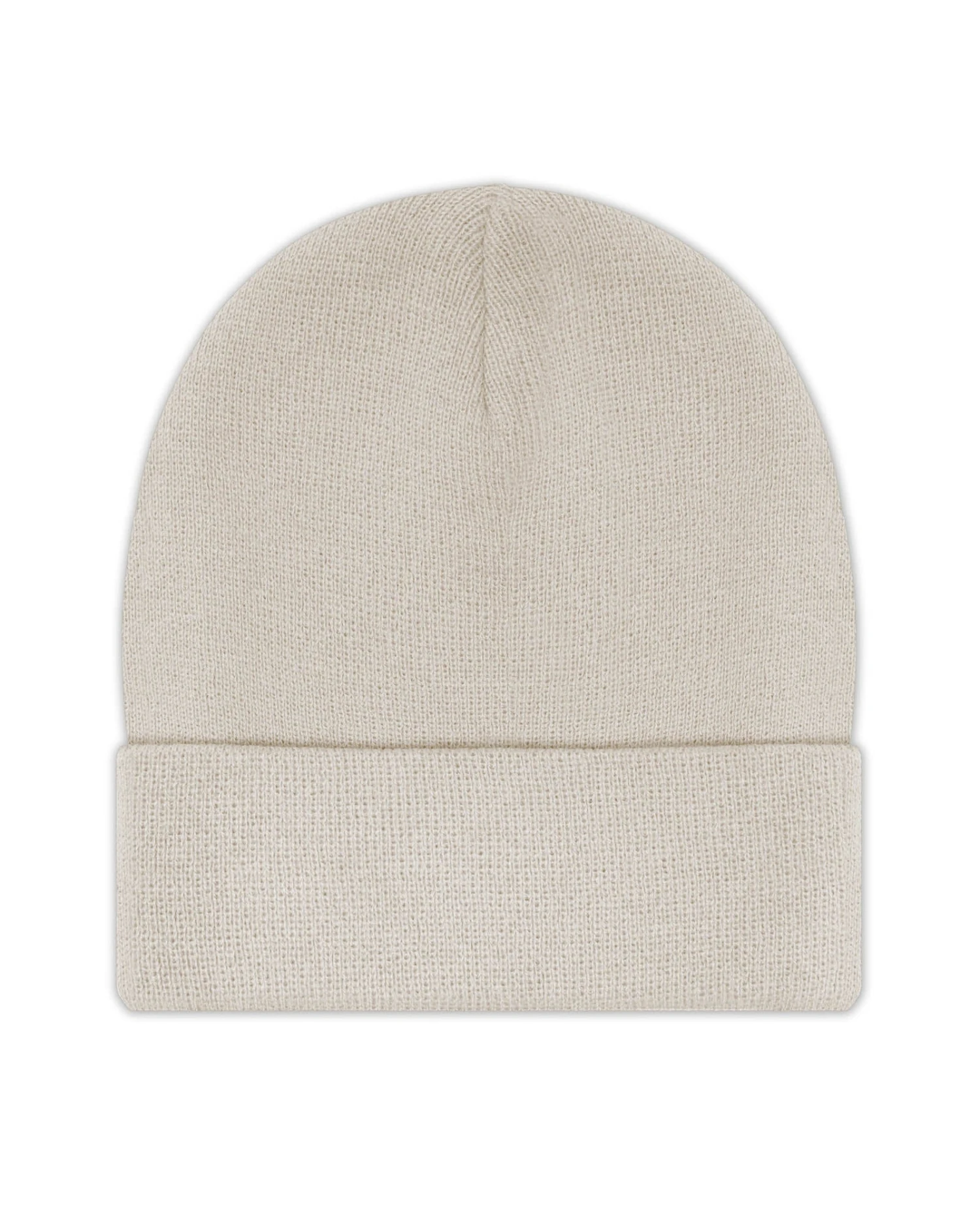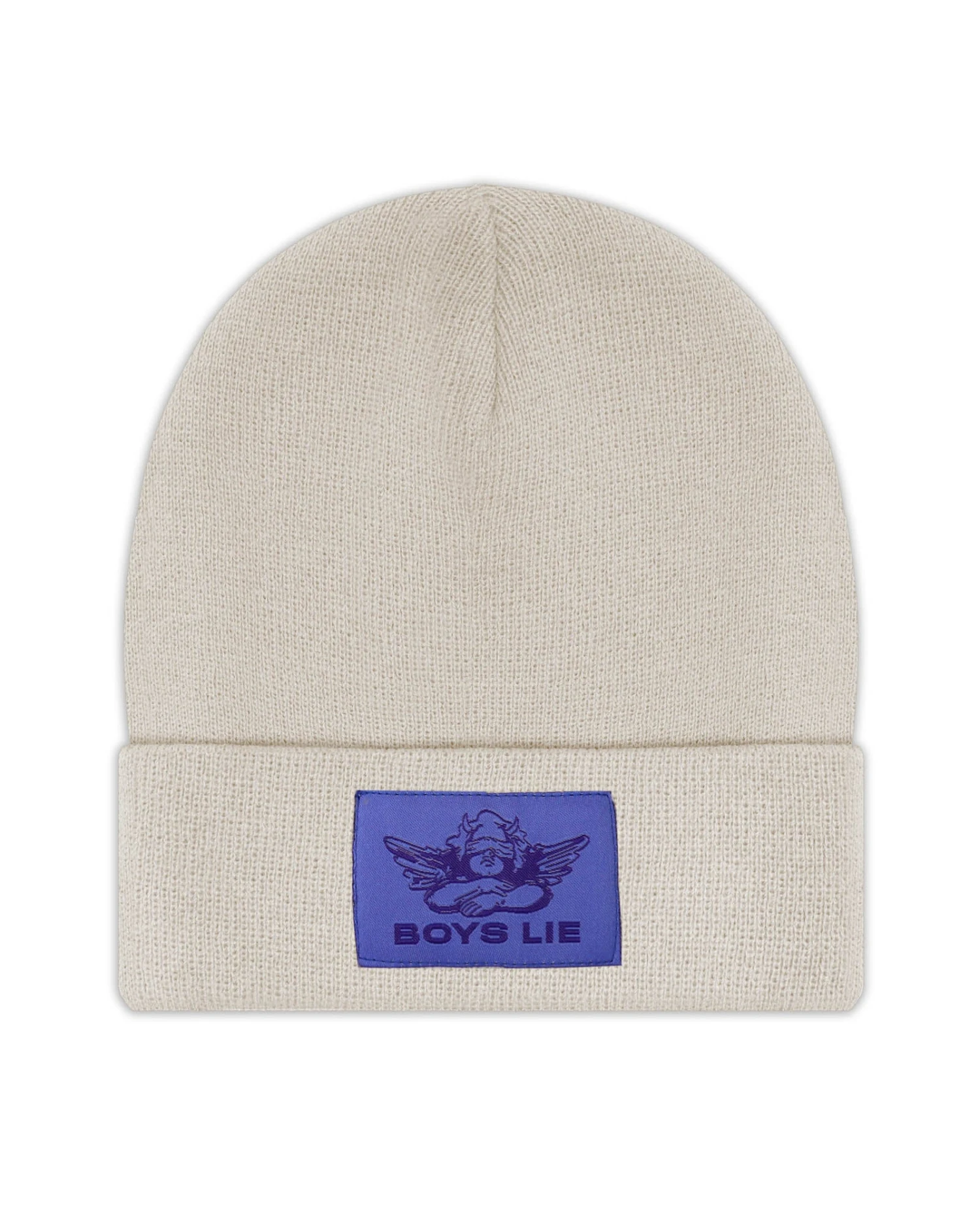 Light taupe beanie with purple Boys Lie logo patch.