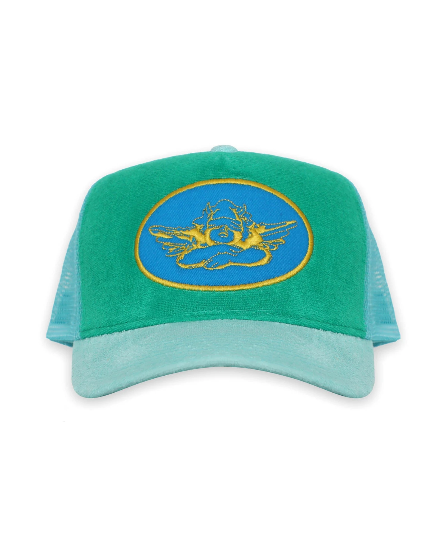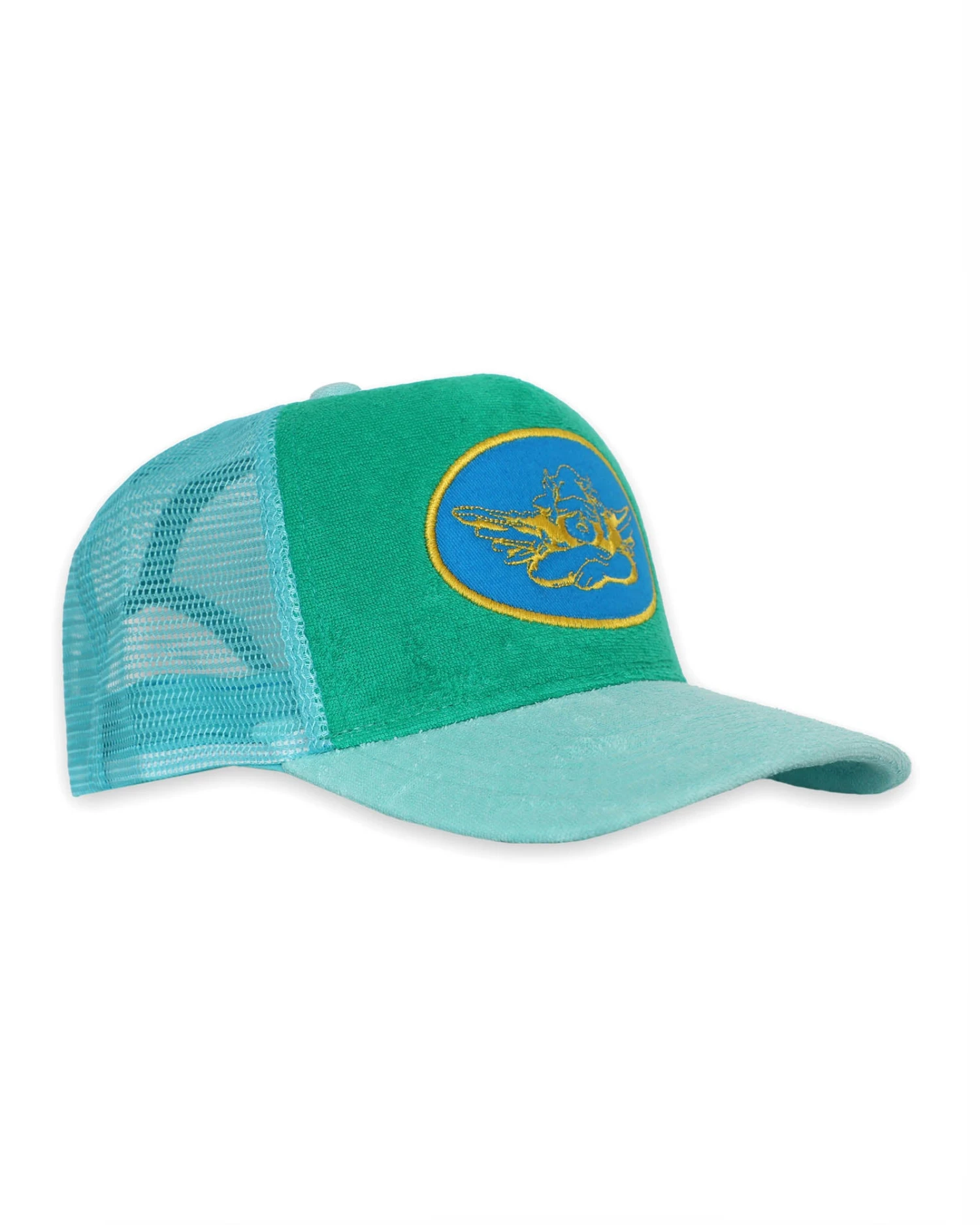 Bright blue trucker hat with blue patch and green terry cloth. Adjustable snapback.Â