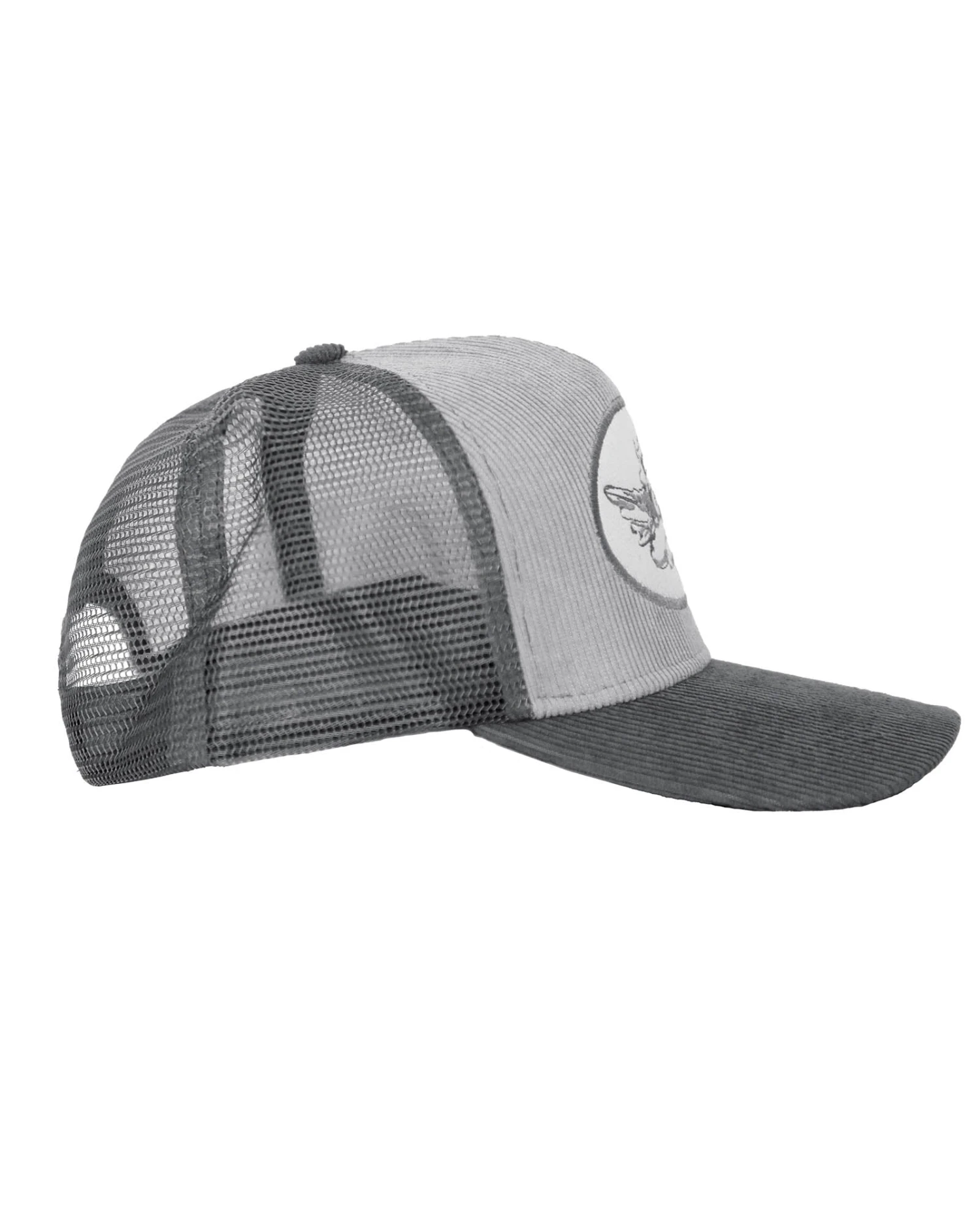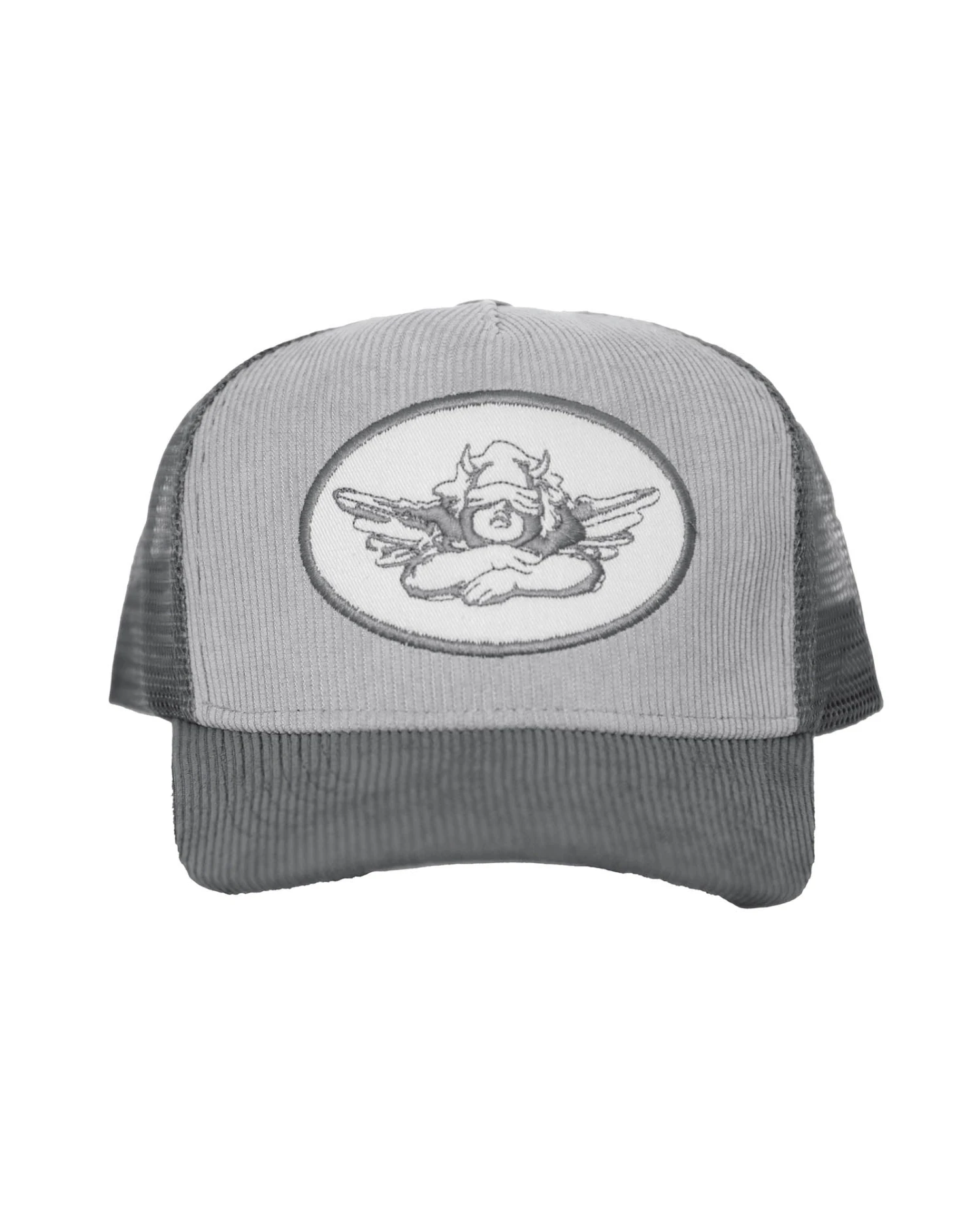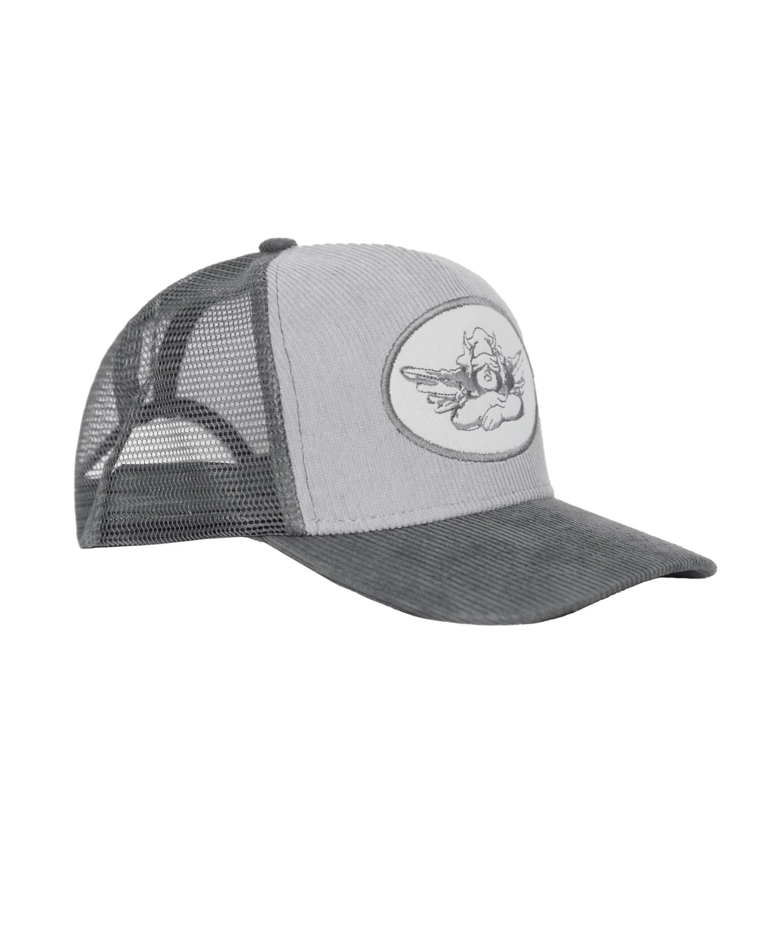 Grey corduroy trucker hat with monochromatic patch. Adjustable snapback.Â