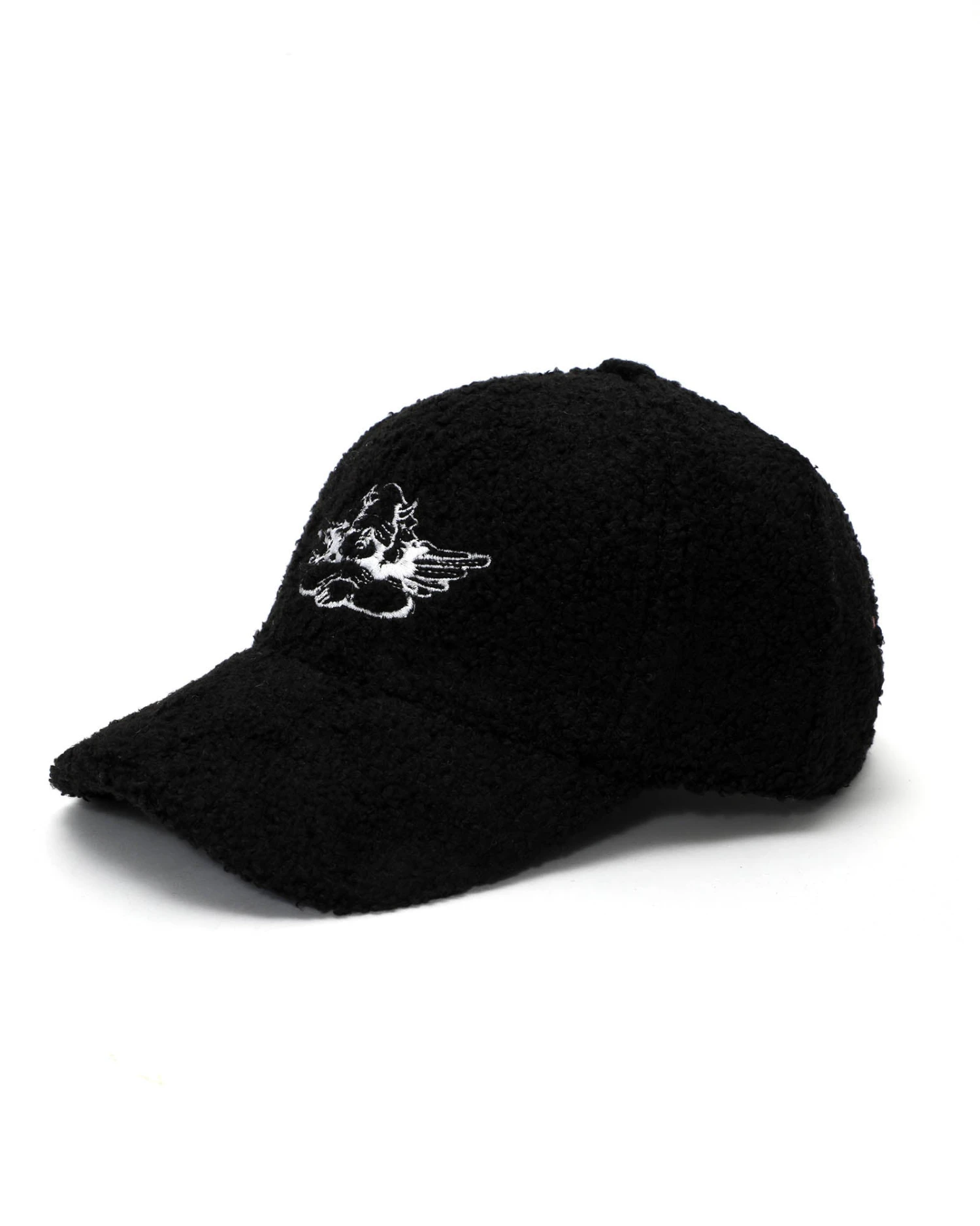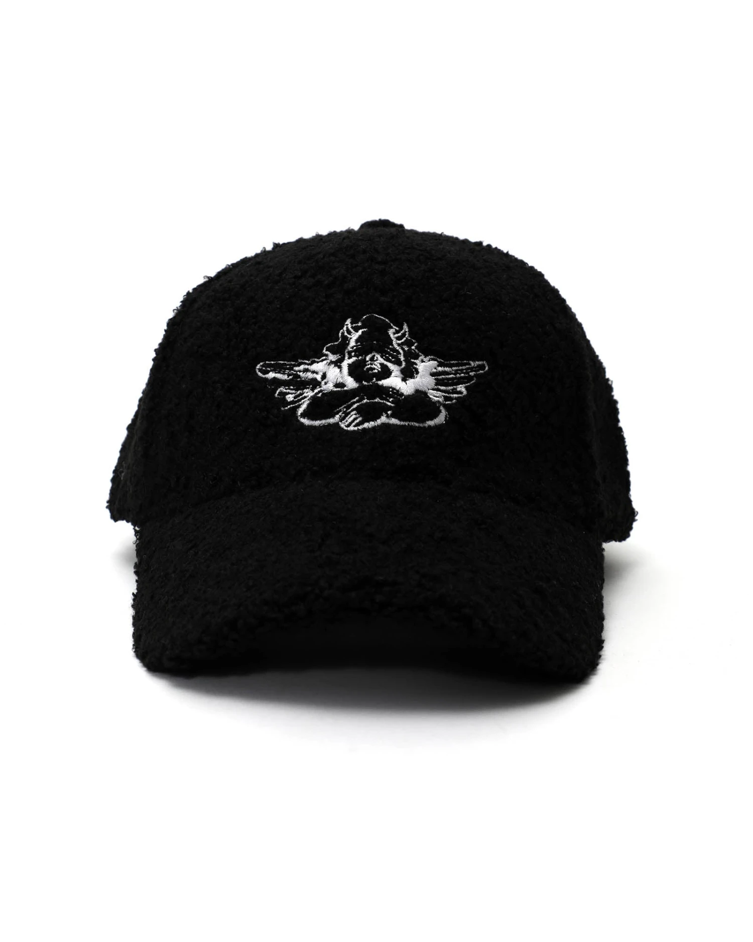 Faux black sherpa baseball hat with white Boys Lie cherub logo and an adjustable velcro strap.Â