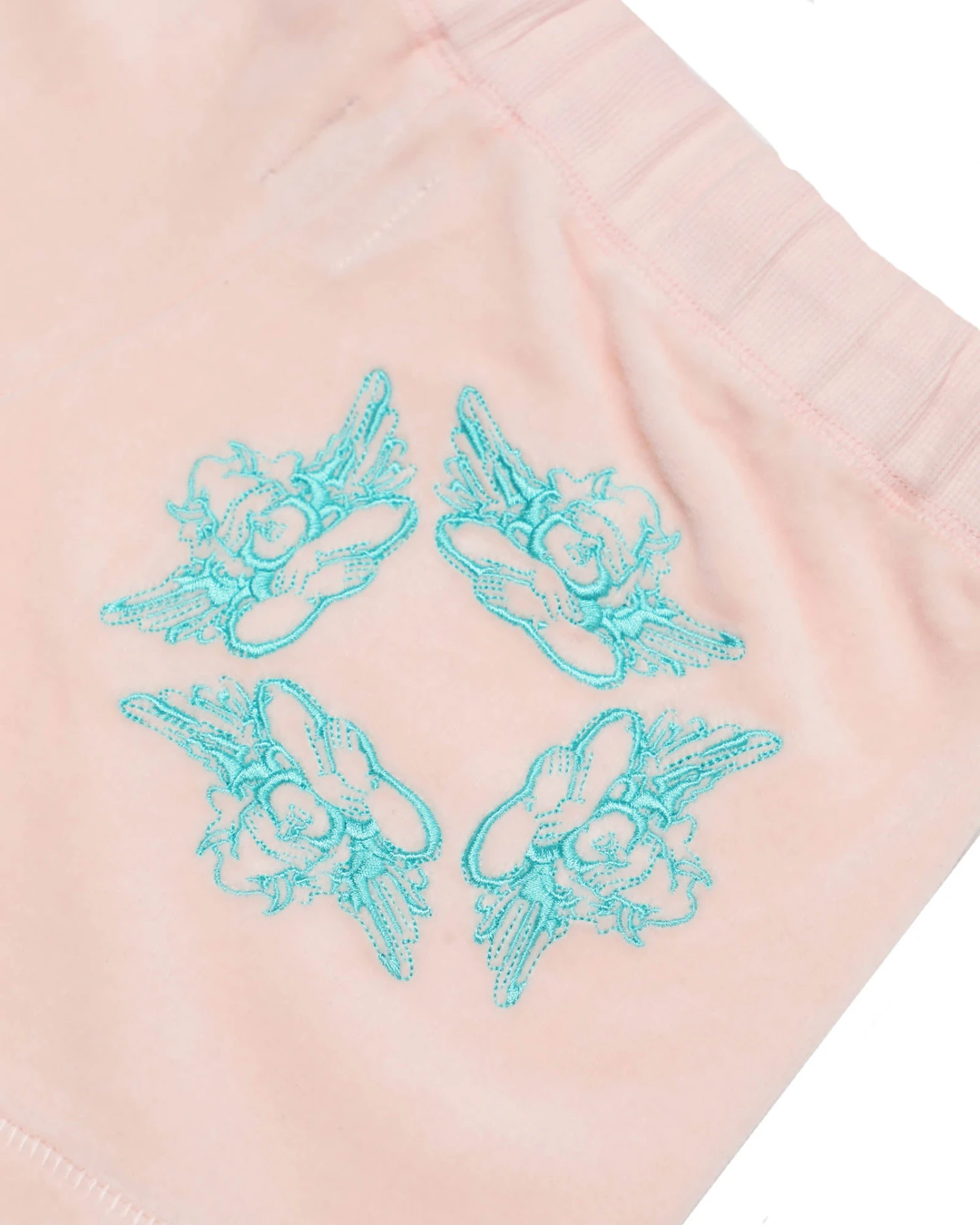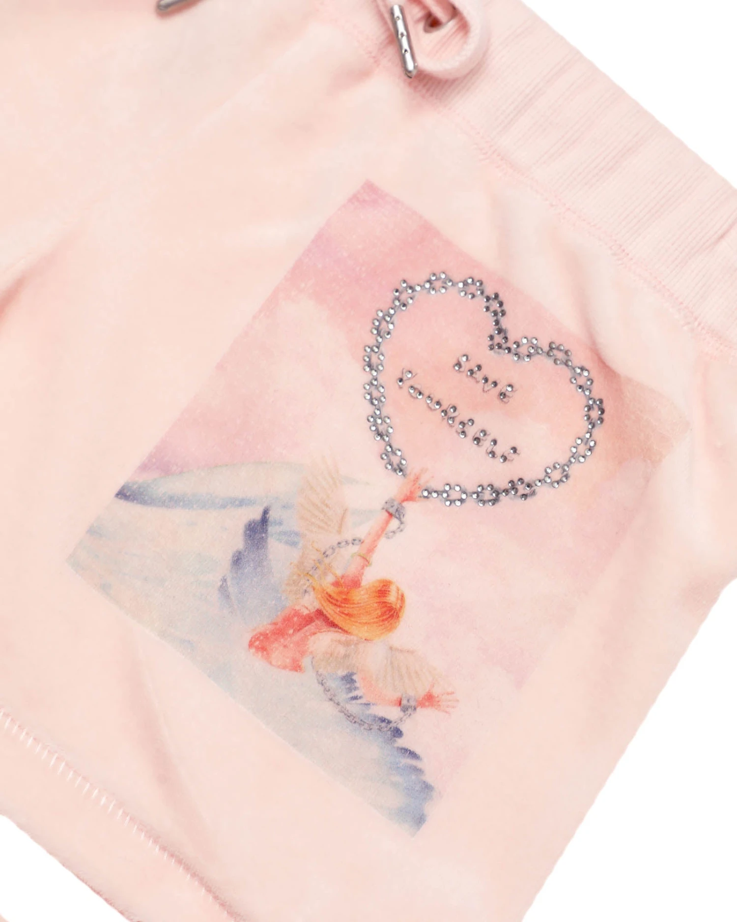 Soft velour fabric in baby pink. Mid-rise shorts with adjustable drawstring, embroidered logos, and rhinestone embellishments.Â