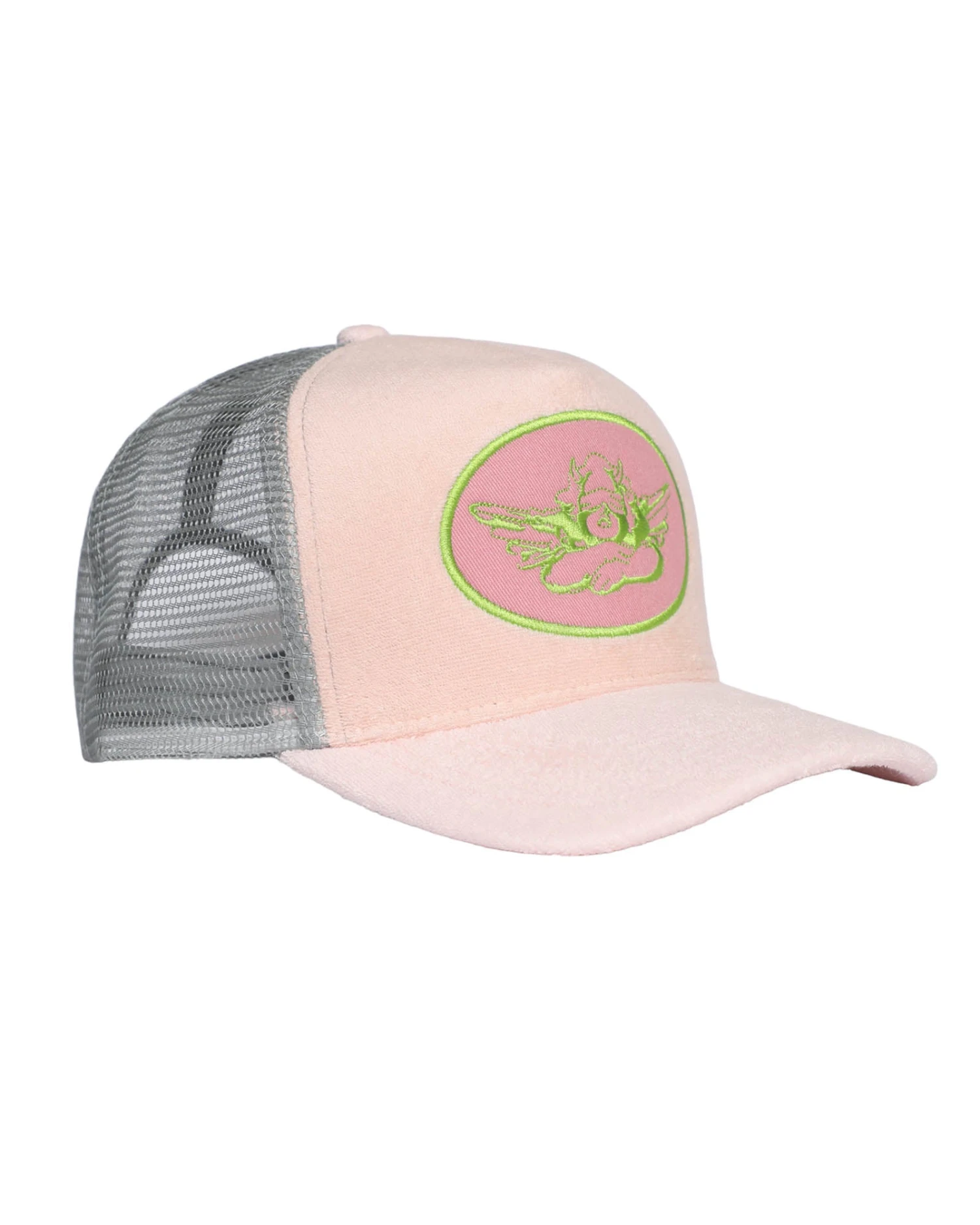 Grey trucker hat with pink patch and peach terry cloth. Adjustable snapback.Â