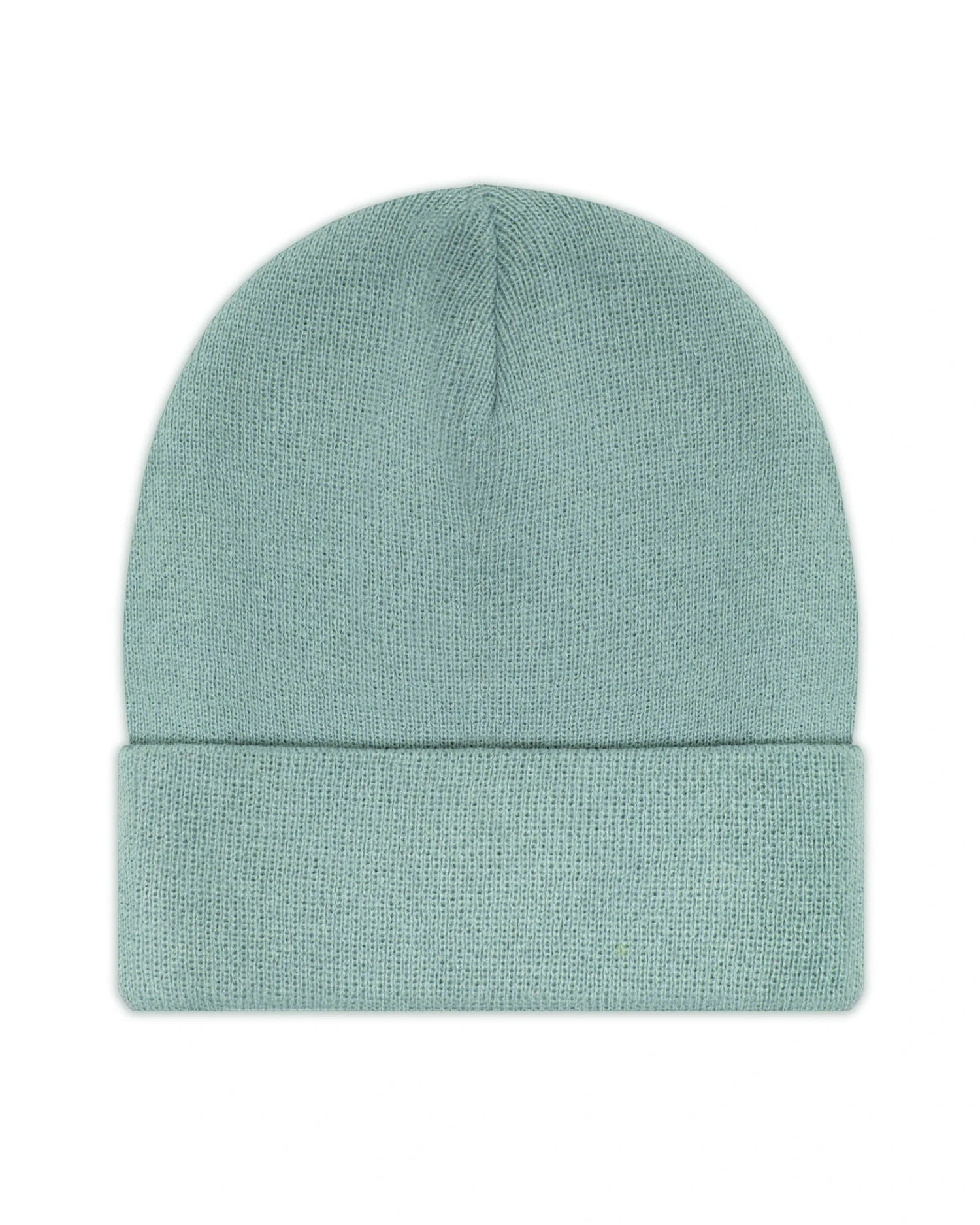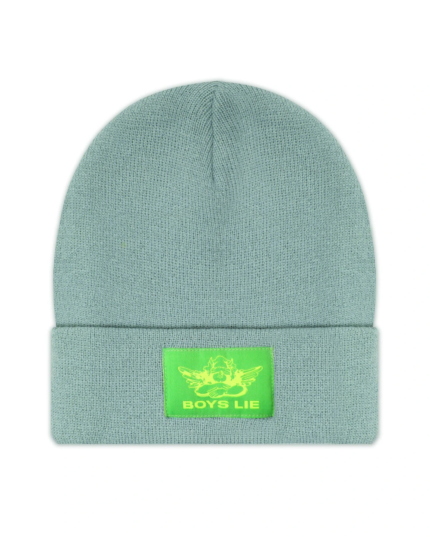 Robin’s egg blue beanie with lime green Boys Lie logo patch.