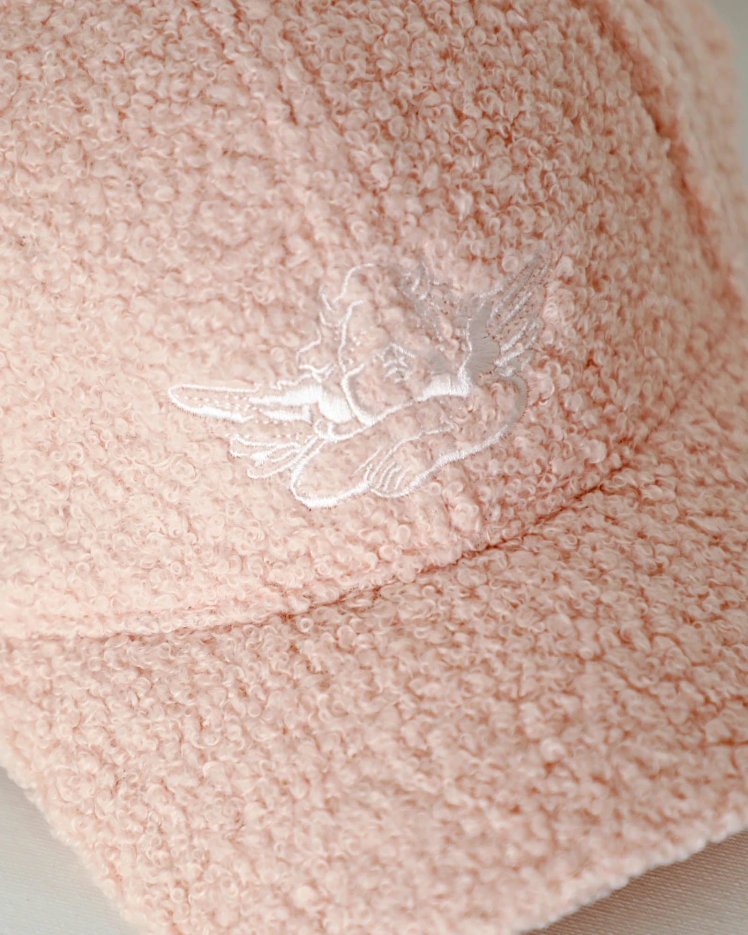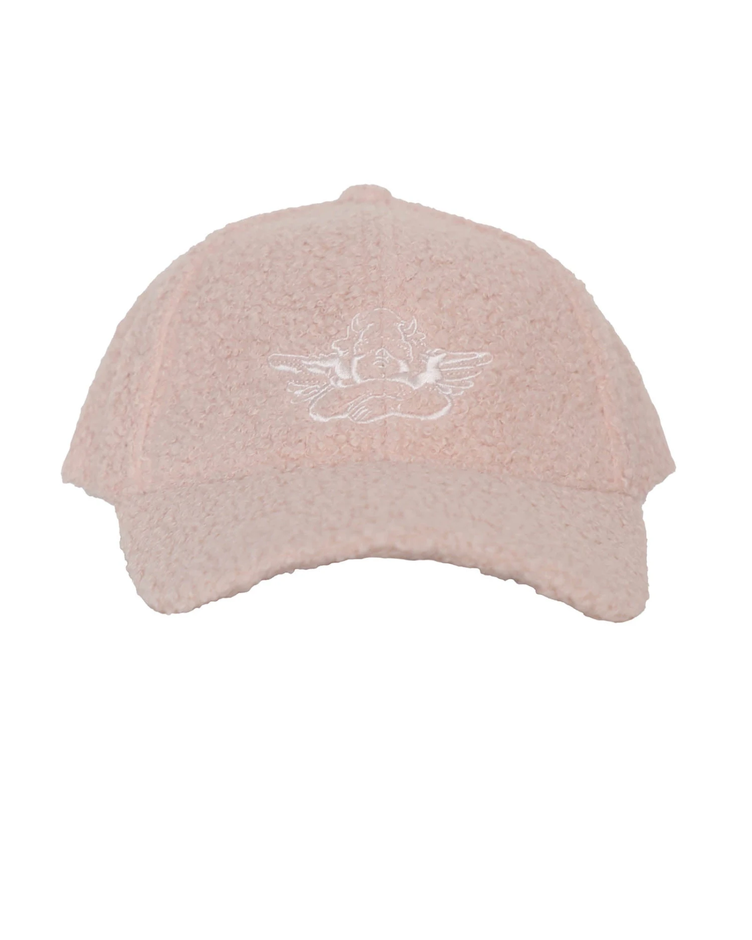 Faux light pink sherpa baseball hat with white Boys Lie cherub logo and an adjustable velcro strap.Â