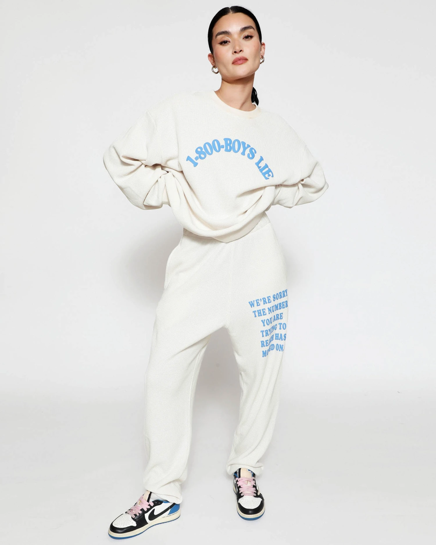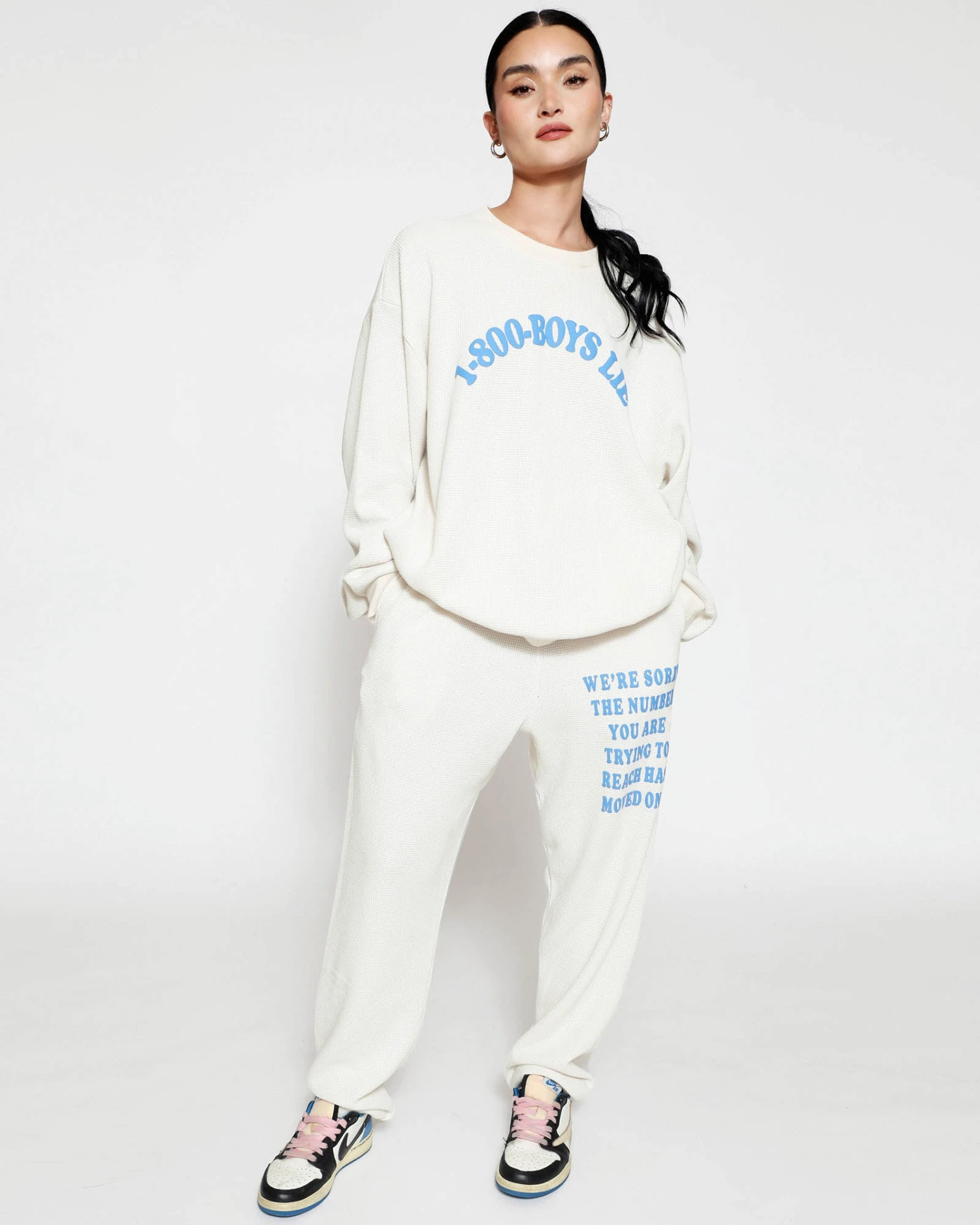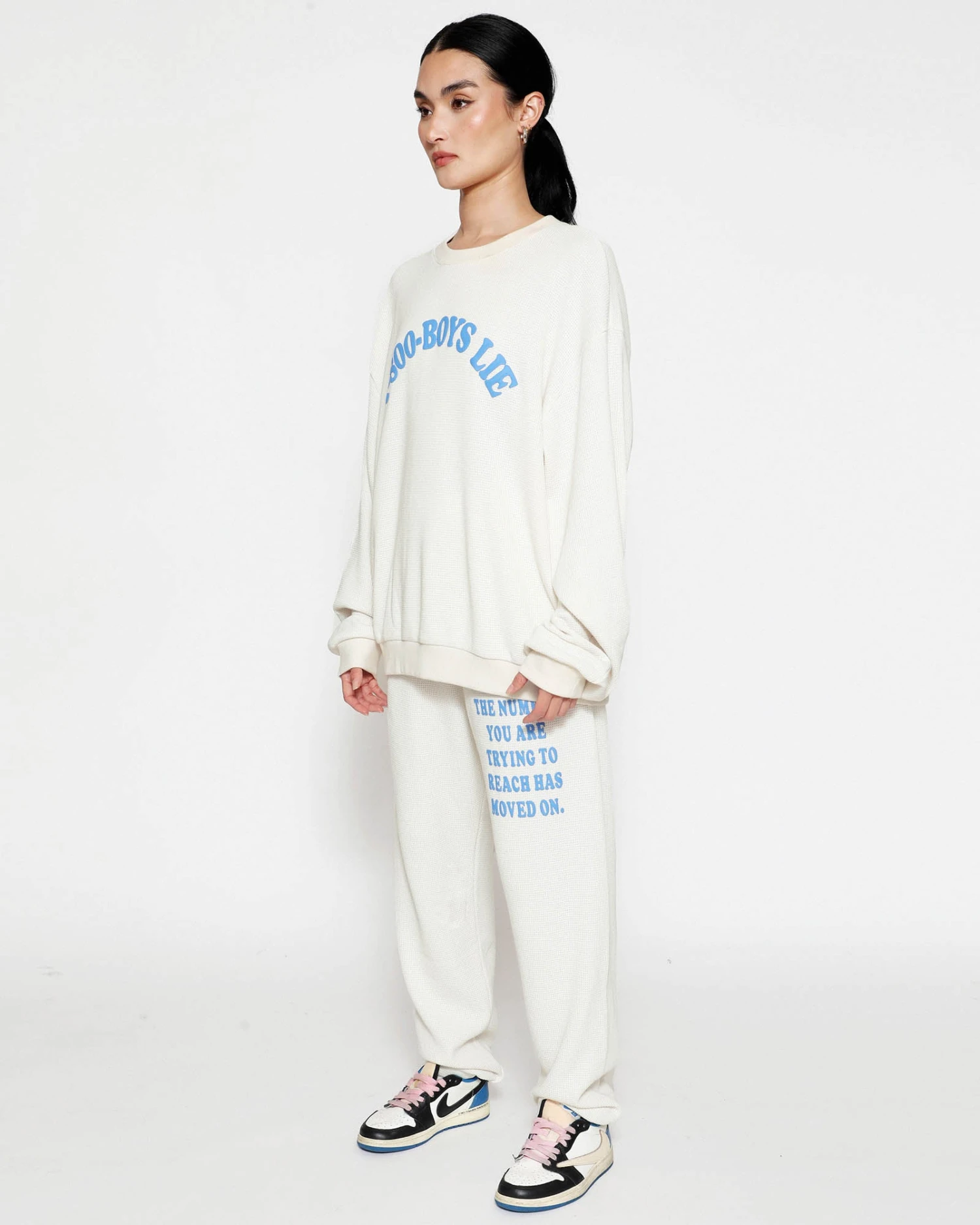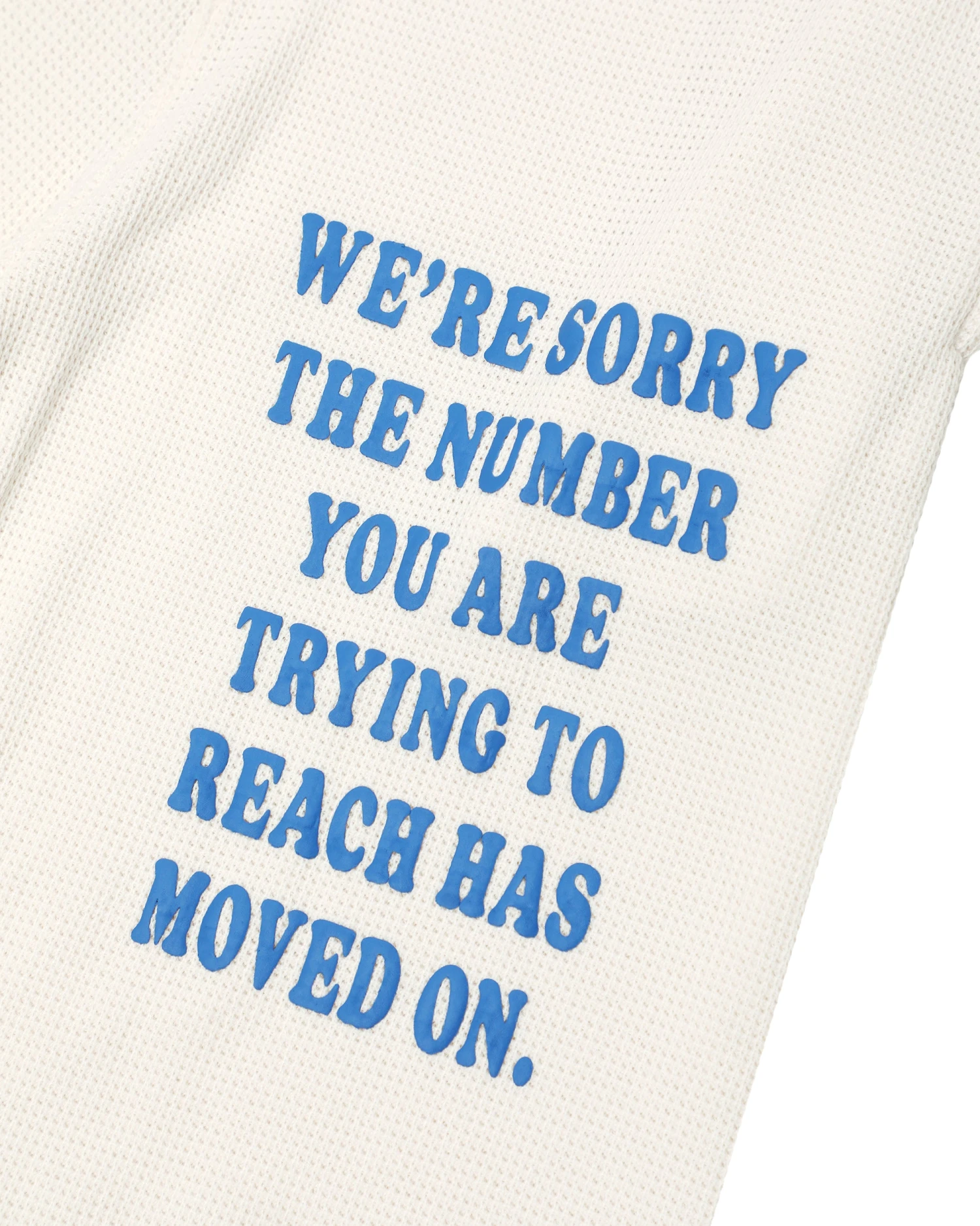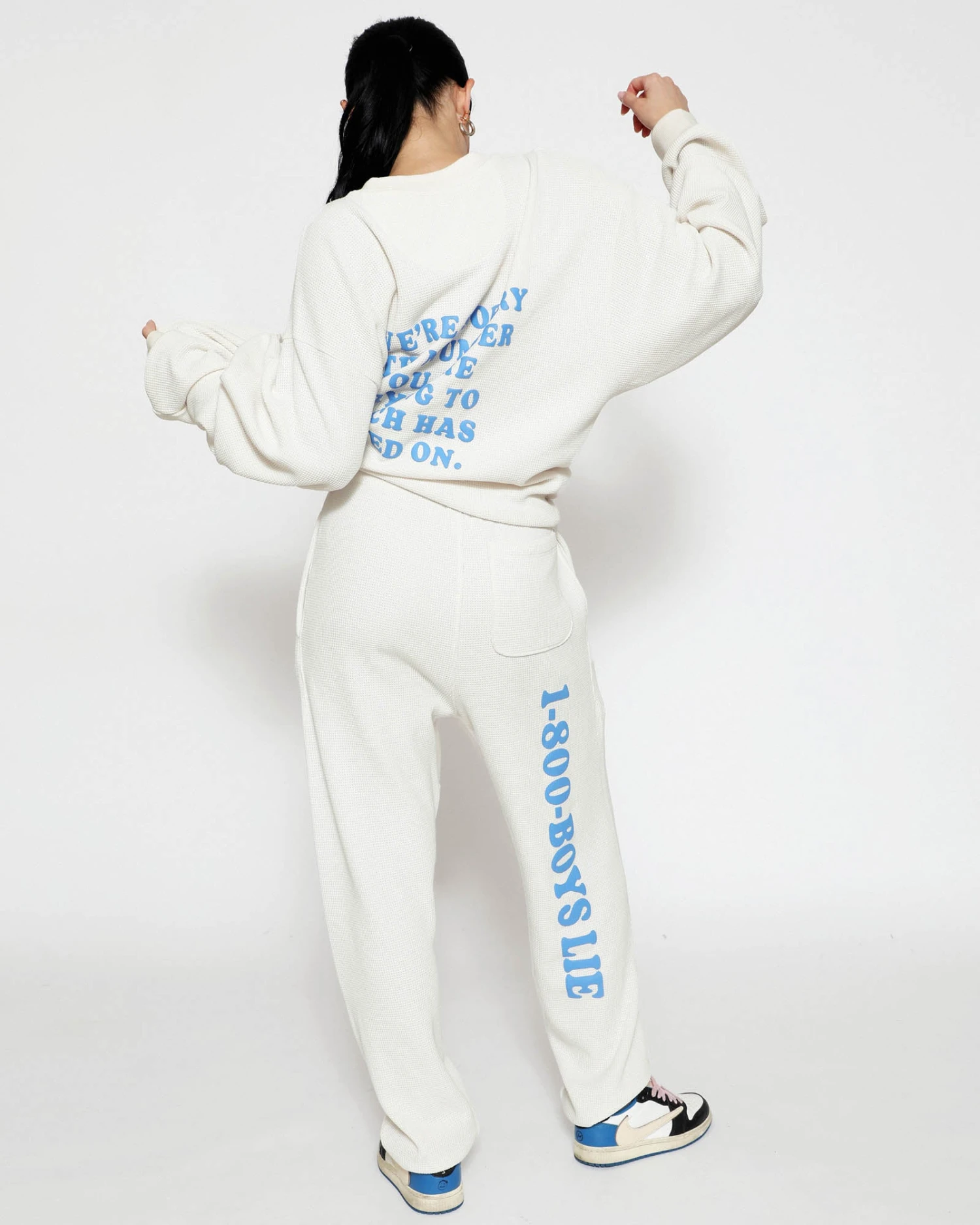 Soft thermal fabric in off white. High rise sweatpants with back and side pockets, elastic waistband and cuffs. Features puff print graphics.