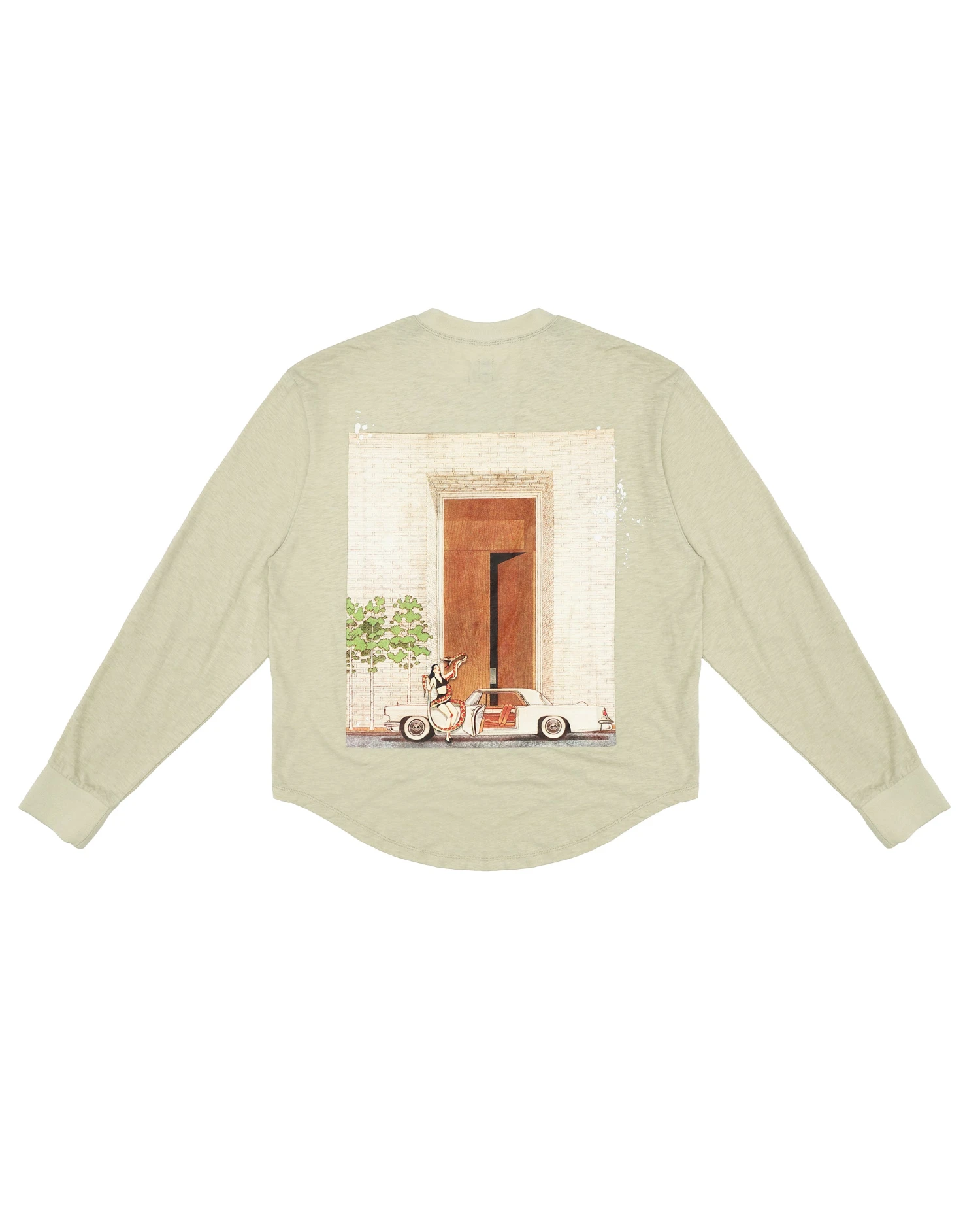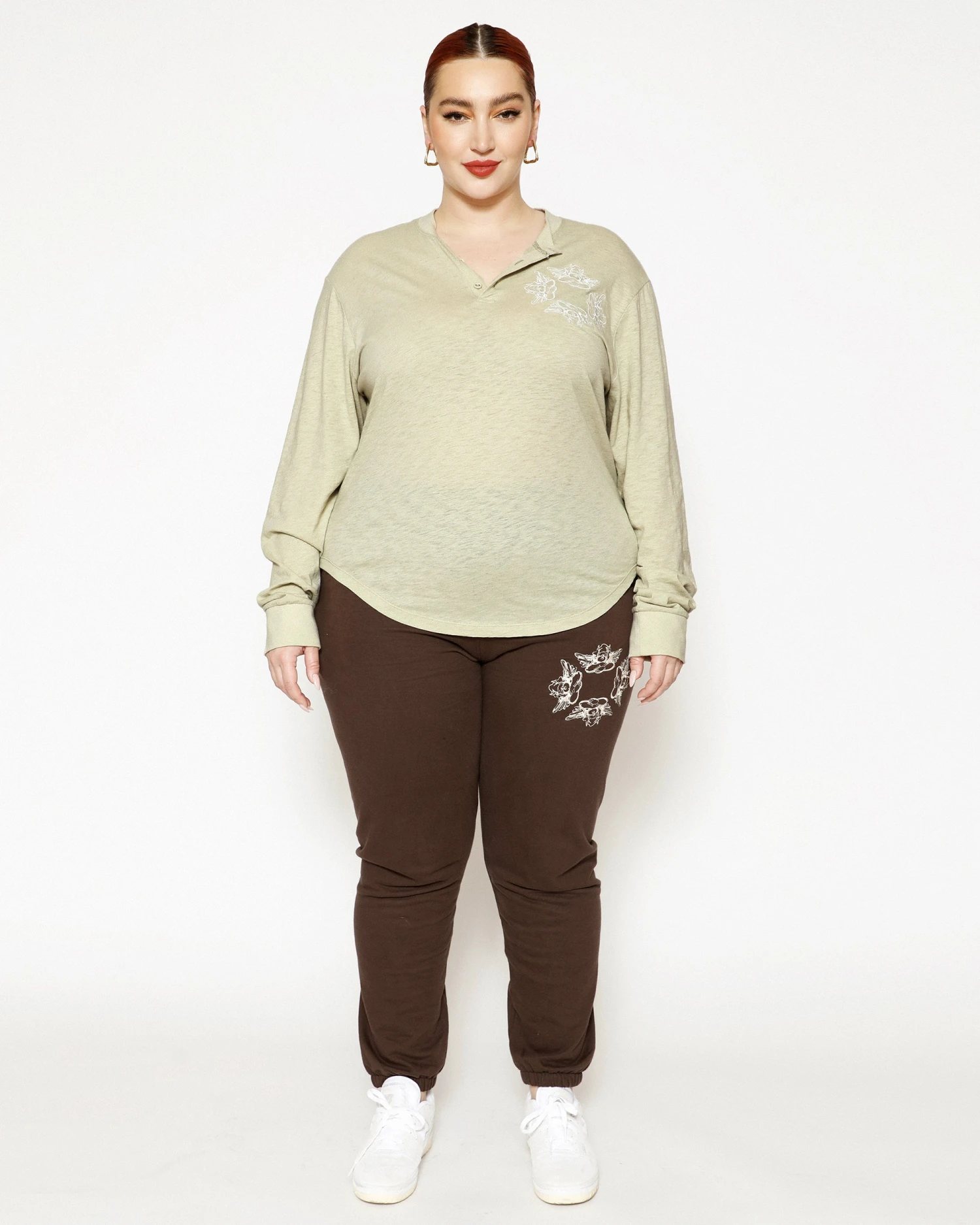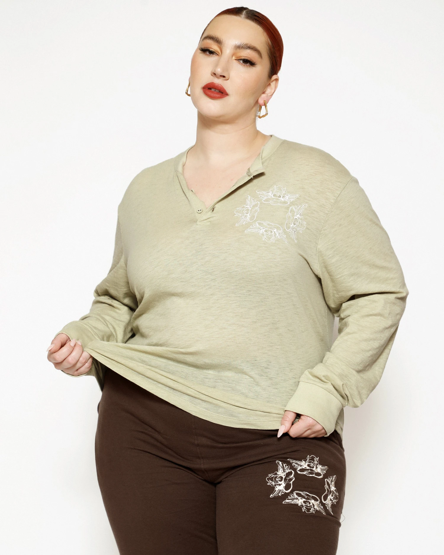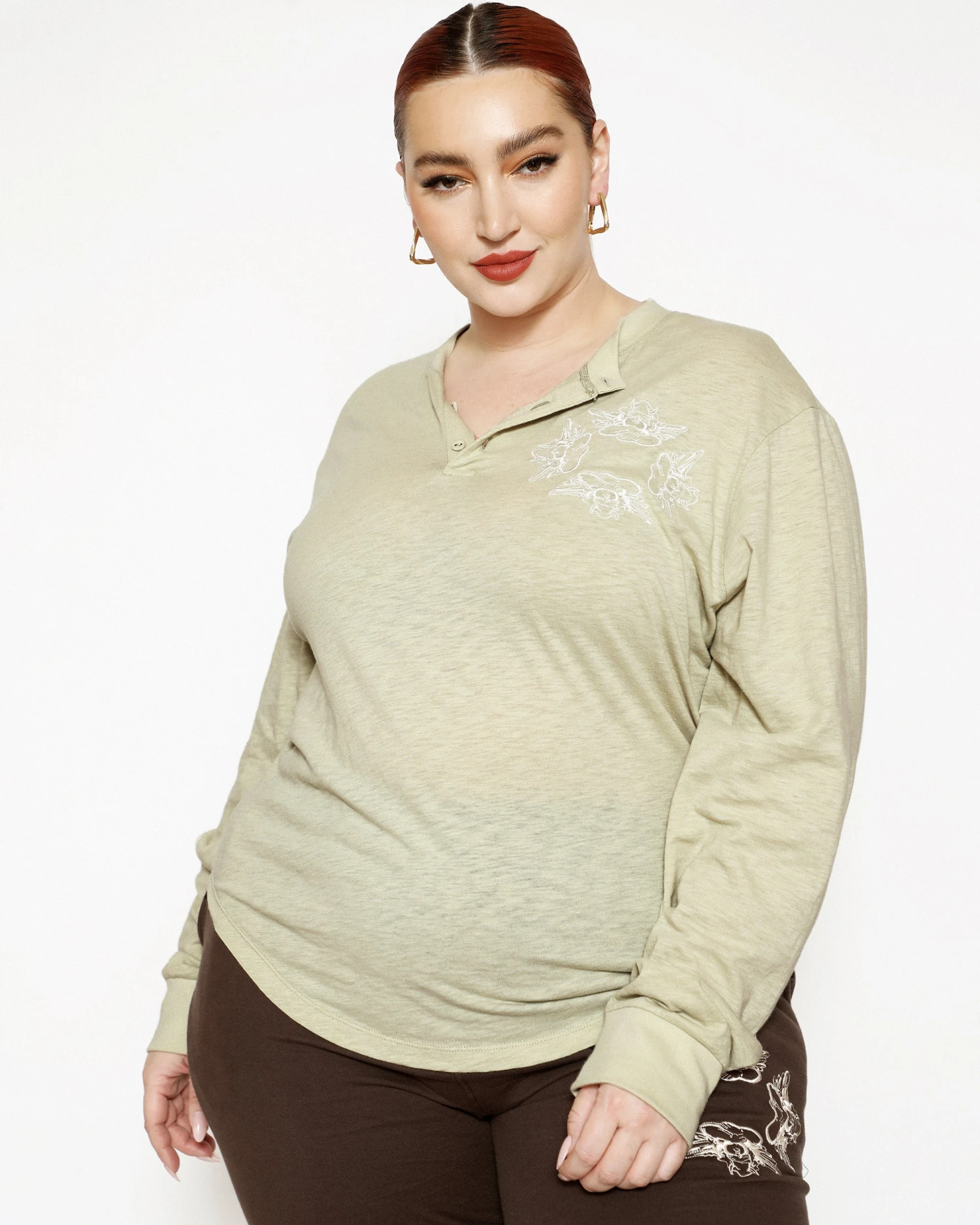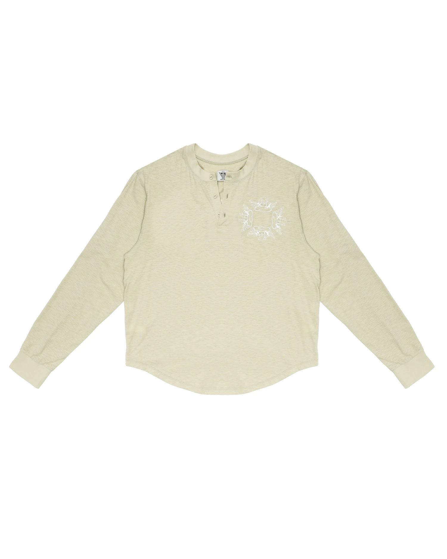 Oversized long sleeve henley in sage green. Front button details and a curved hem with embroidered logos.Â