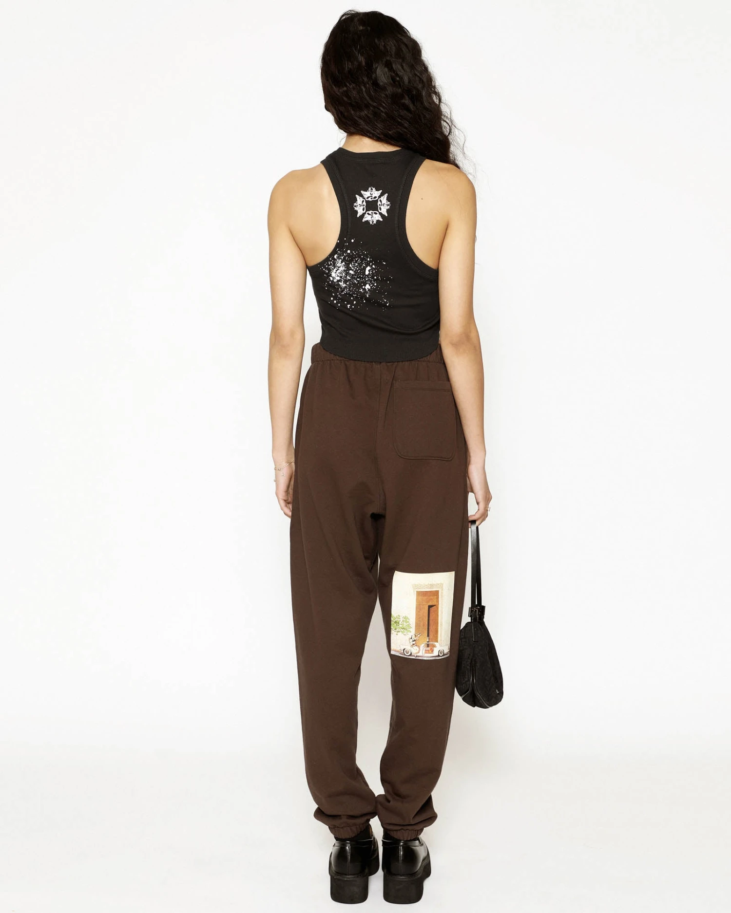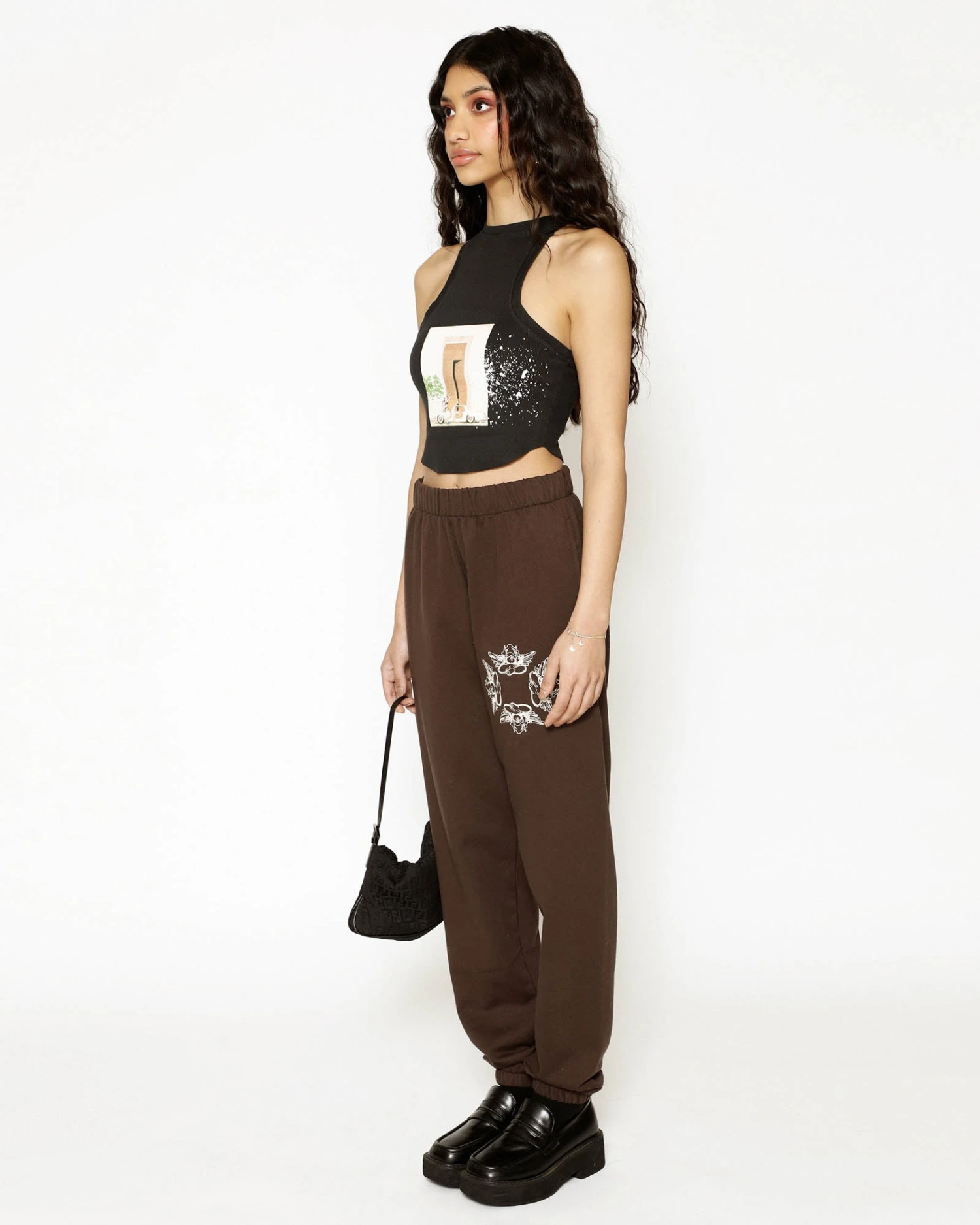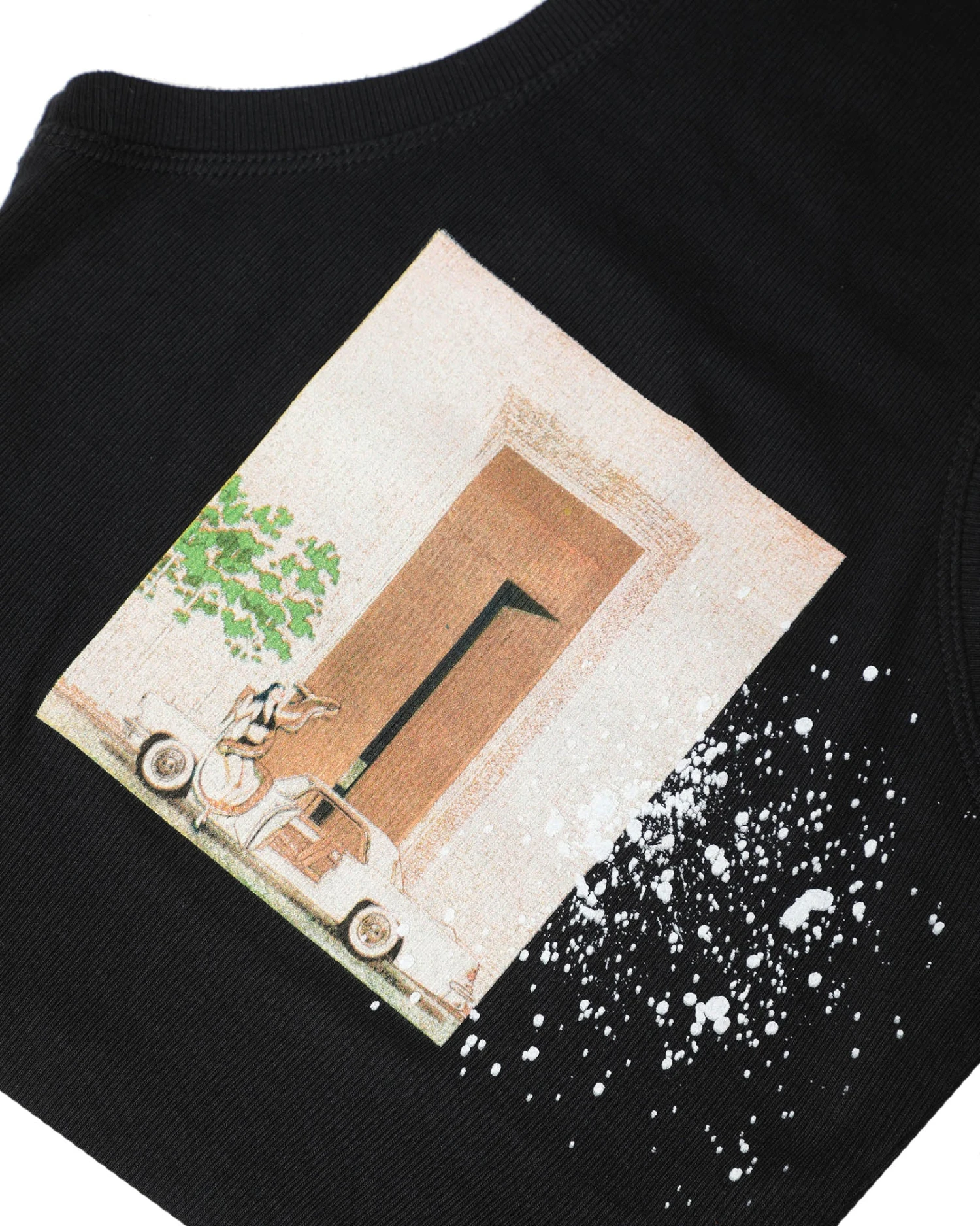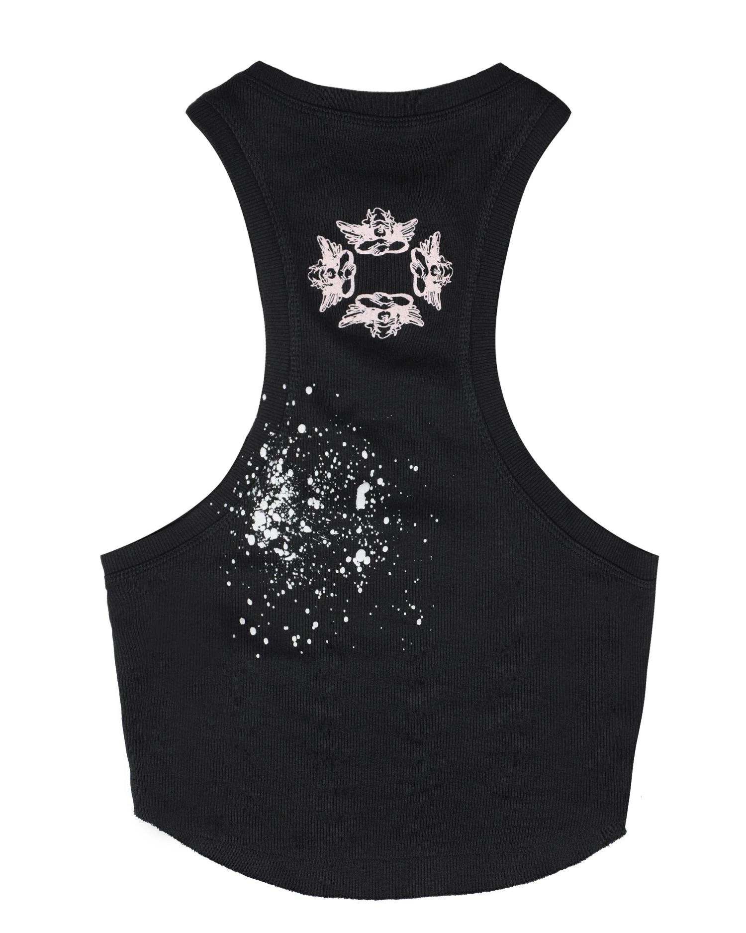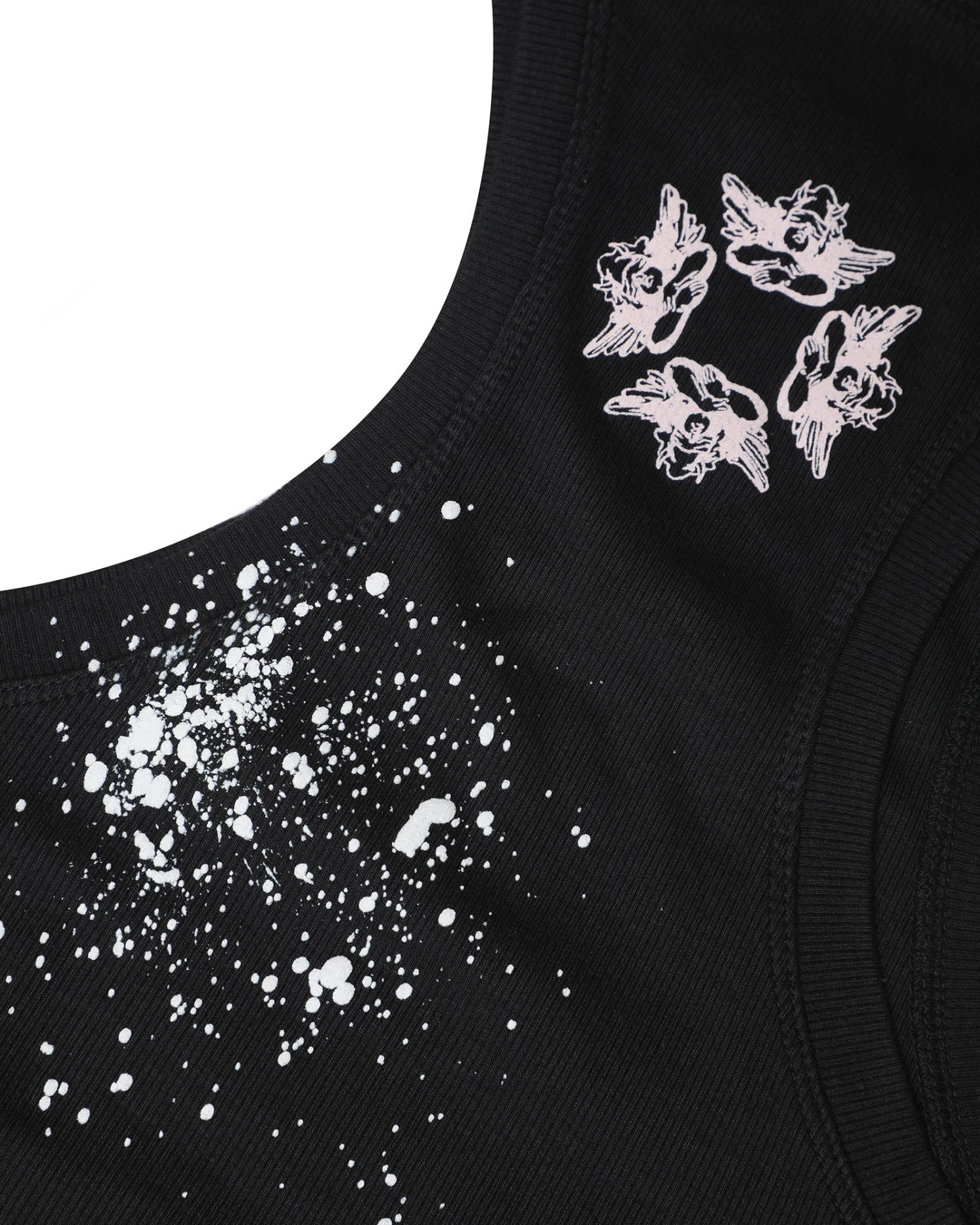 Ribbed crop tank in black. Curved hem with a raw edge and racerback neckline. Features a paint splatter design. Paint splatter may show slight variation.Â