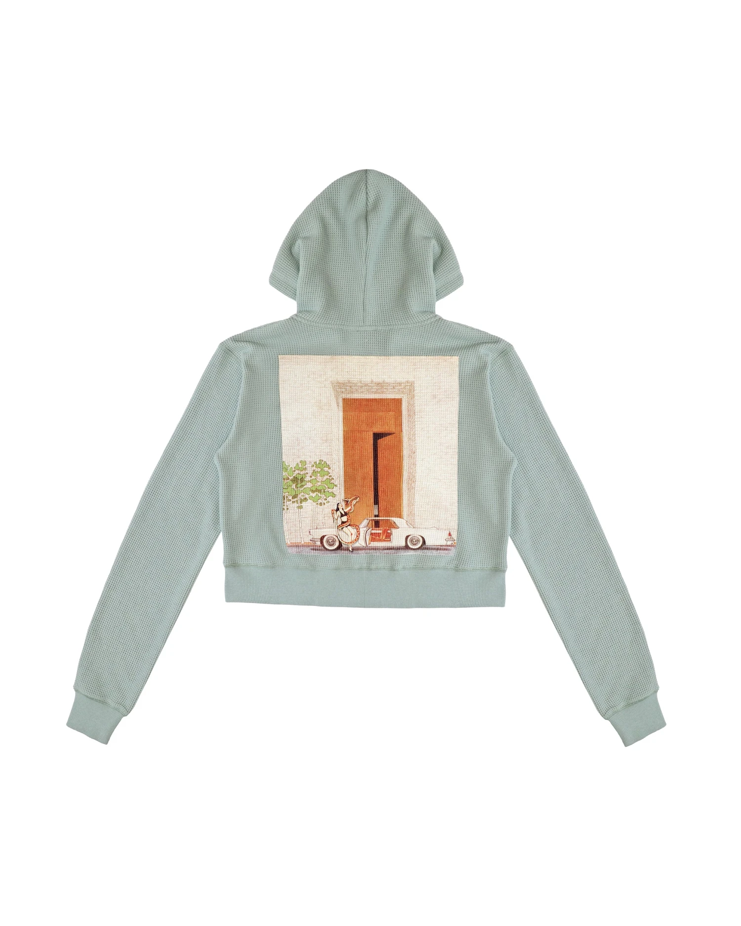 Soft thermal fabric in sage green. Zip up hoodie with cropped hem, front pockets, and embroidered front logos.