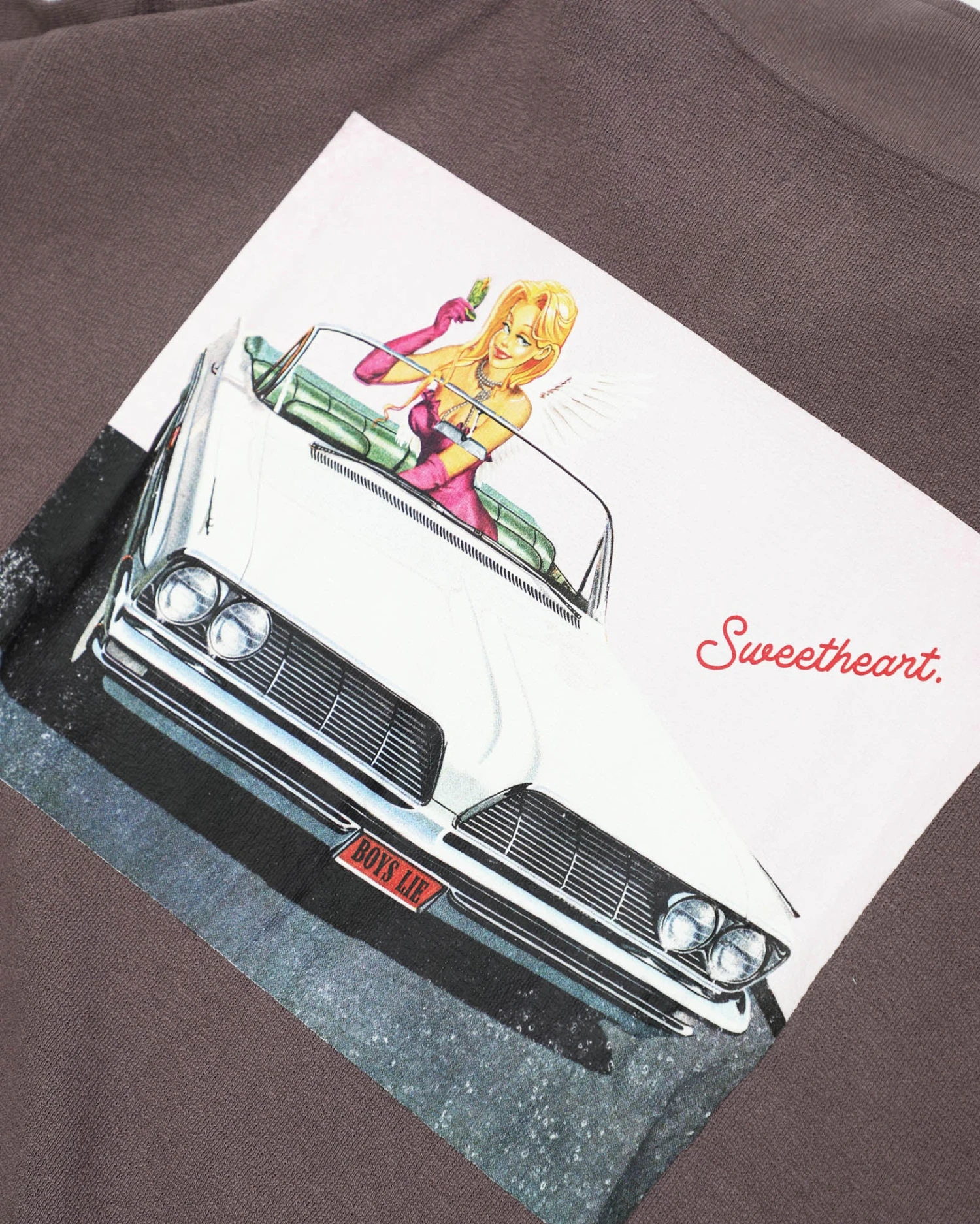 Inside out french terry fabric in dusty purple. Henley style crewneck with button details, drawstring, and ribbed cuffs and hem.Â