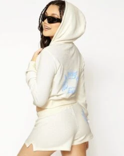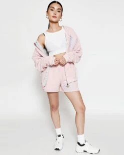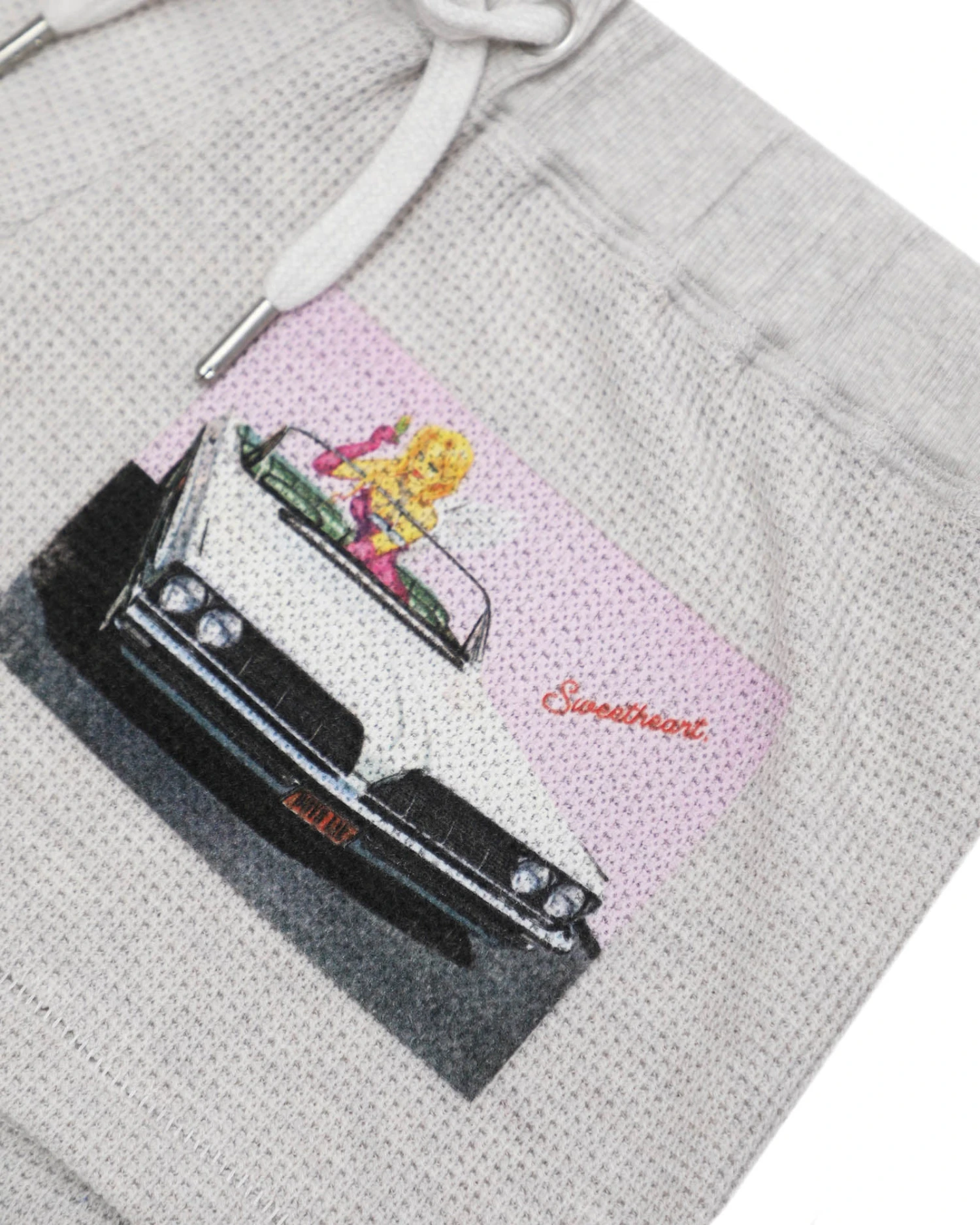 Soft thermal fabric in heather grey. Mid-rise shorts with adjustable drawstring and a puff print logo. Â