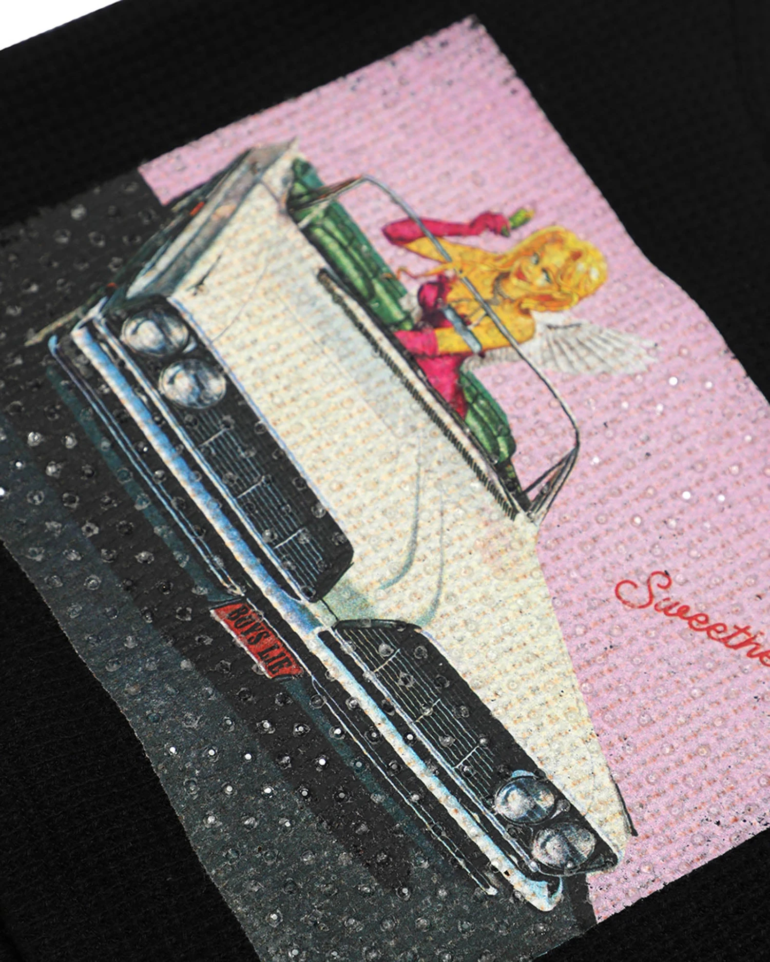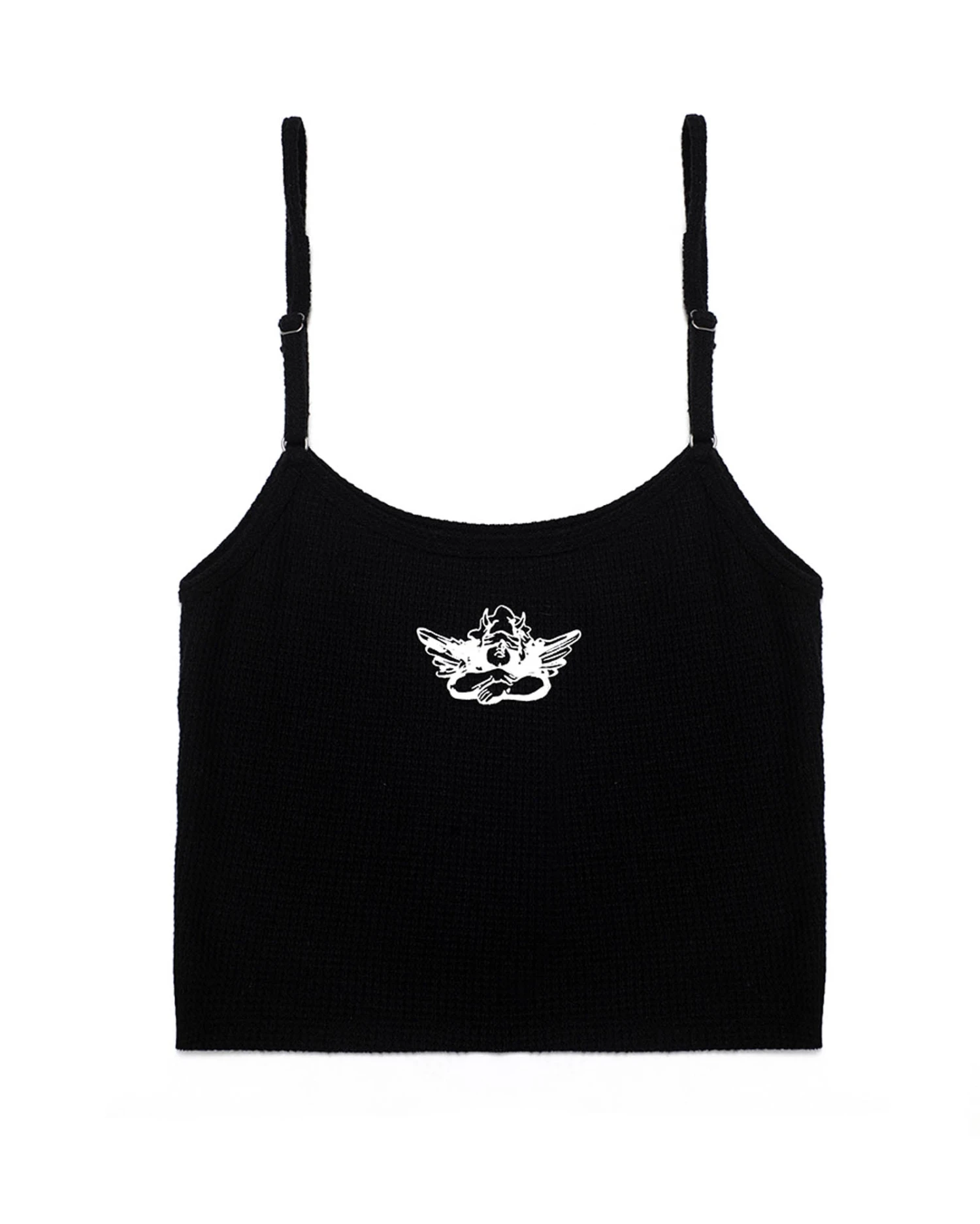 Soft thermal crop tank in black with adjustable straps and rhinestone embellishments.Â
