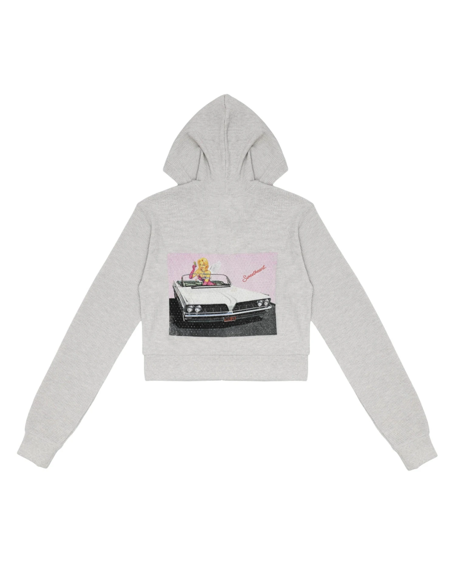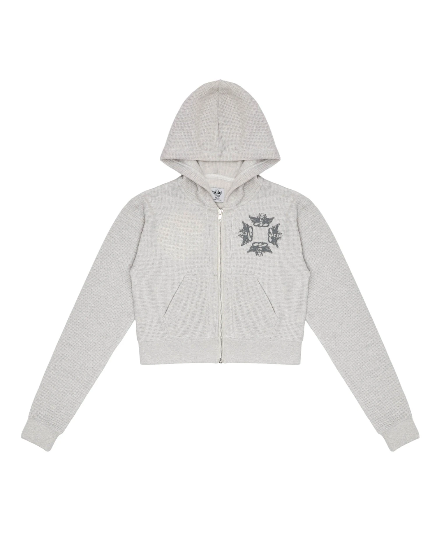 Soft thermal fabric in heather grey. Zip up hoodie with cropped hem, front pockets, and ribbed cuffs. Features puff print logos and rhinestone embellishments.