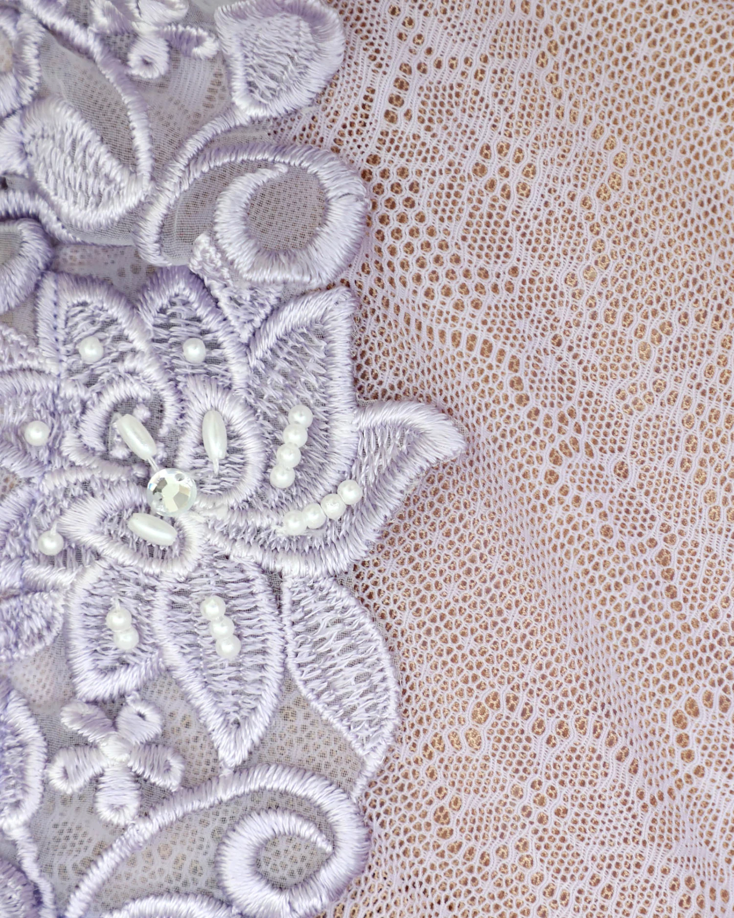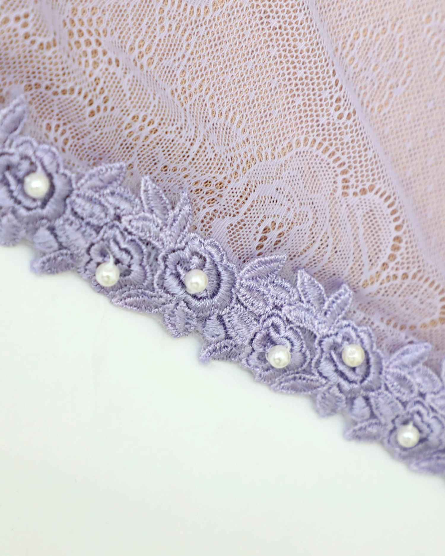High waisted sheer lace pants. Flared hem, beaded and lace trims, elastic waistband, nude mesh lining. Has stretch throughout.Â