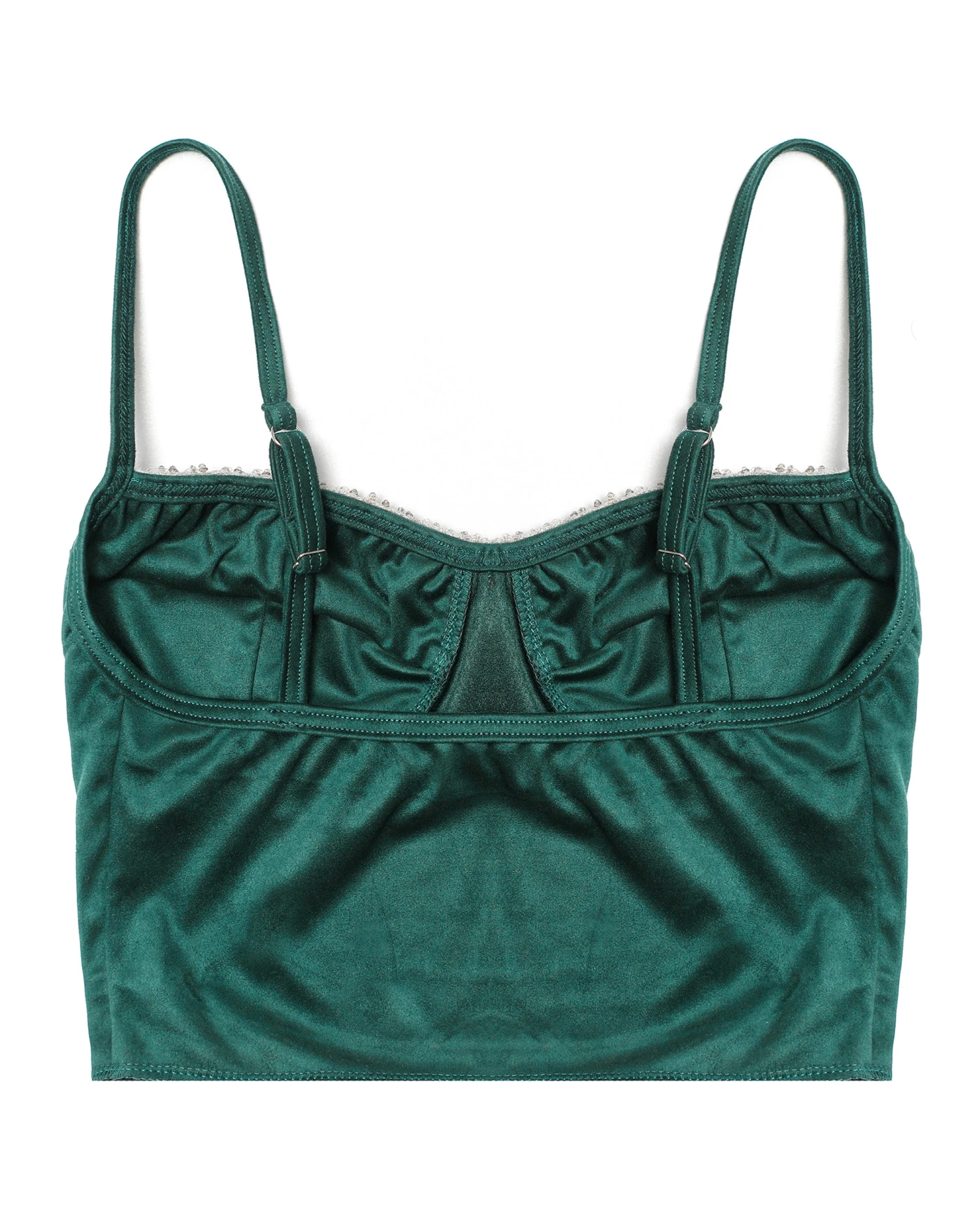 Poly suede bustier in green with lace trim. Printed “BL”, cropped hem, seam details, and adjustable straps.Â
