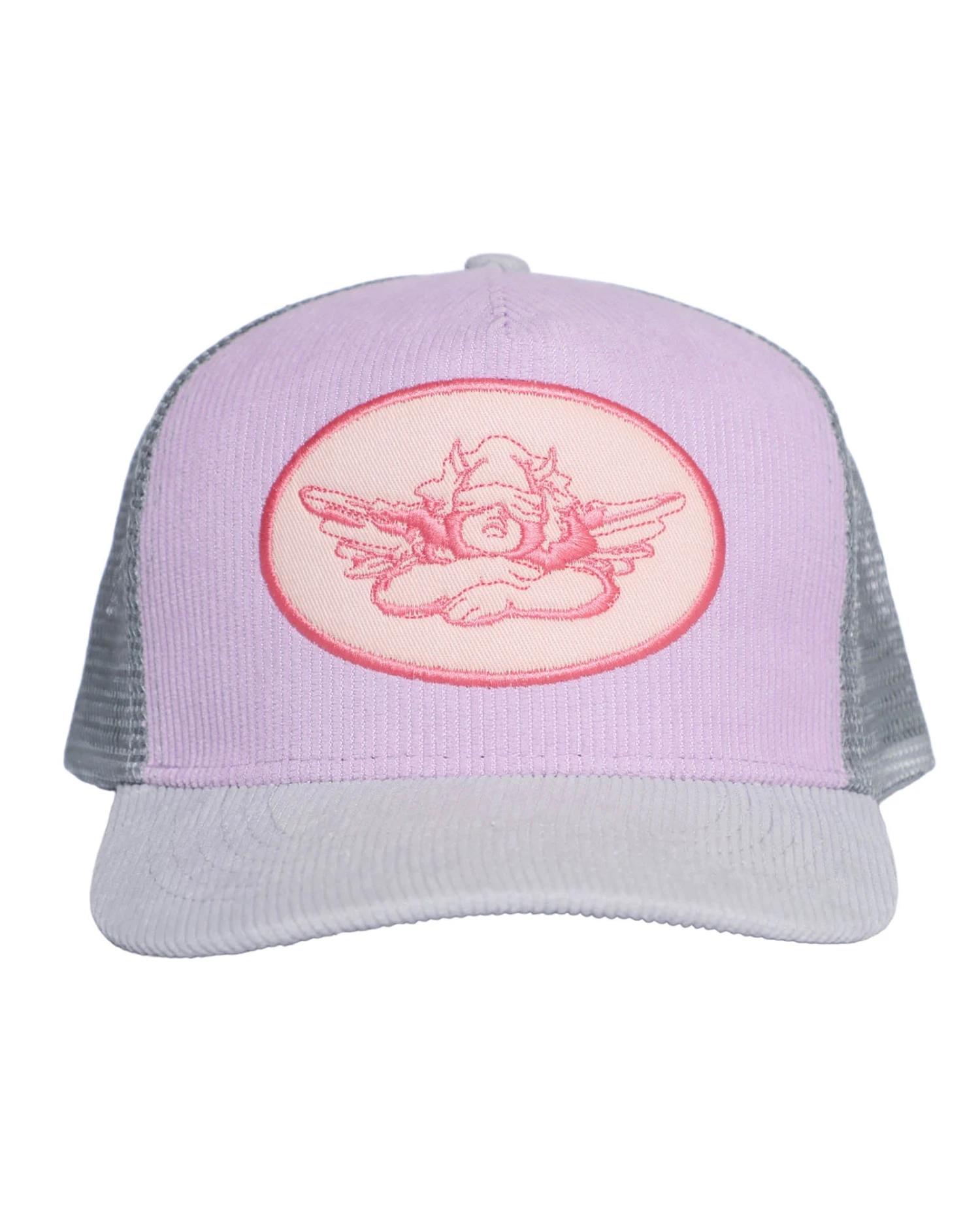 Grey trucker hat with pink patch and lavender corduroy. Adjustable snapback.Â