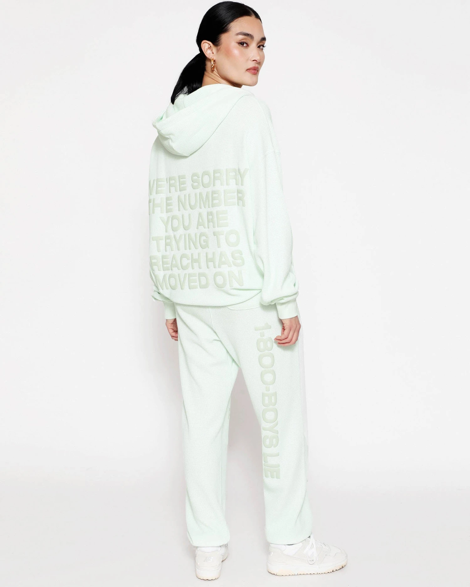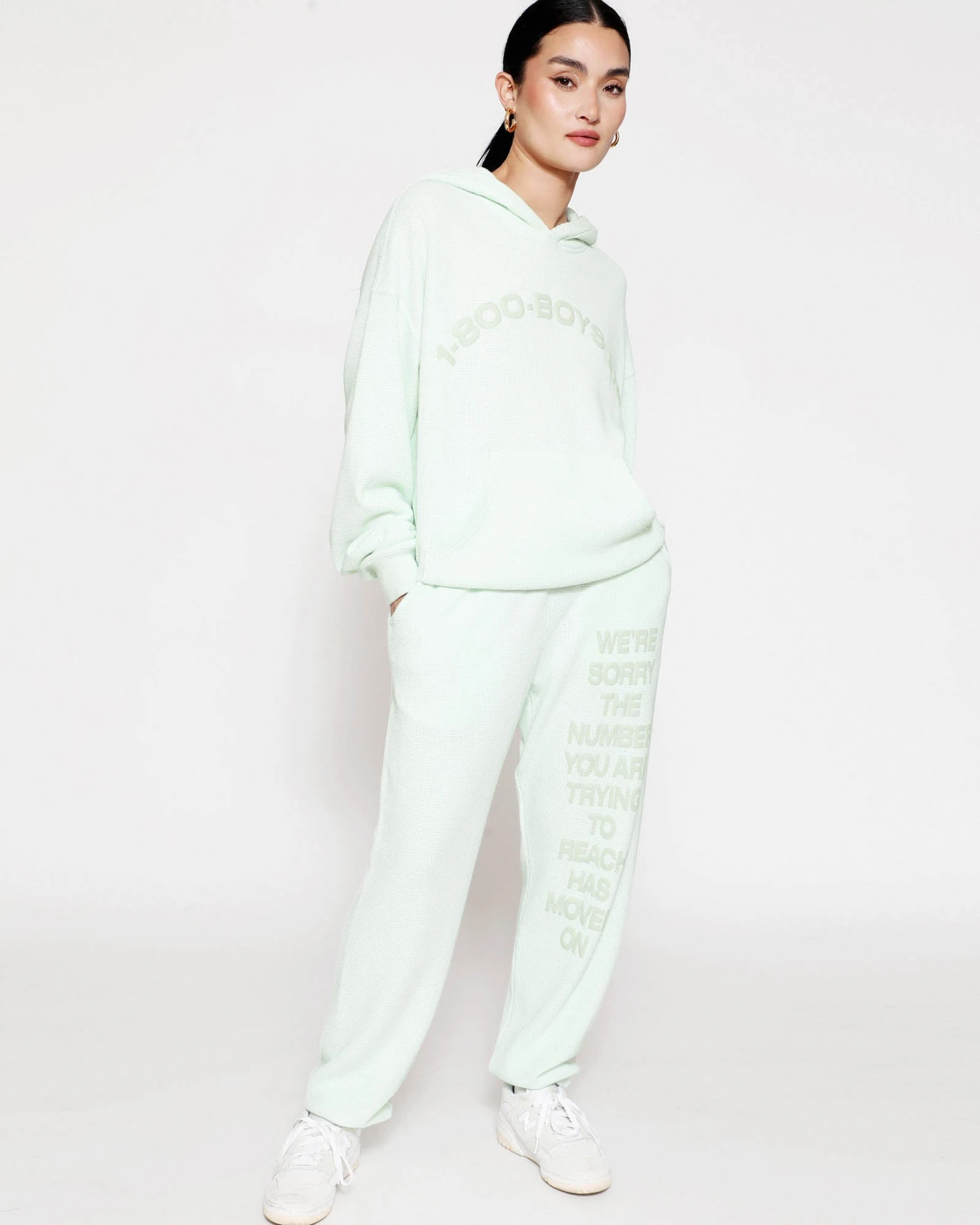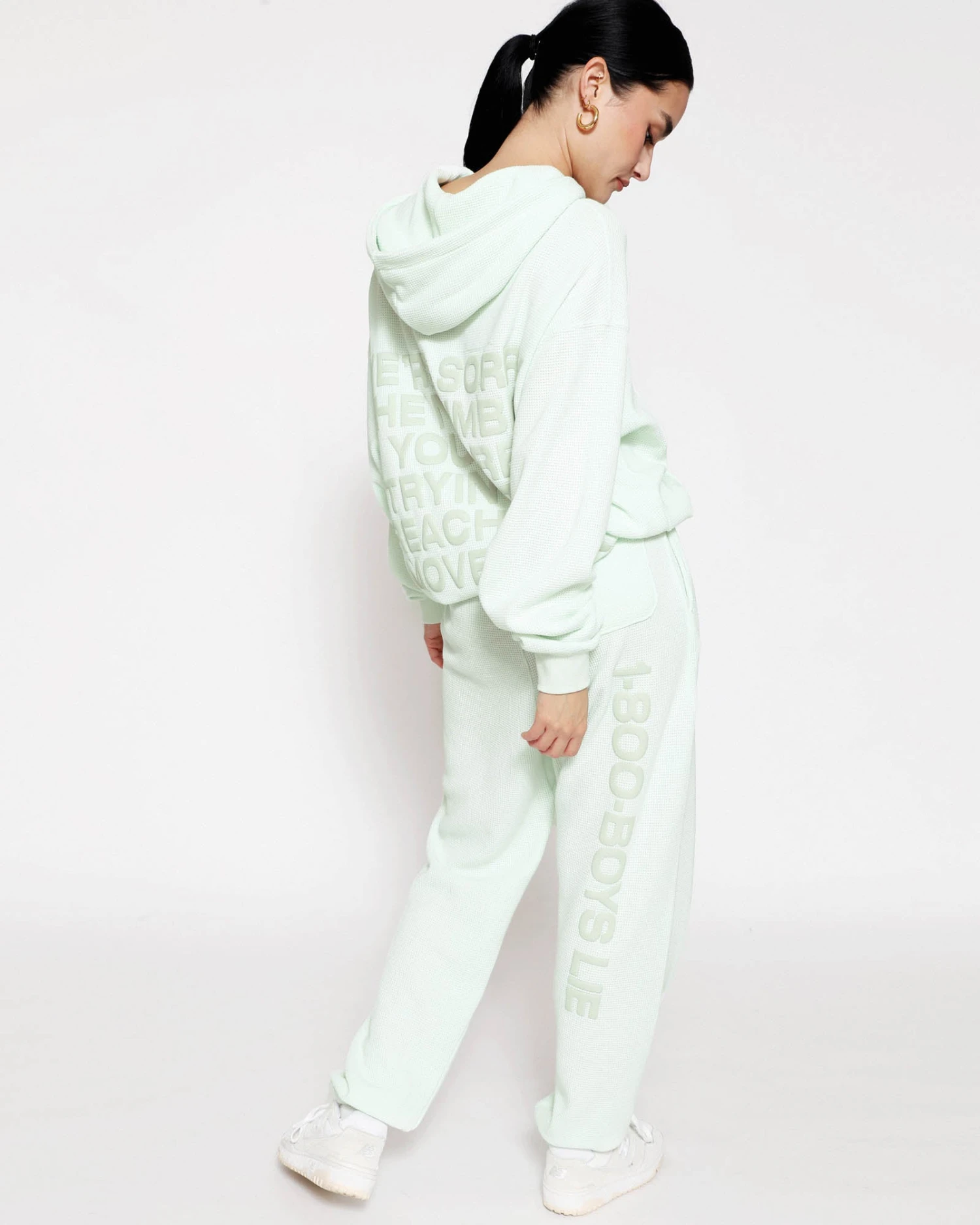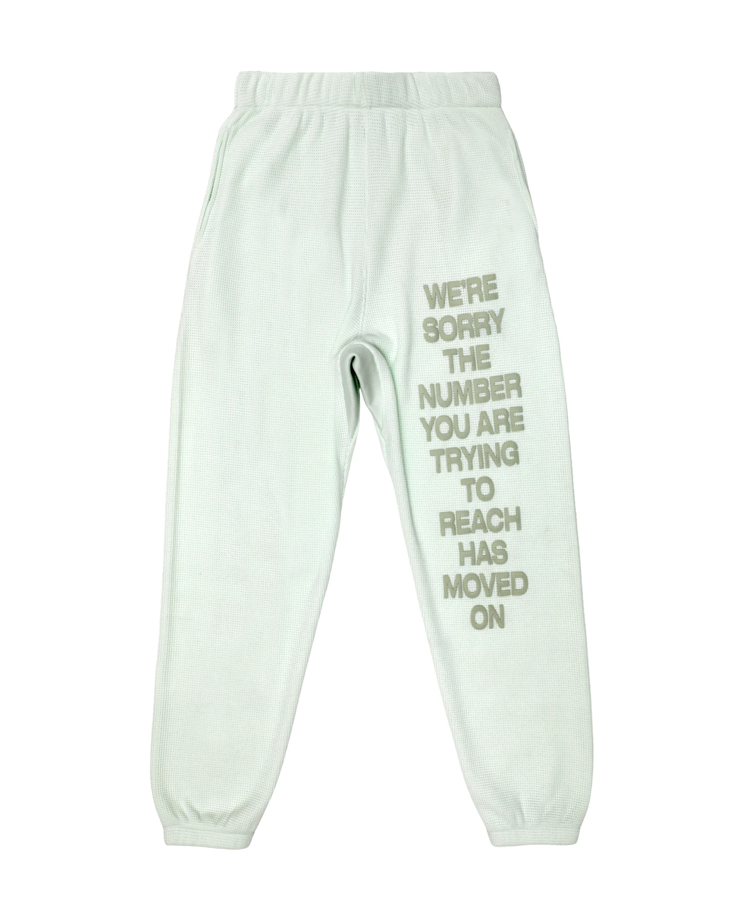 Soft thermal fabric in a soft green. High rise sweatpants with back and side pockets, elastic waistband and cuffs. Features puff print graphics.