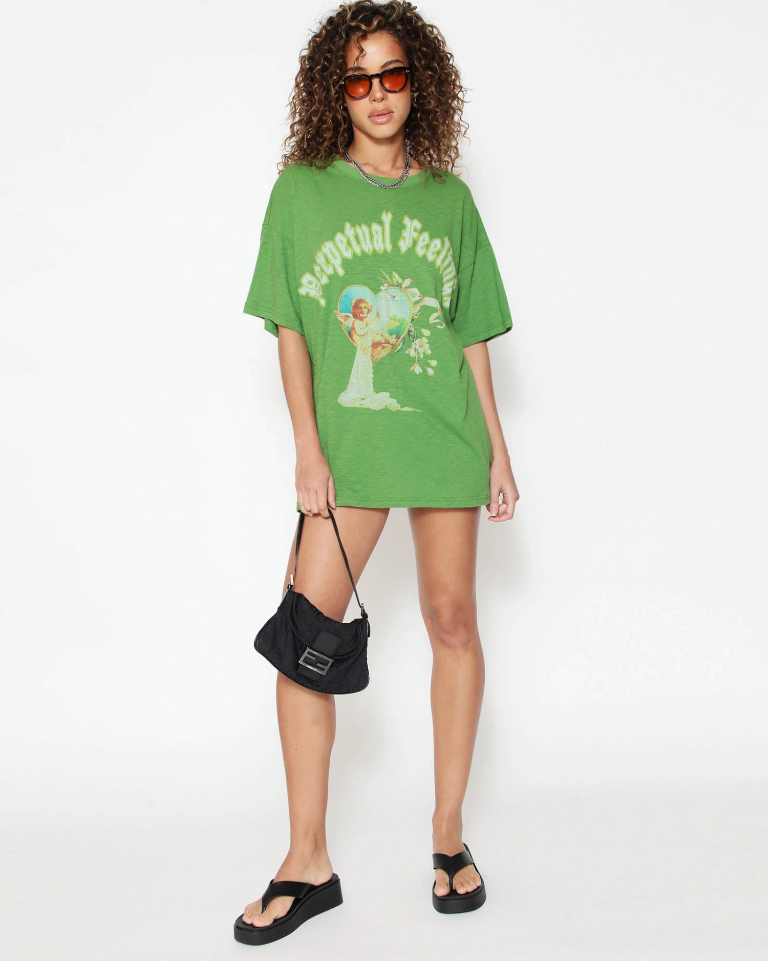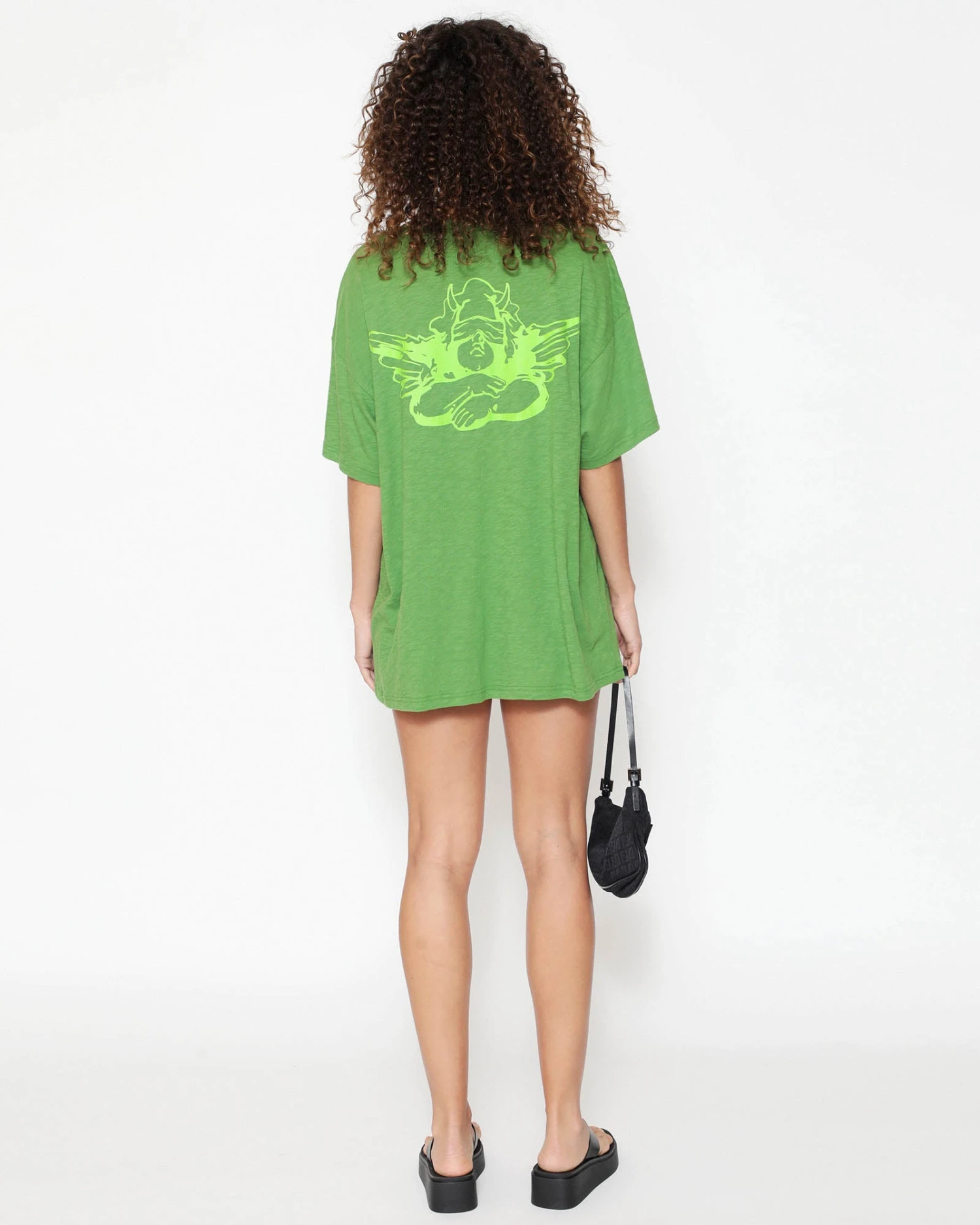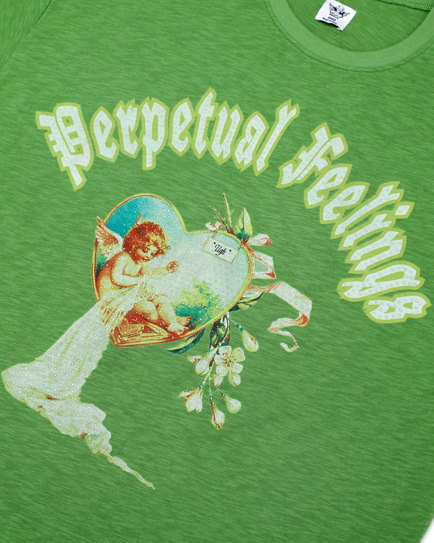 Lightweight and slightly sheer green tee in cotton slub jersey with an oversized fit. Features rhinestone embellishments.Â