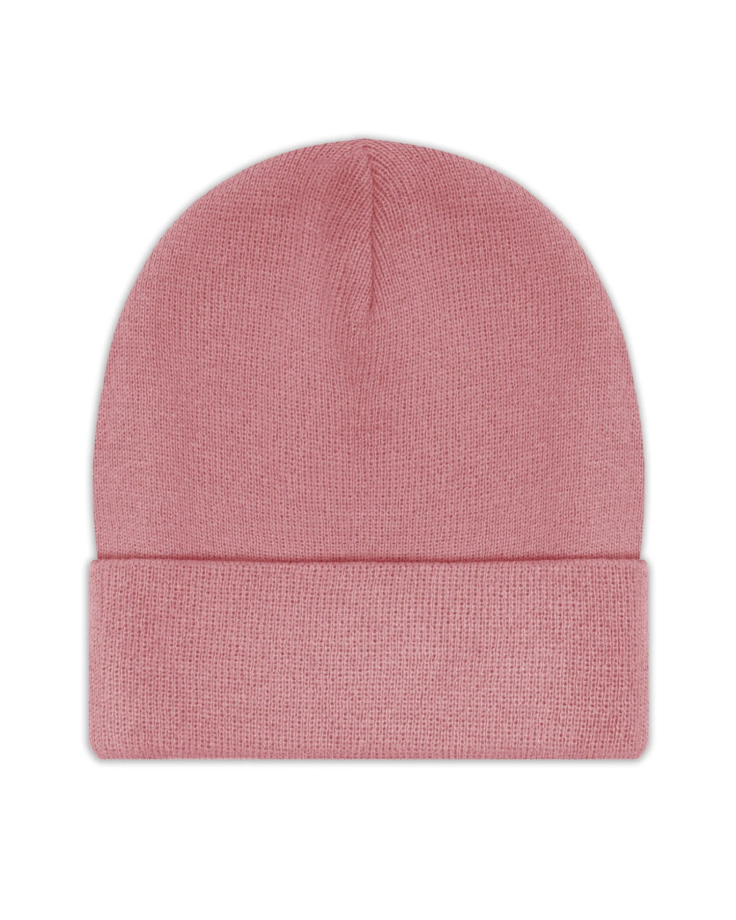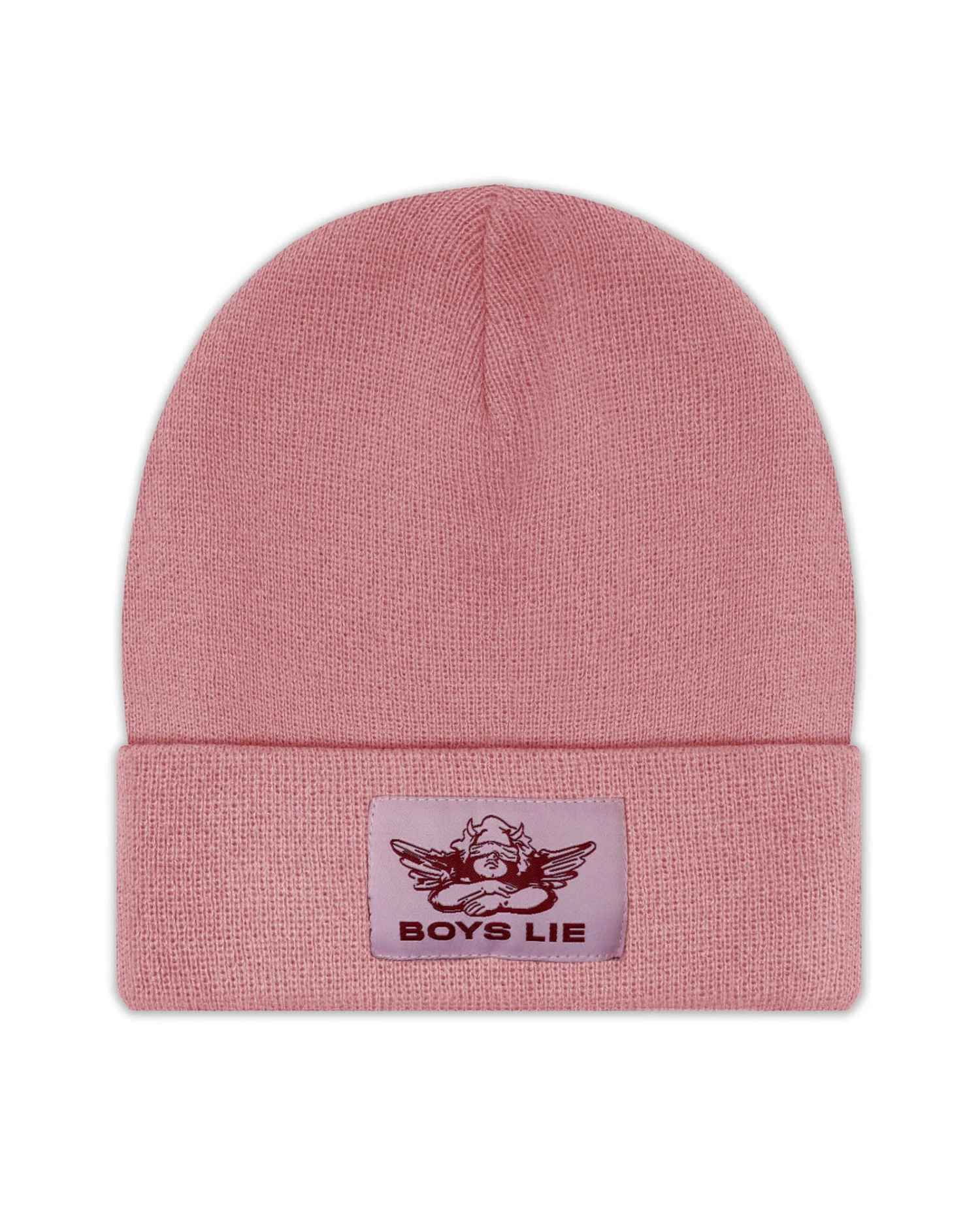 Dusty pink beanie with mauve Boys Lie logo patch.