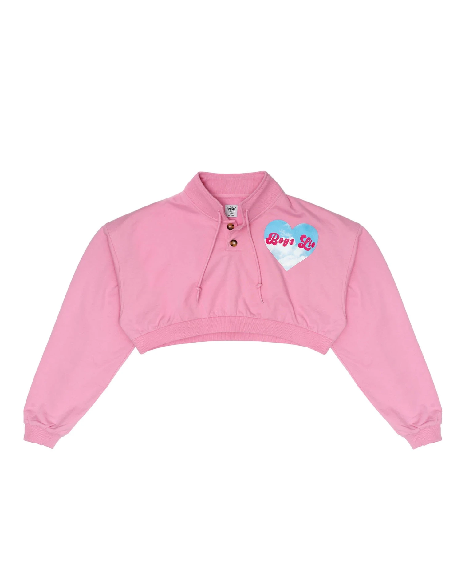 Lightweight fleece fabric in pink. Henley style cropped crewneck with buttons, drawstring, and ribbed cuffs and hem.