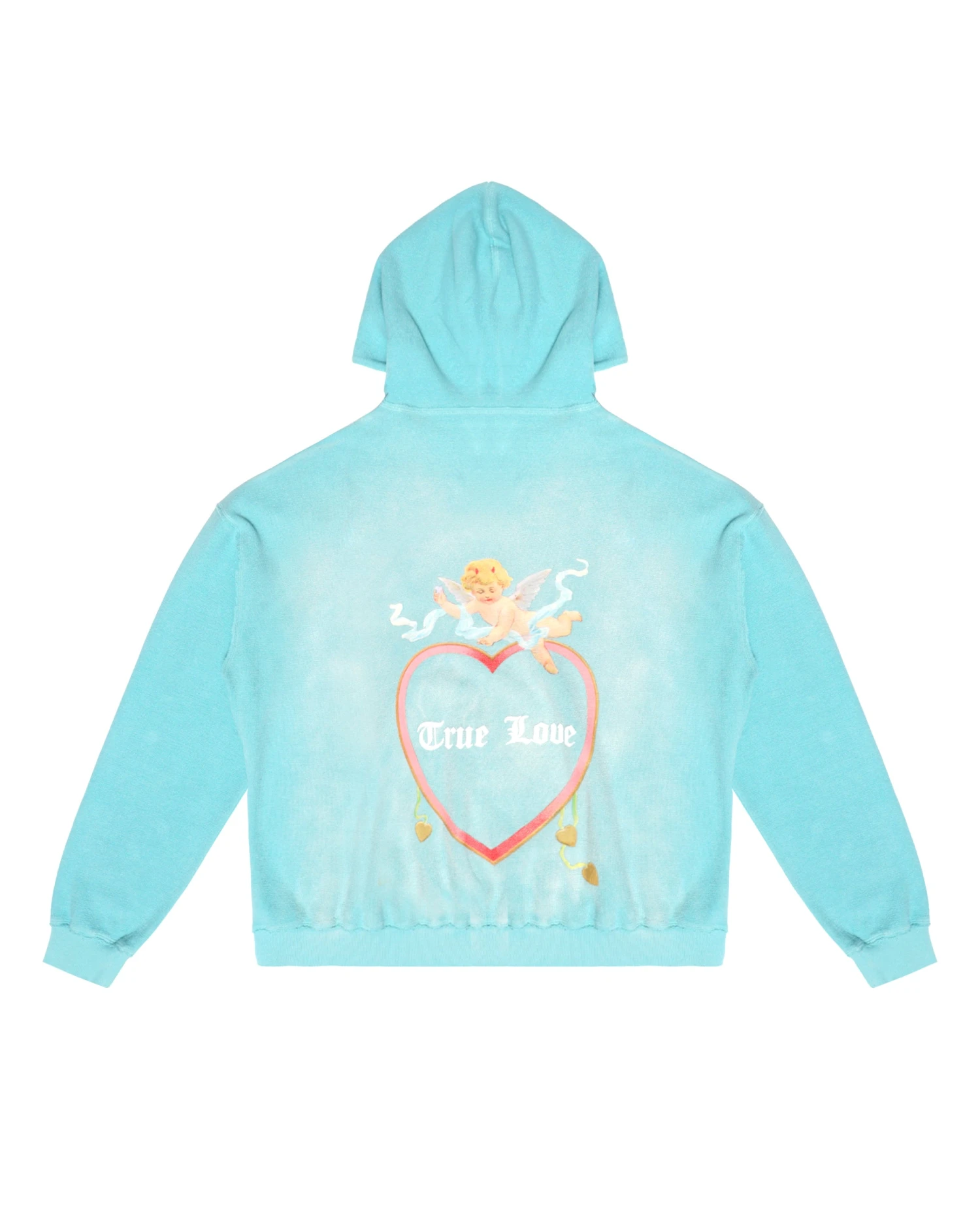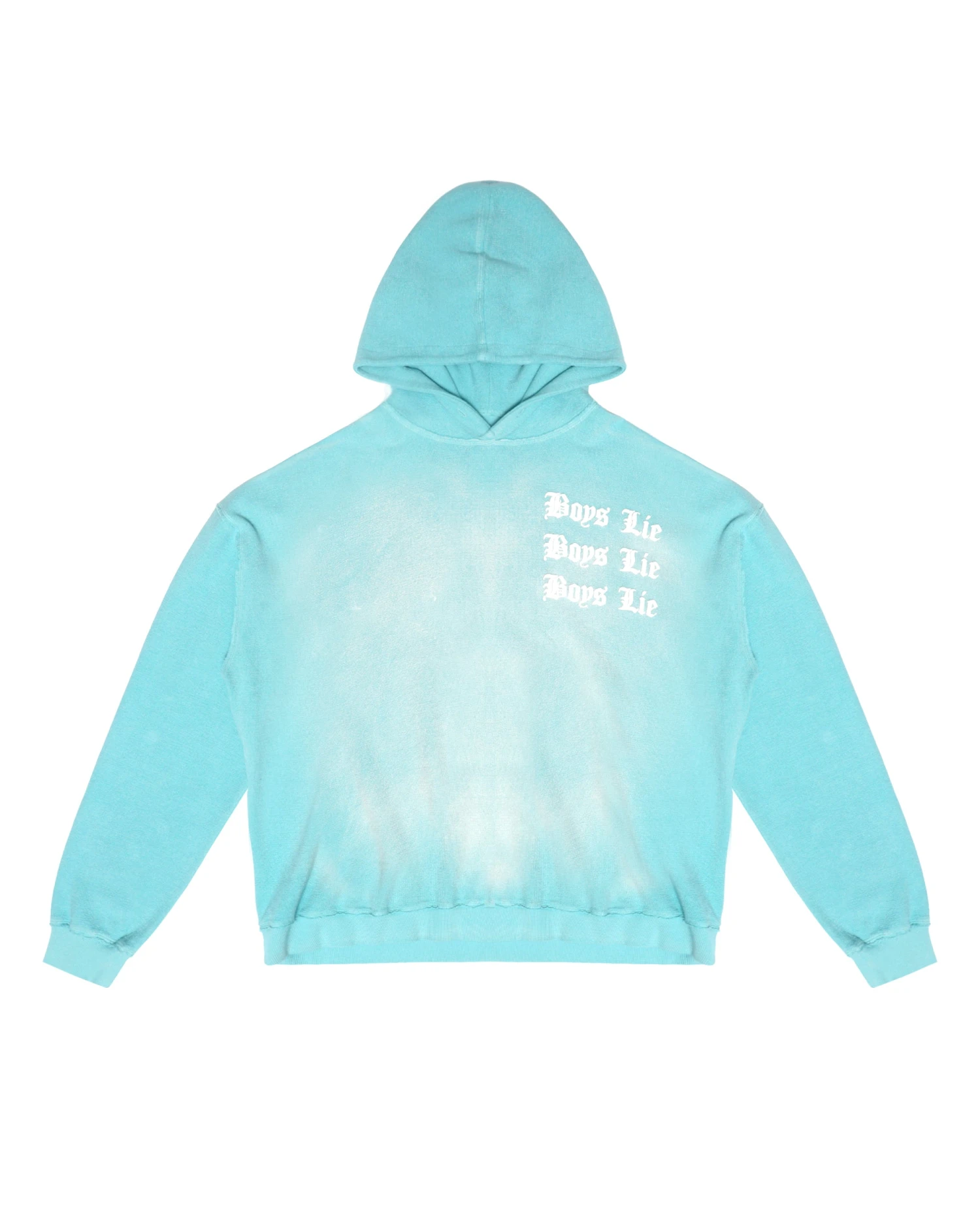 Inside out french terry fabric in teal with potassium dye treatment. Oversized hoodie featuring a dramatic hood and front and back printed graphics.