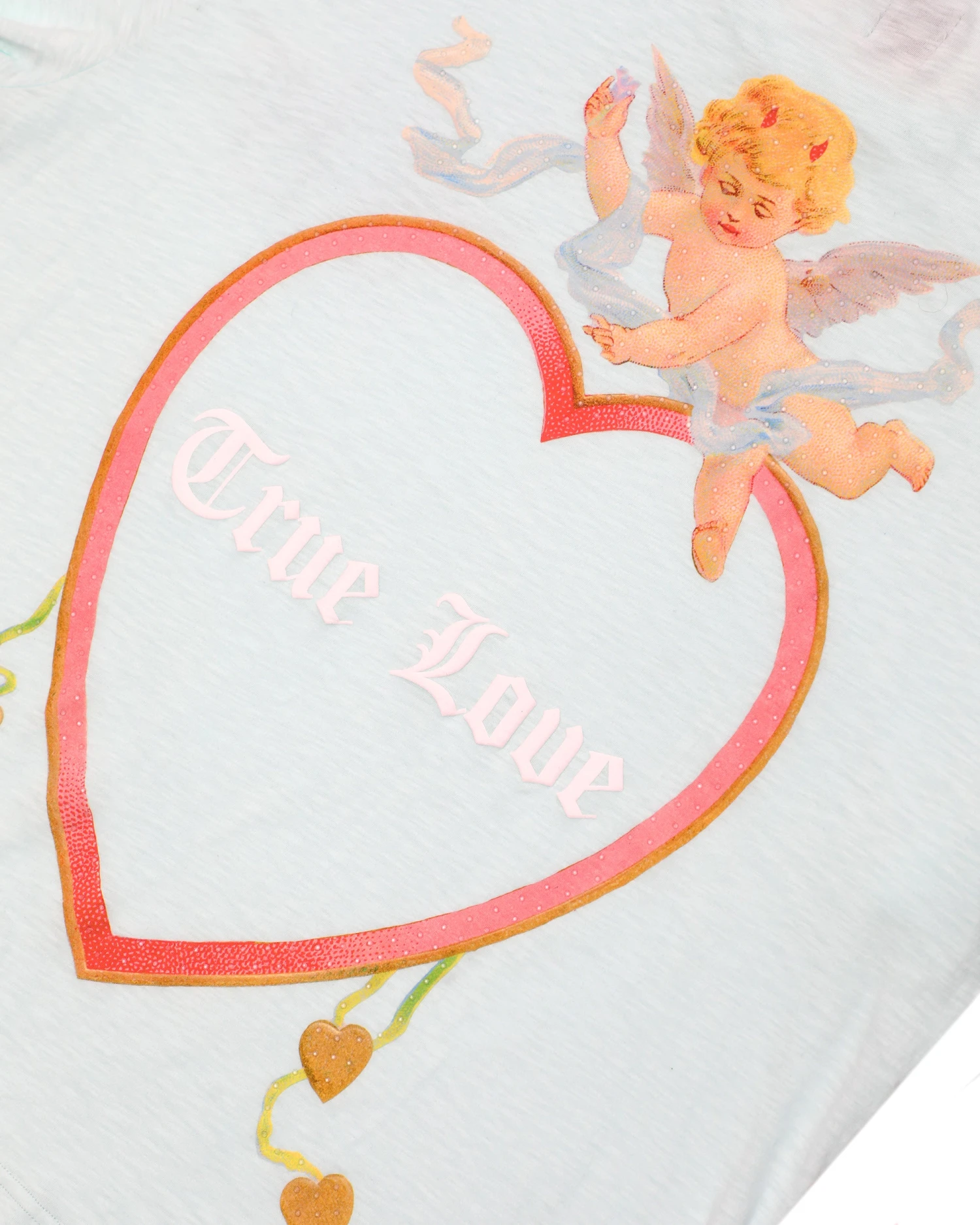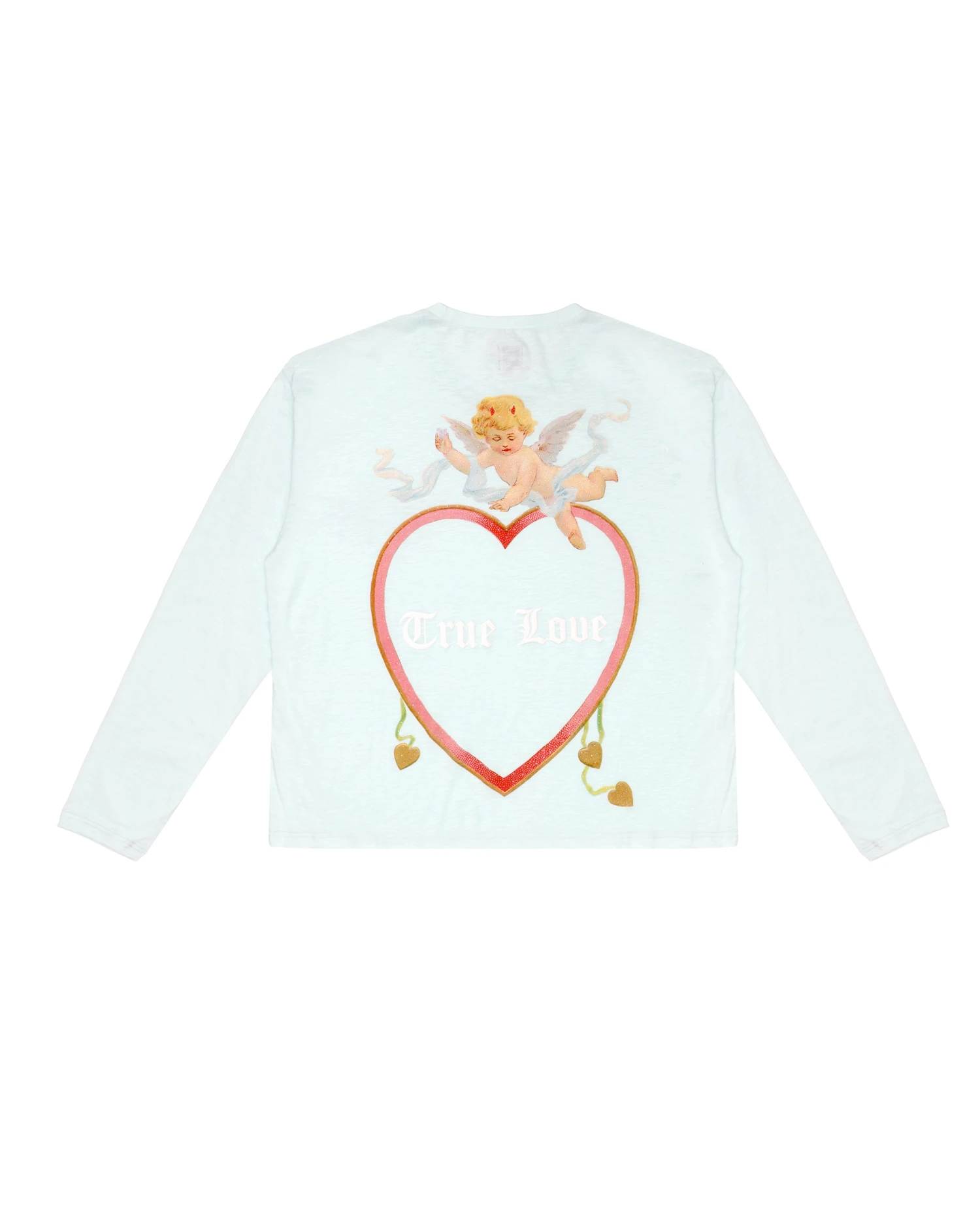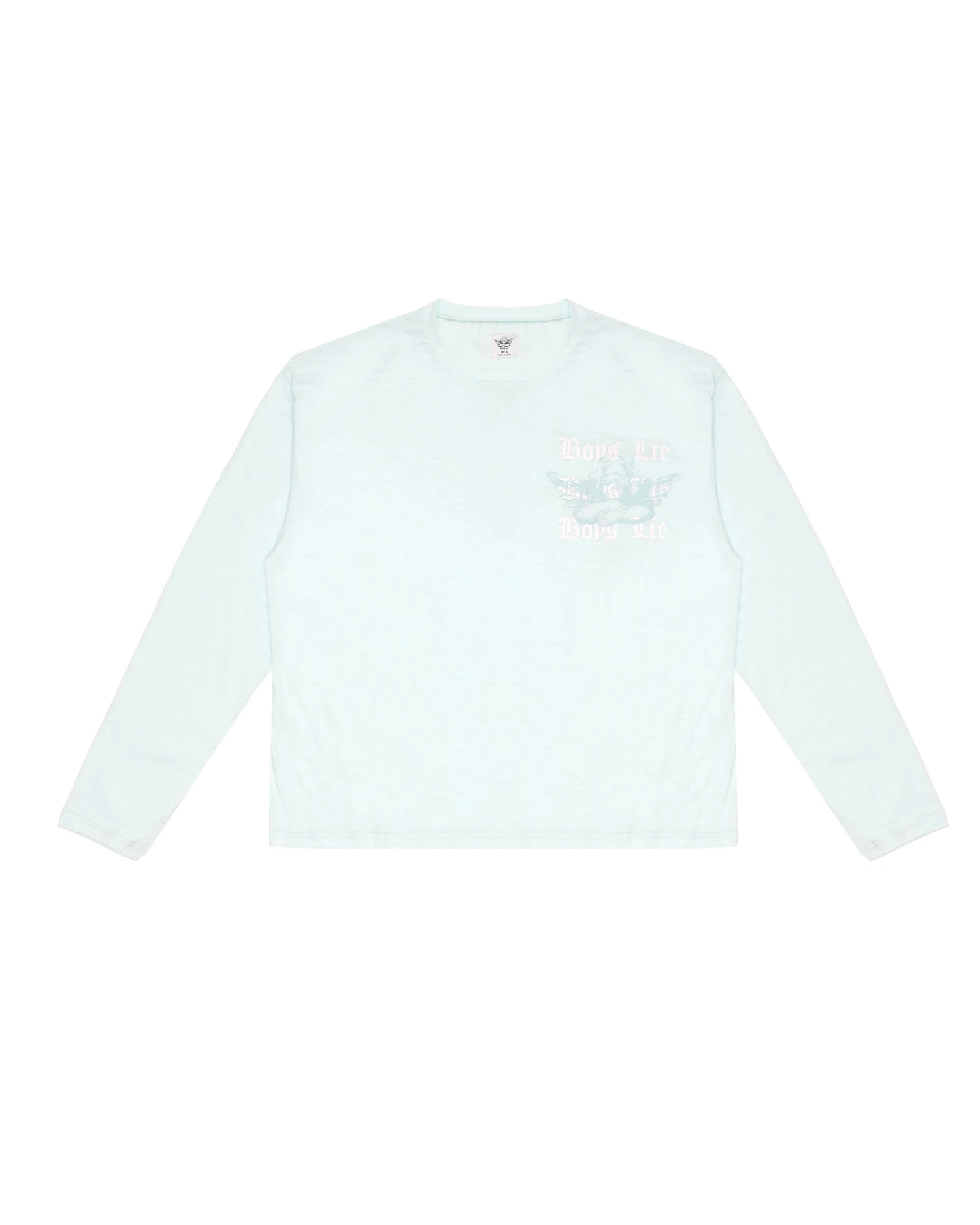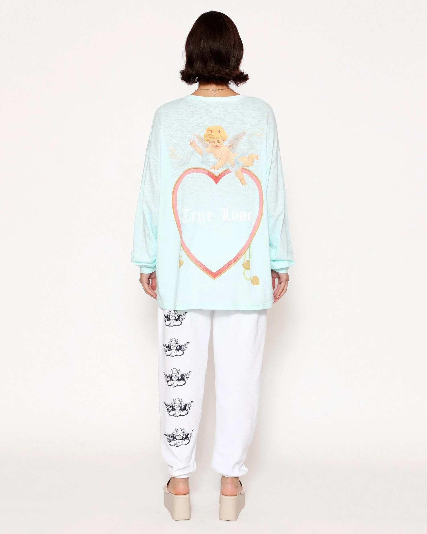 Oversized long sleeve tee in teal. Printed front and back graphic with rhinestone embellishments.