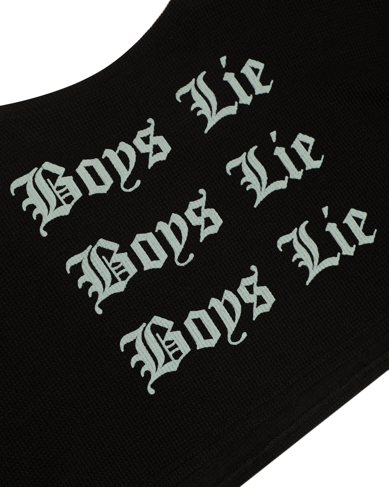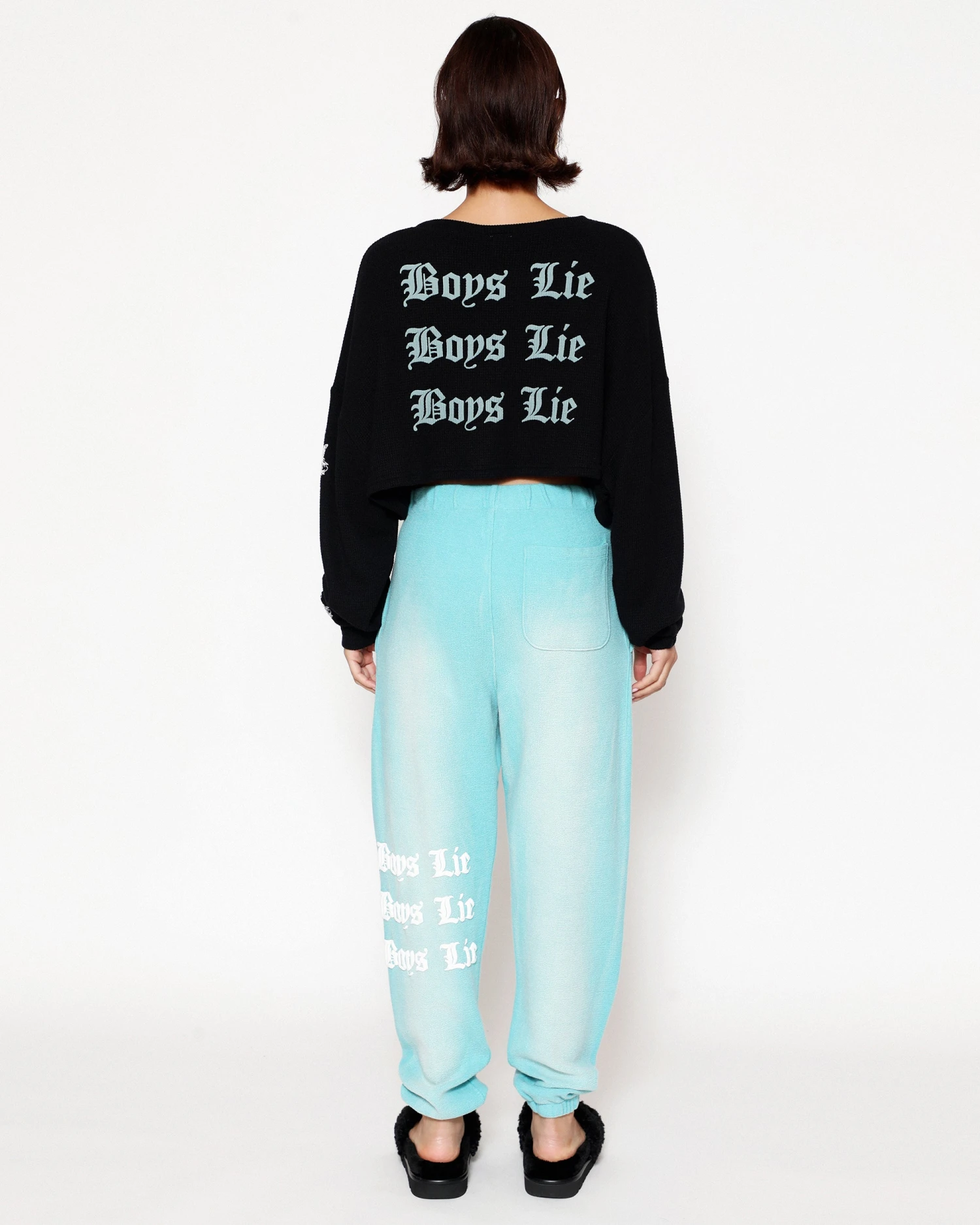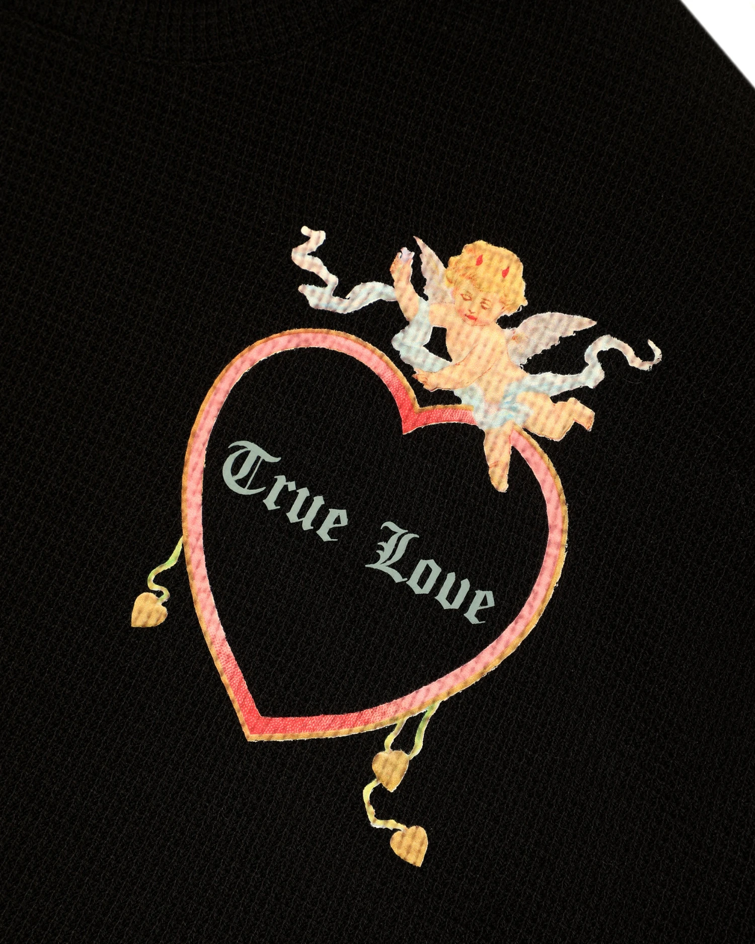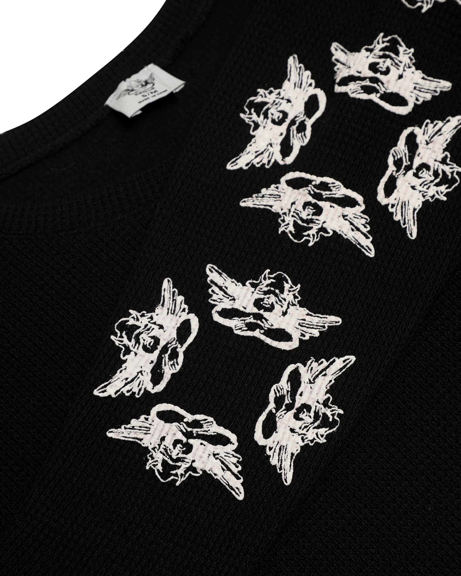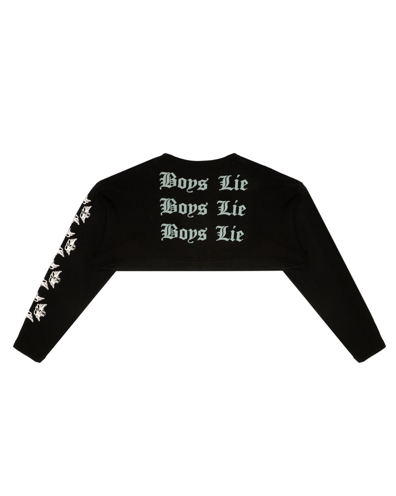 Oversized cropped longsleeve in black. Printed graphics on front, back, and sleeves.