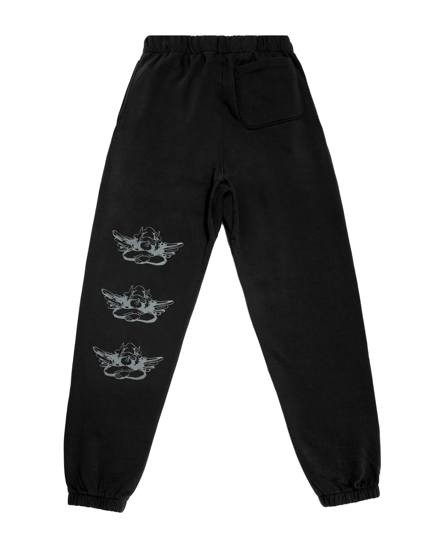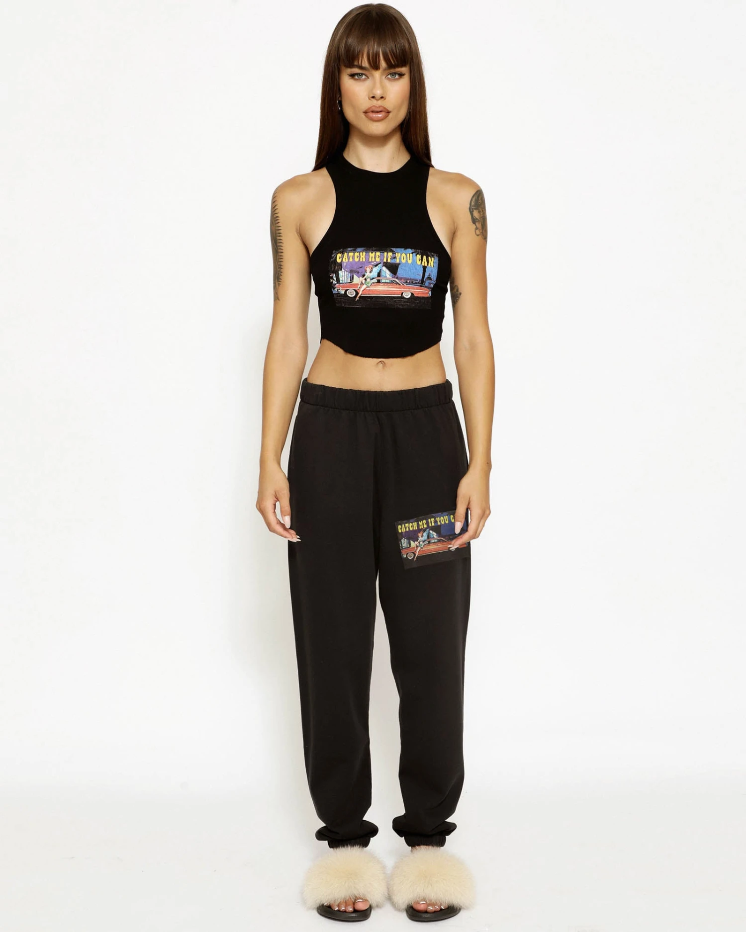 Mid-weight fleece fabric in black. High rise sweatpants with back and side pockets, elastic waistband and cuffs.