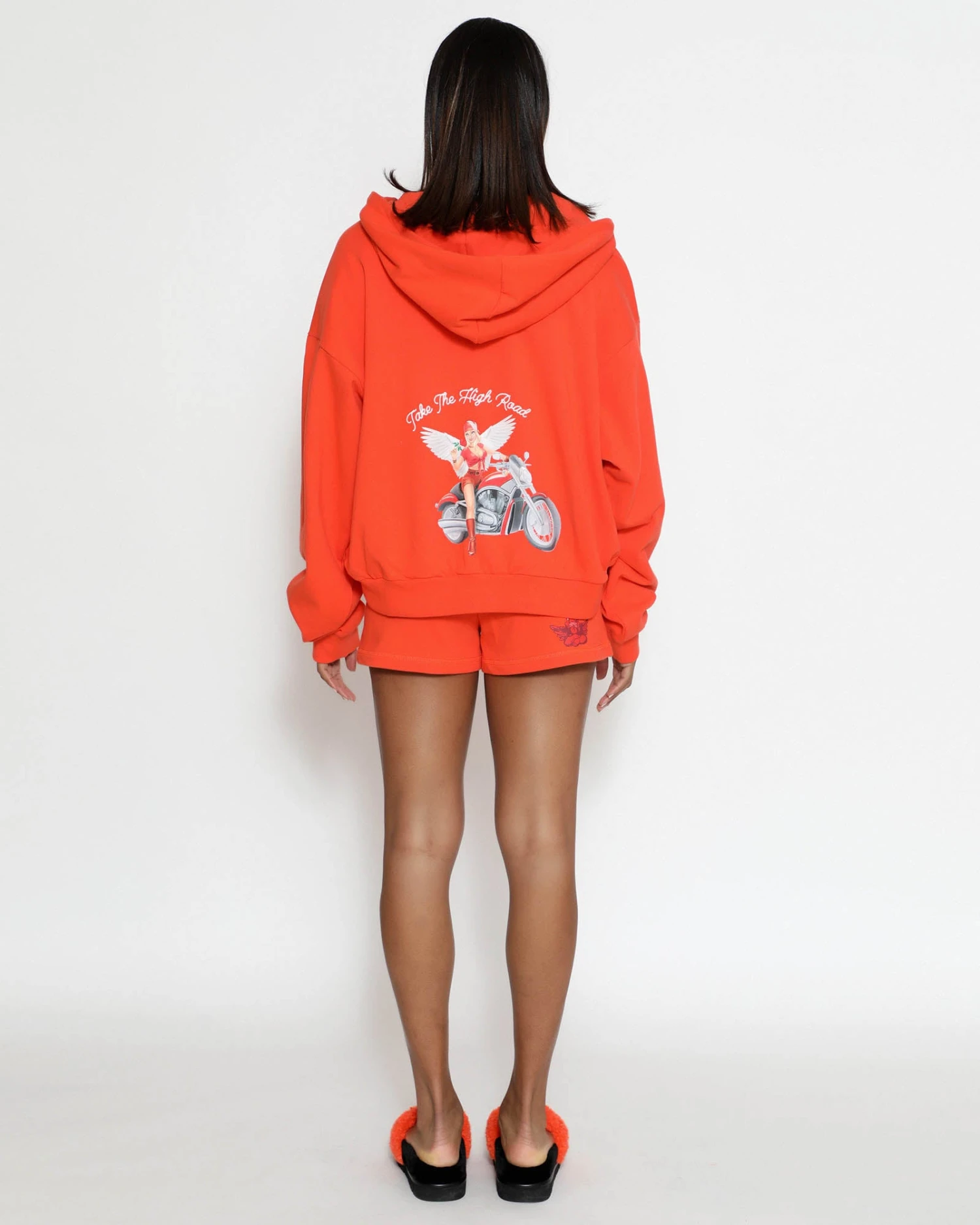 Lightweight french terry fabric in reddish orange. Mid-rise shorts with adjustable drawstring.Â