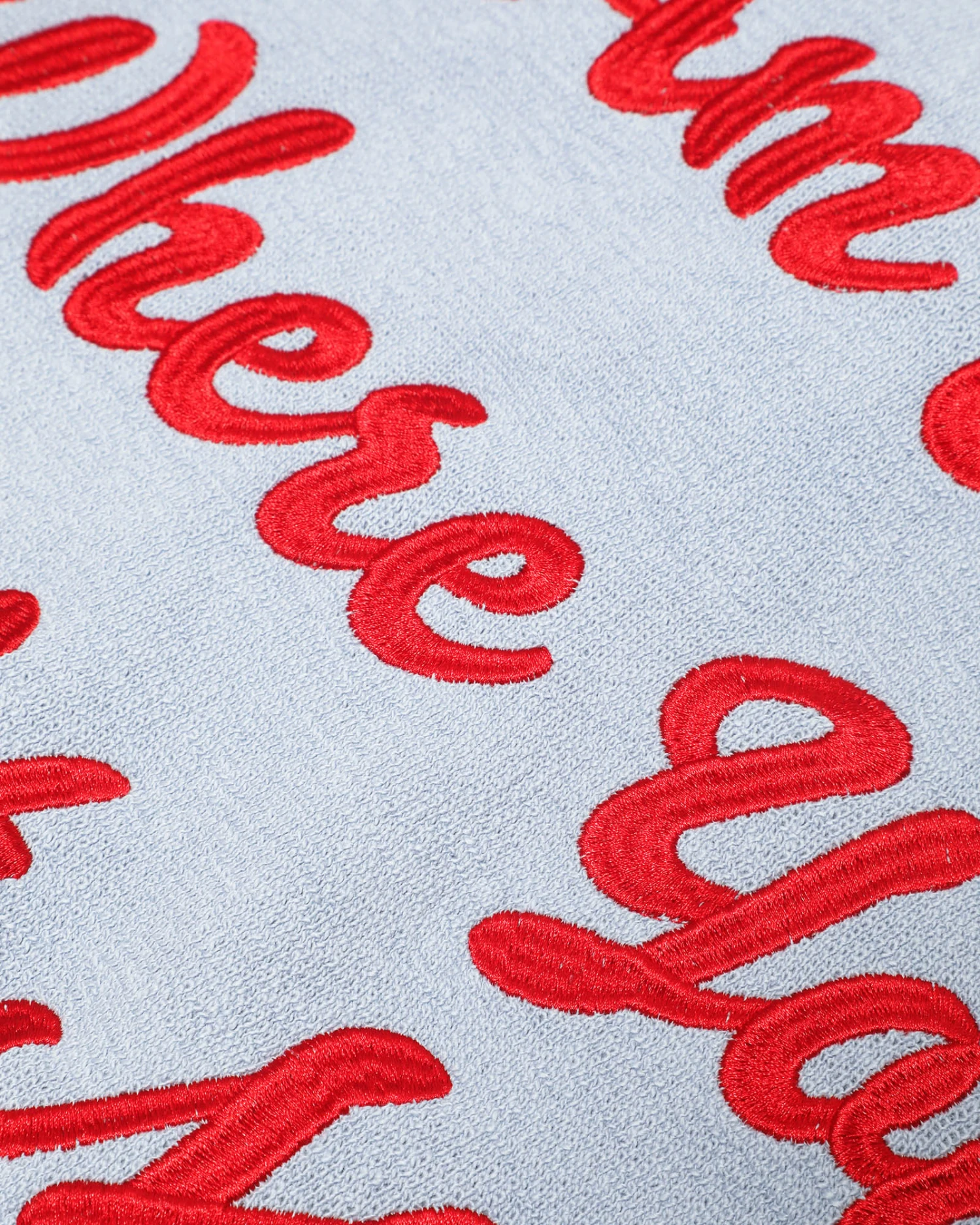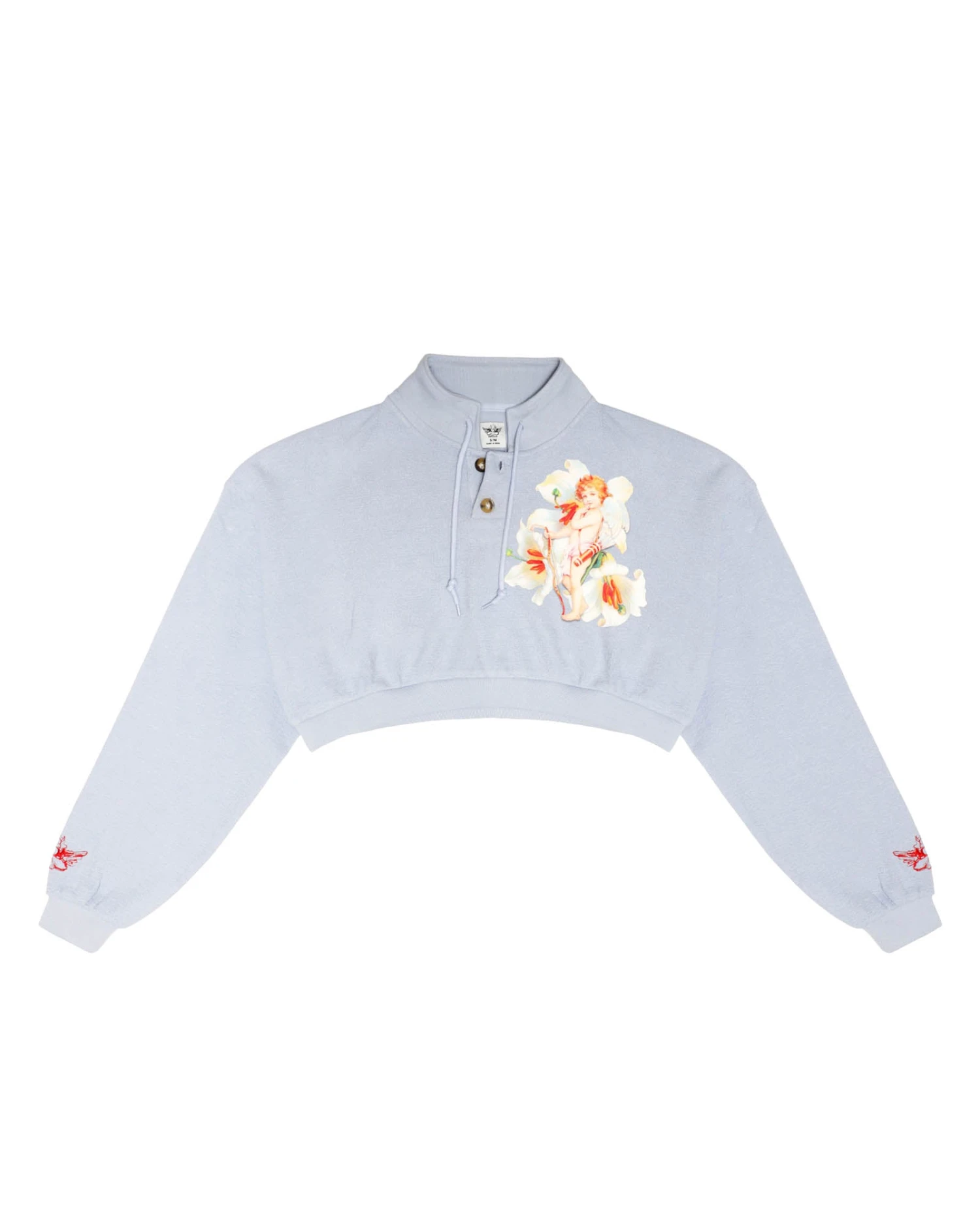 Inside out french terry fabric in blue. Henley style cropped crewneck with button details, drawstring, and ribbed cuffs and hem. Featured embroidery throughout.