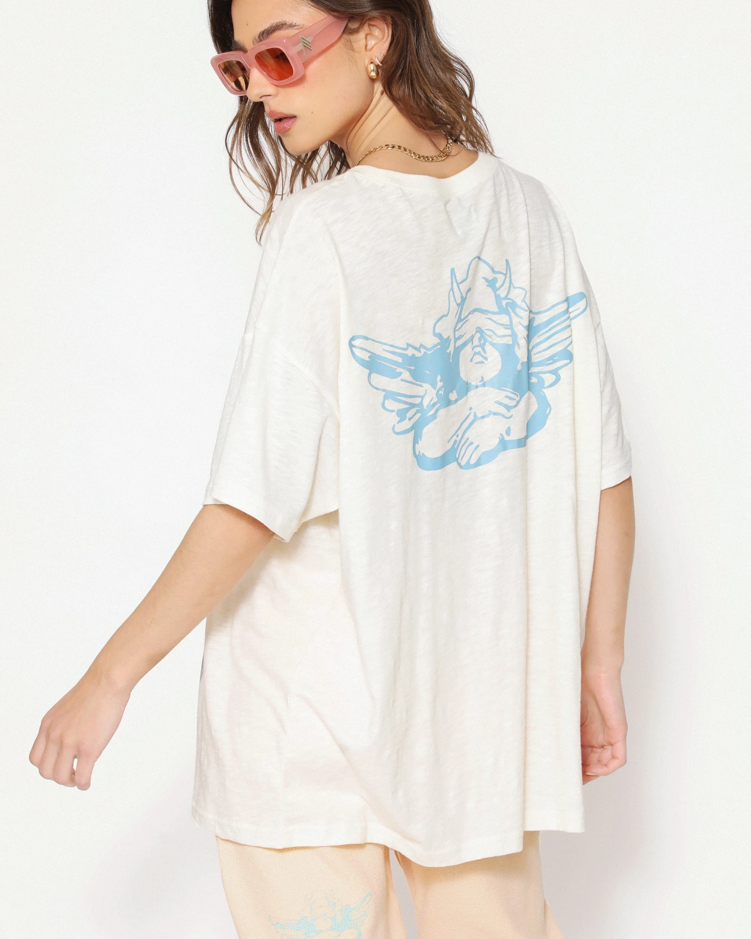 Lightweight and slightly sheer cream tee in cotton slub jersey with an oversized fit. Features embroidery.