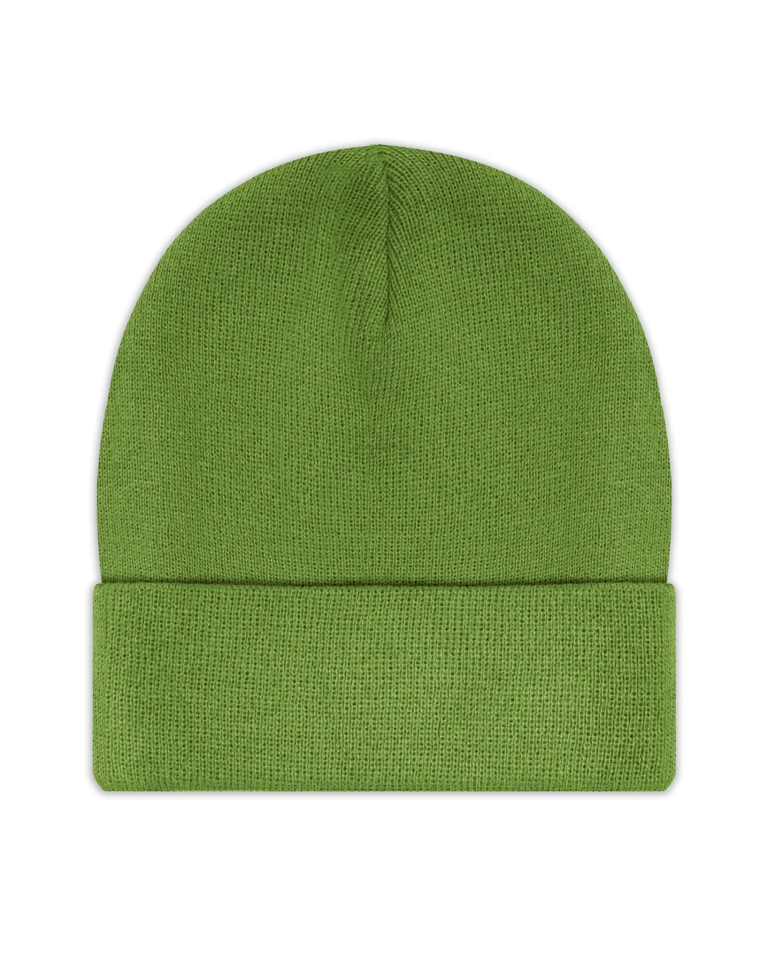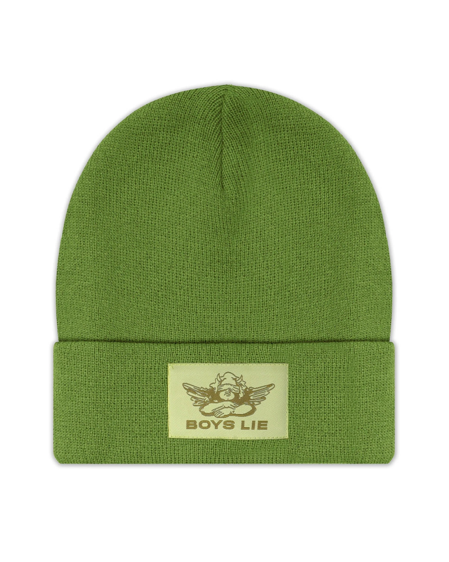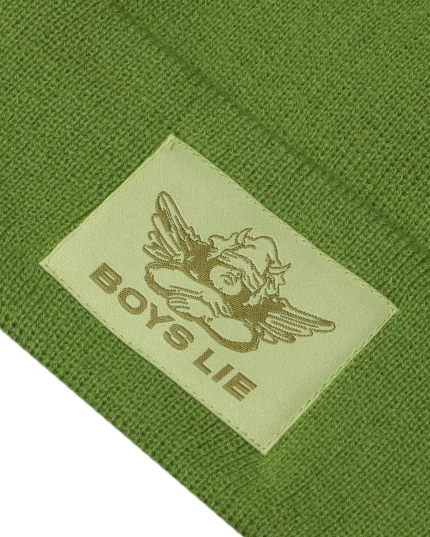 Light olive green beanie with monochromatic green Boys Lie logo patch.