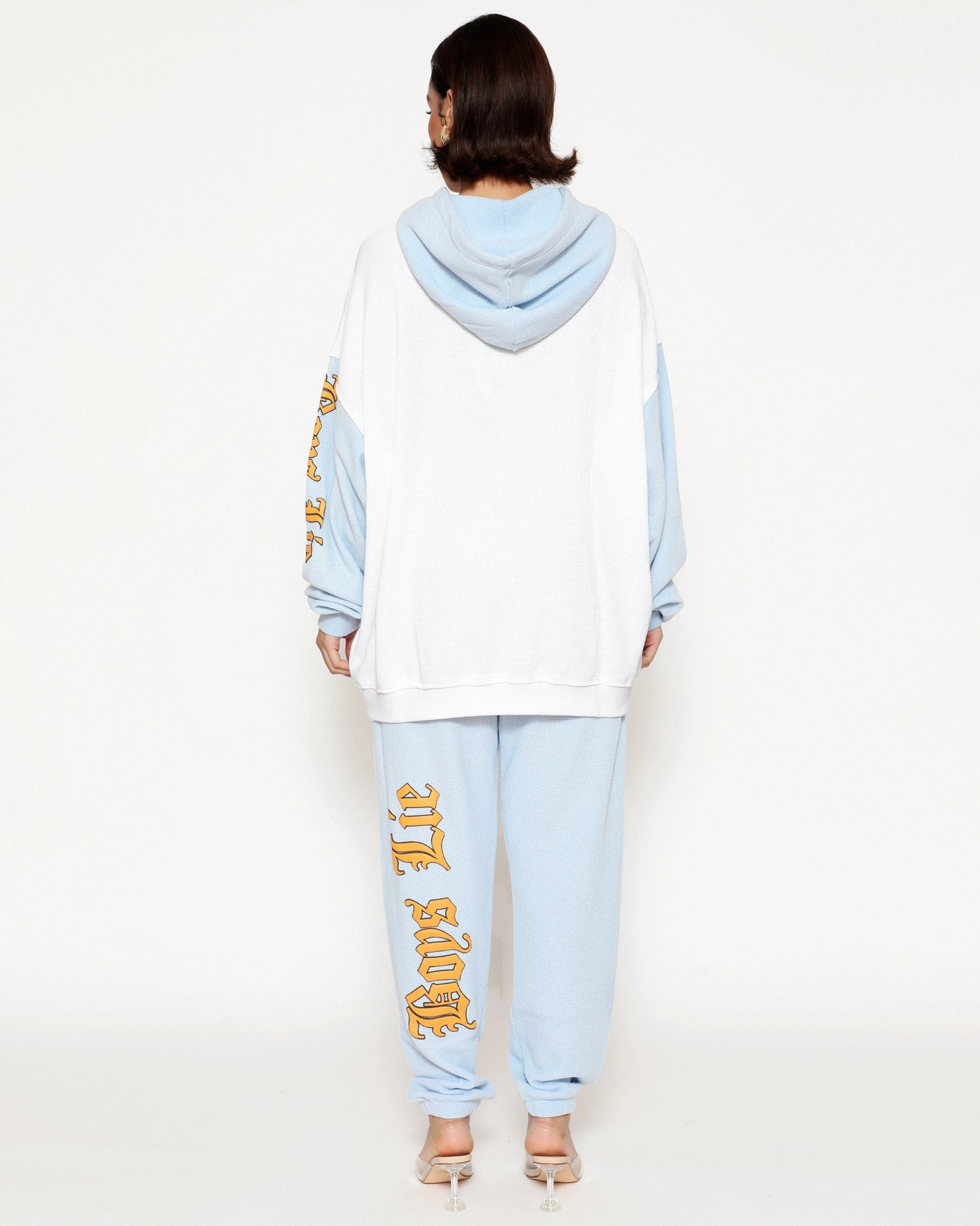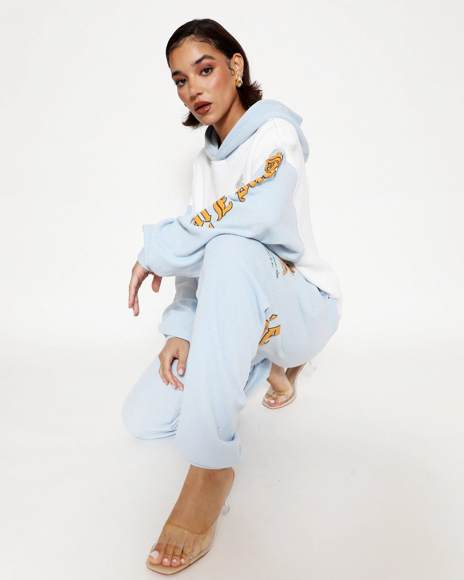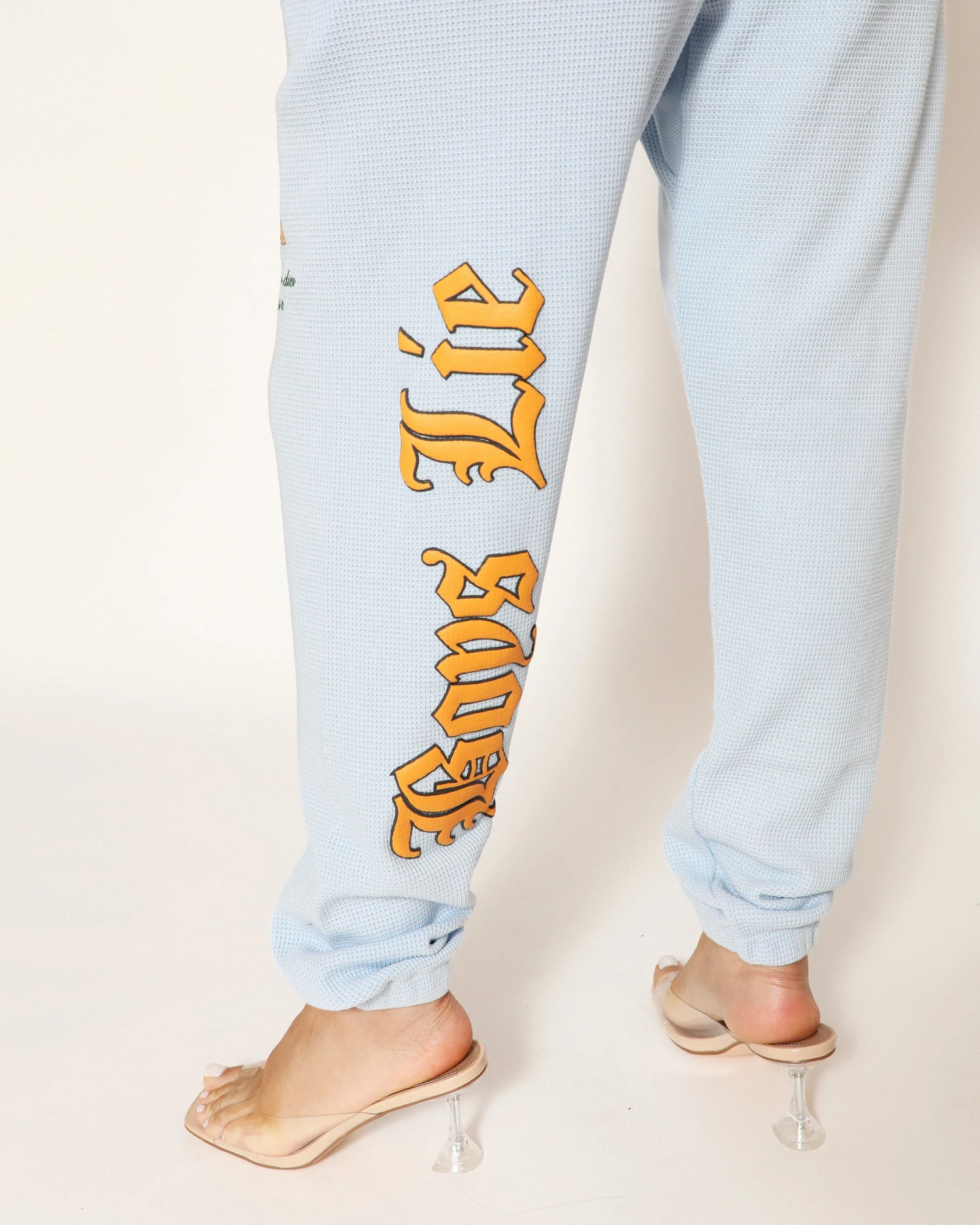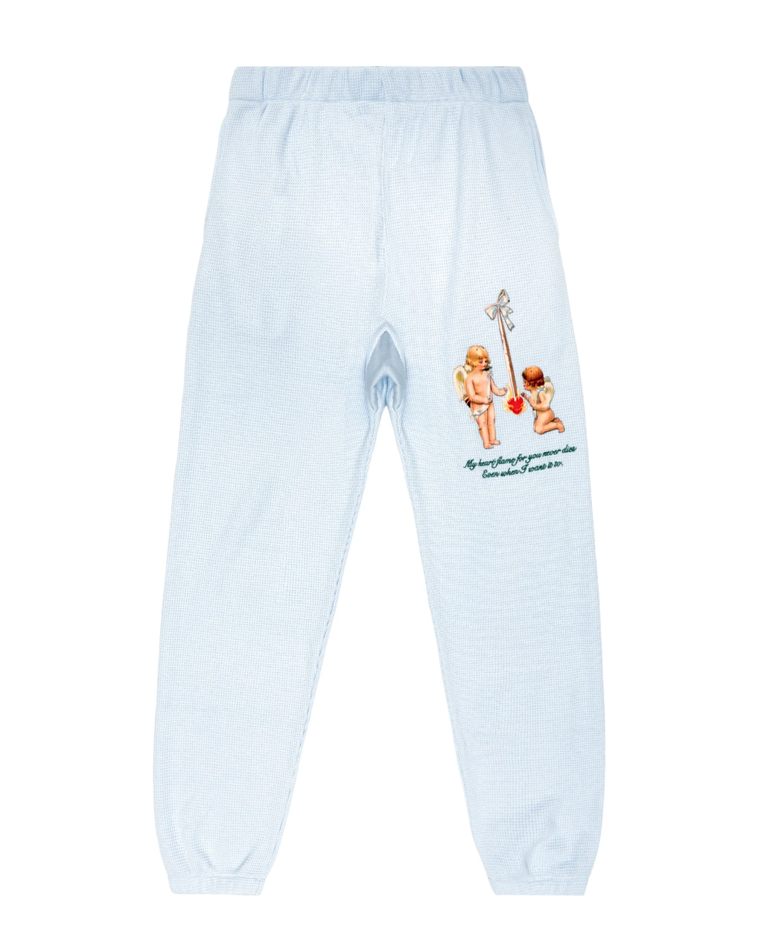 Thermal sweatpants in baby blue. High rise sweatpants with back and side pockets, elastic waistband and cuffs. Embroidered front and printed back graphics.