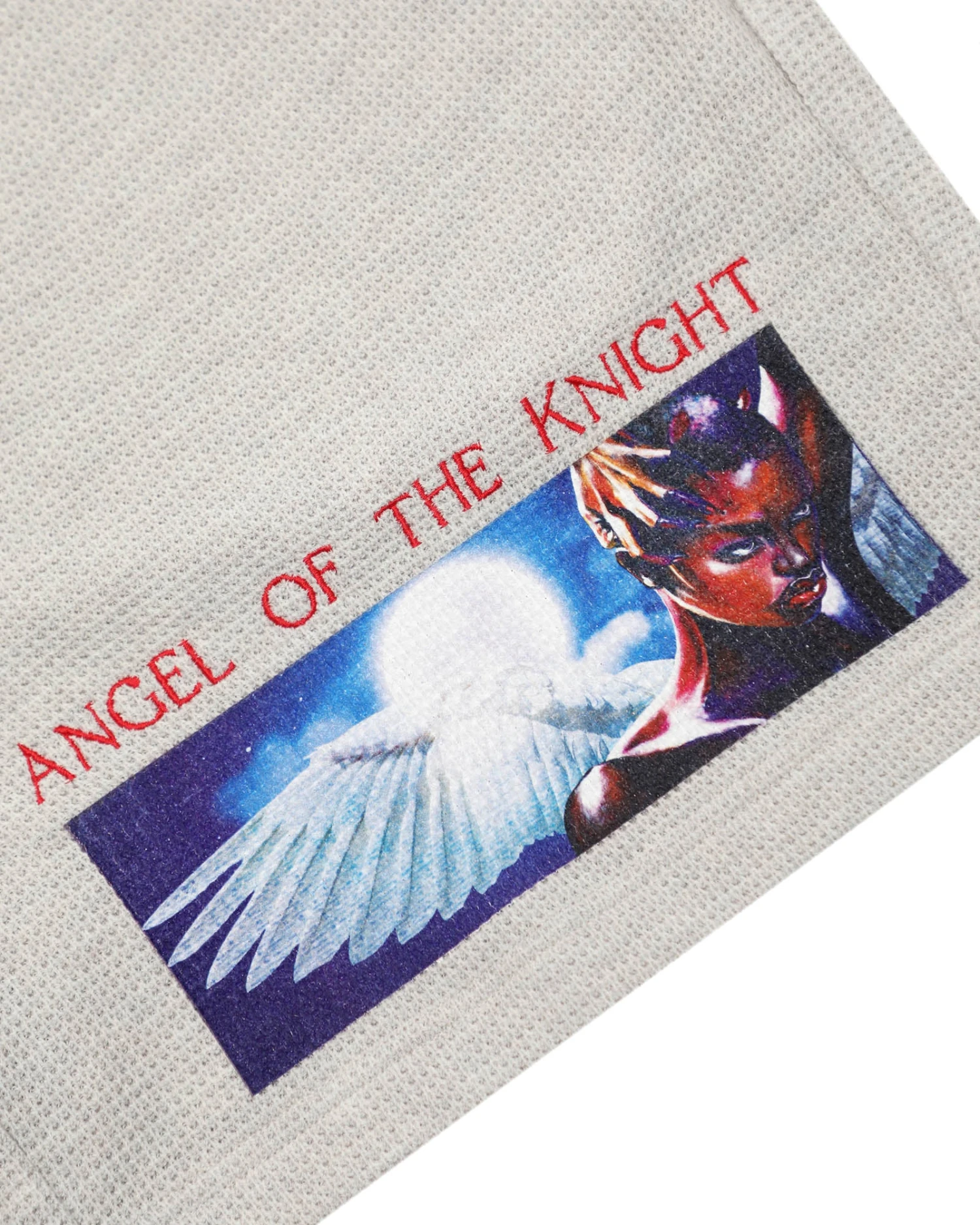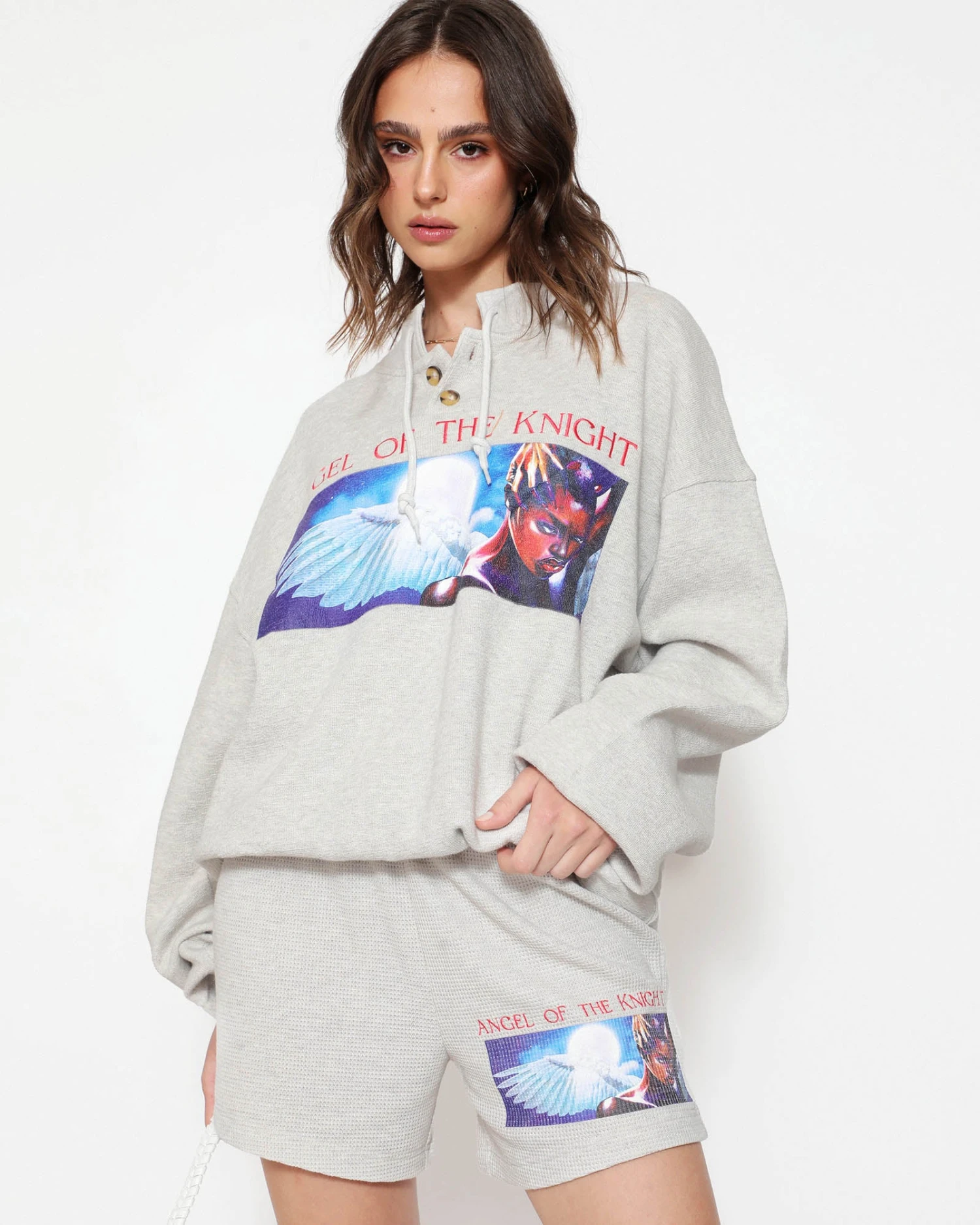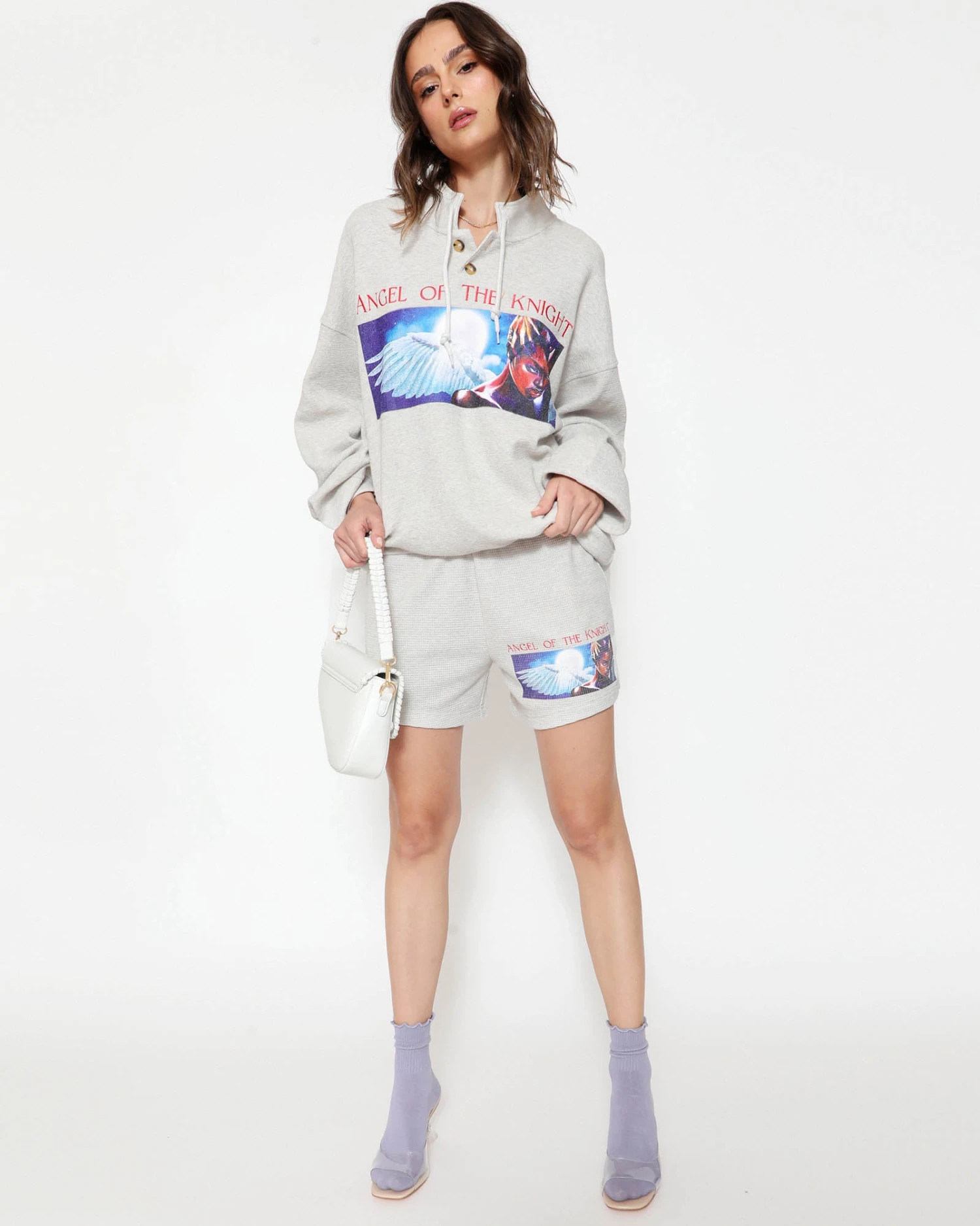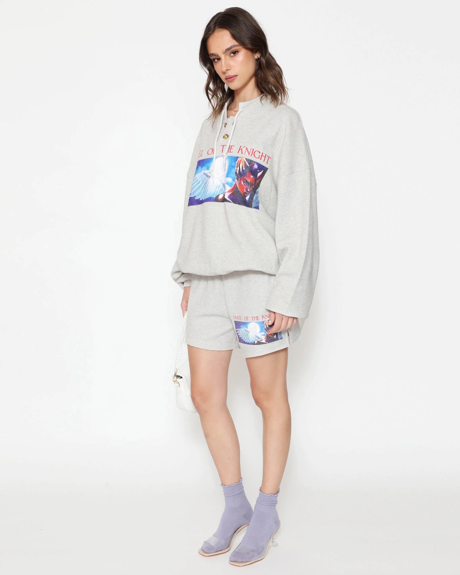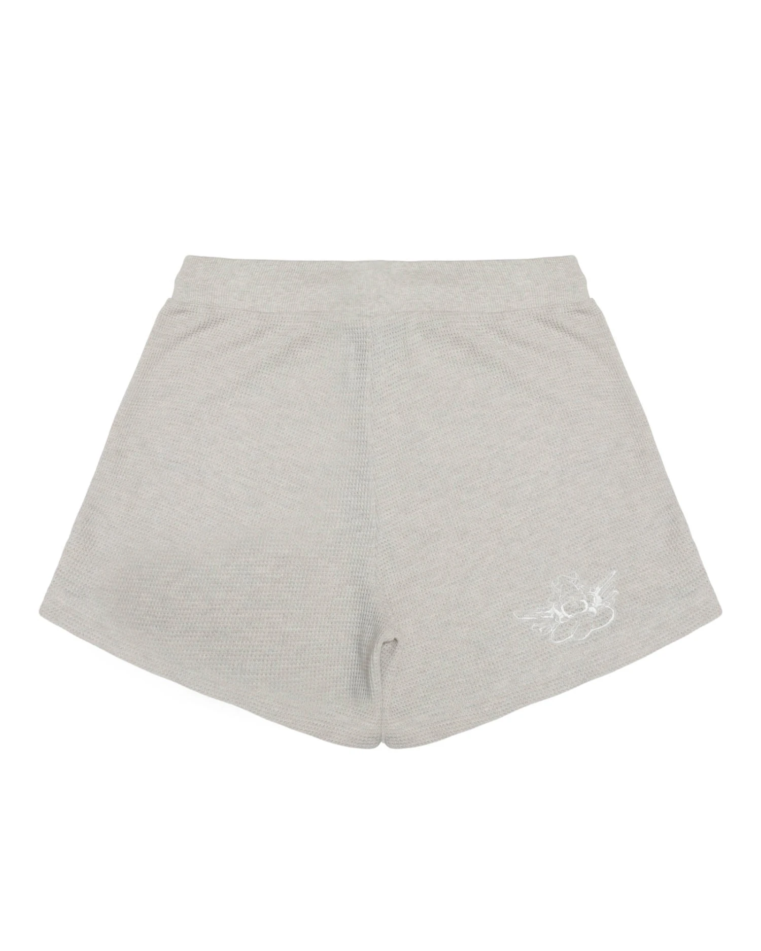 Soft thermal fabric in heather grey. High rise shorts with adjustable drawstring and an oversized fit.Â