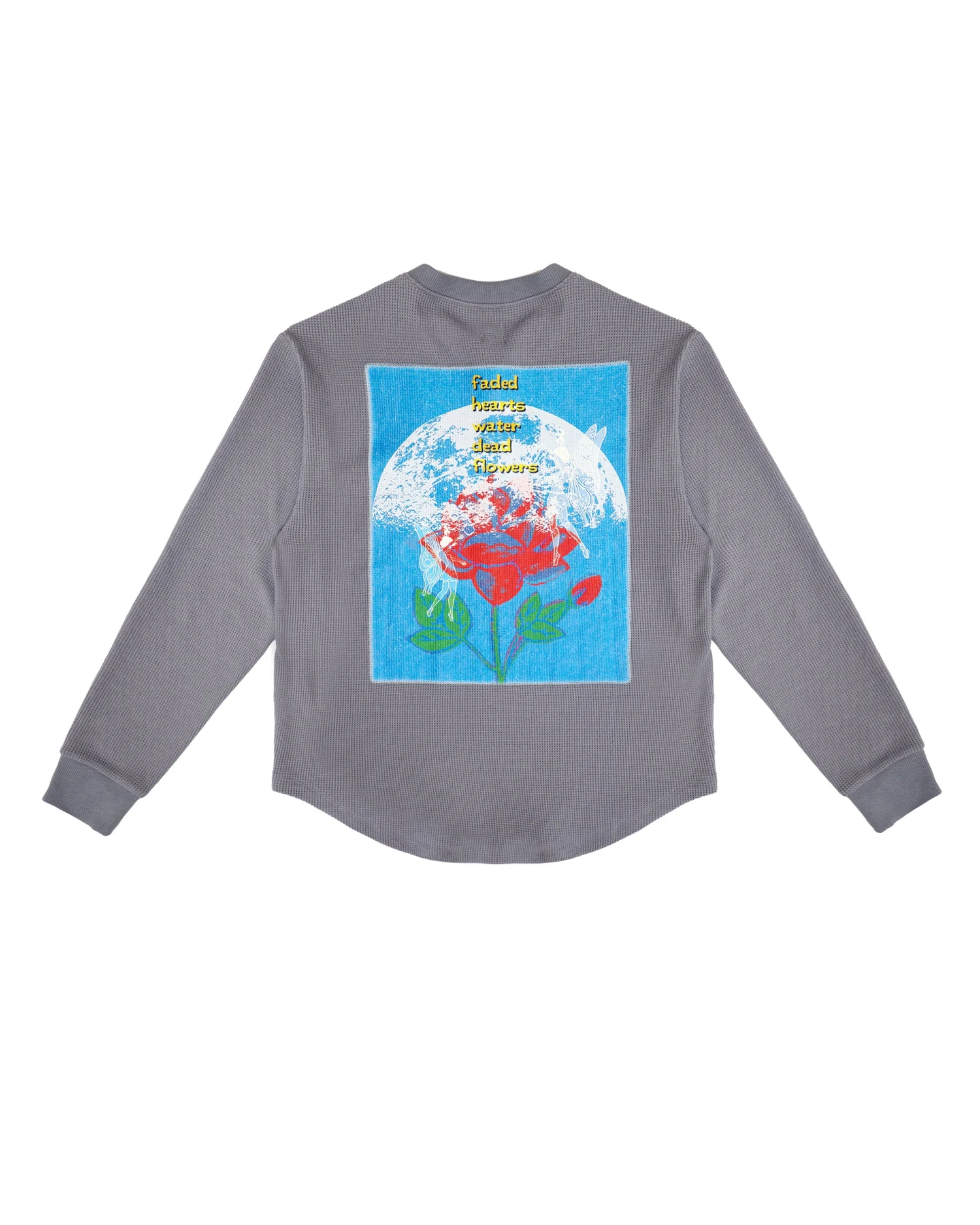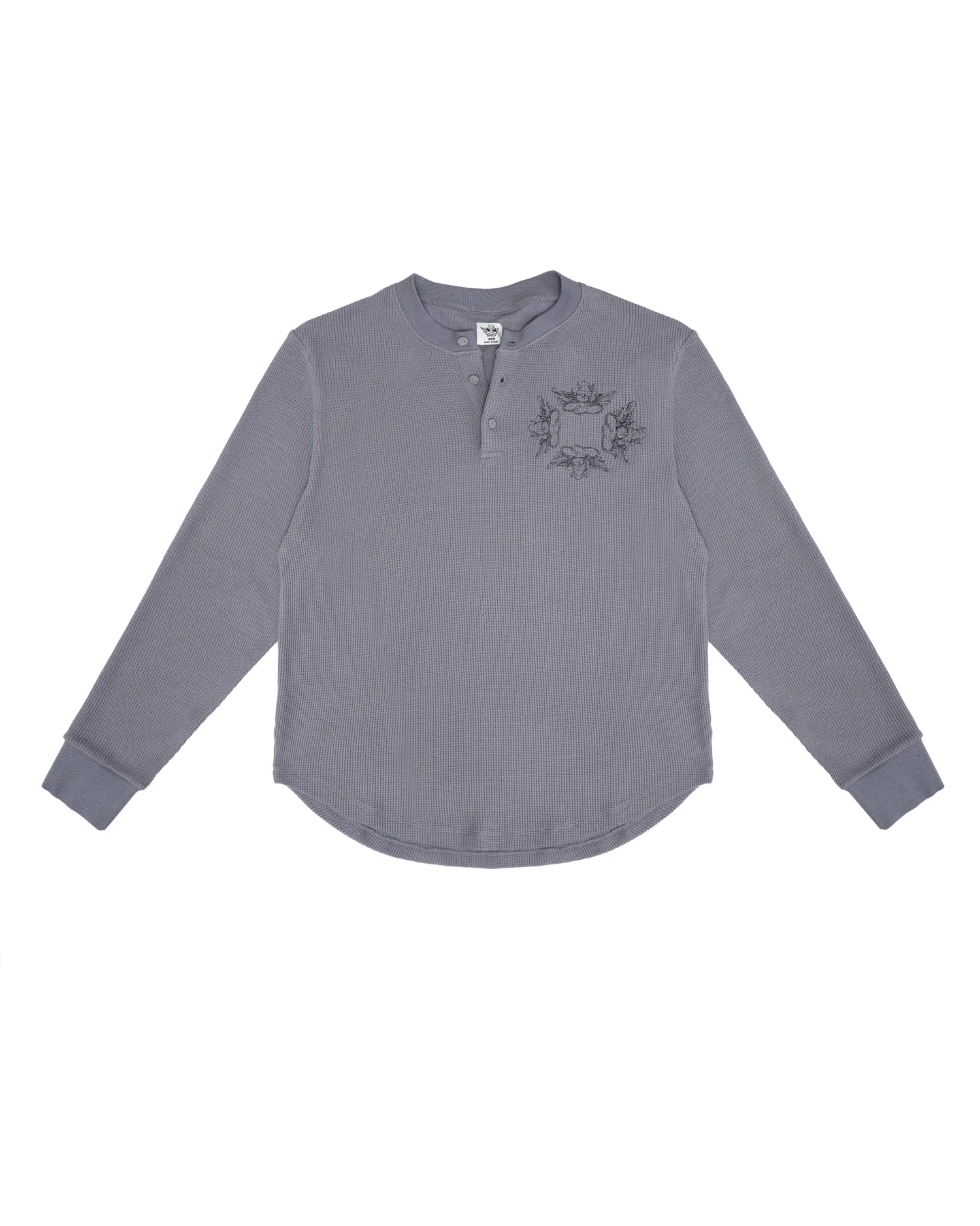 Oversized thermal long sleeve henley in dusty purple. Front button details and a curved hem with embroidered logos.Â