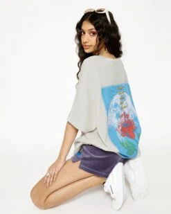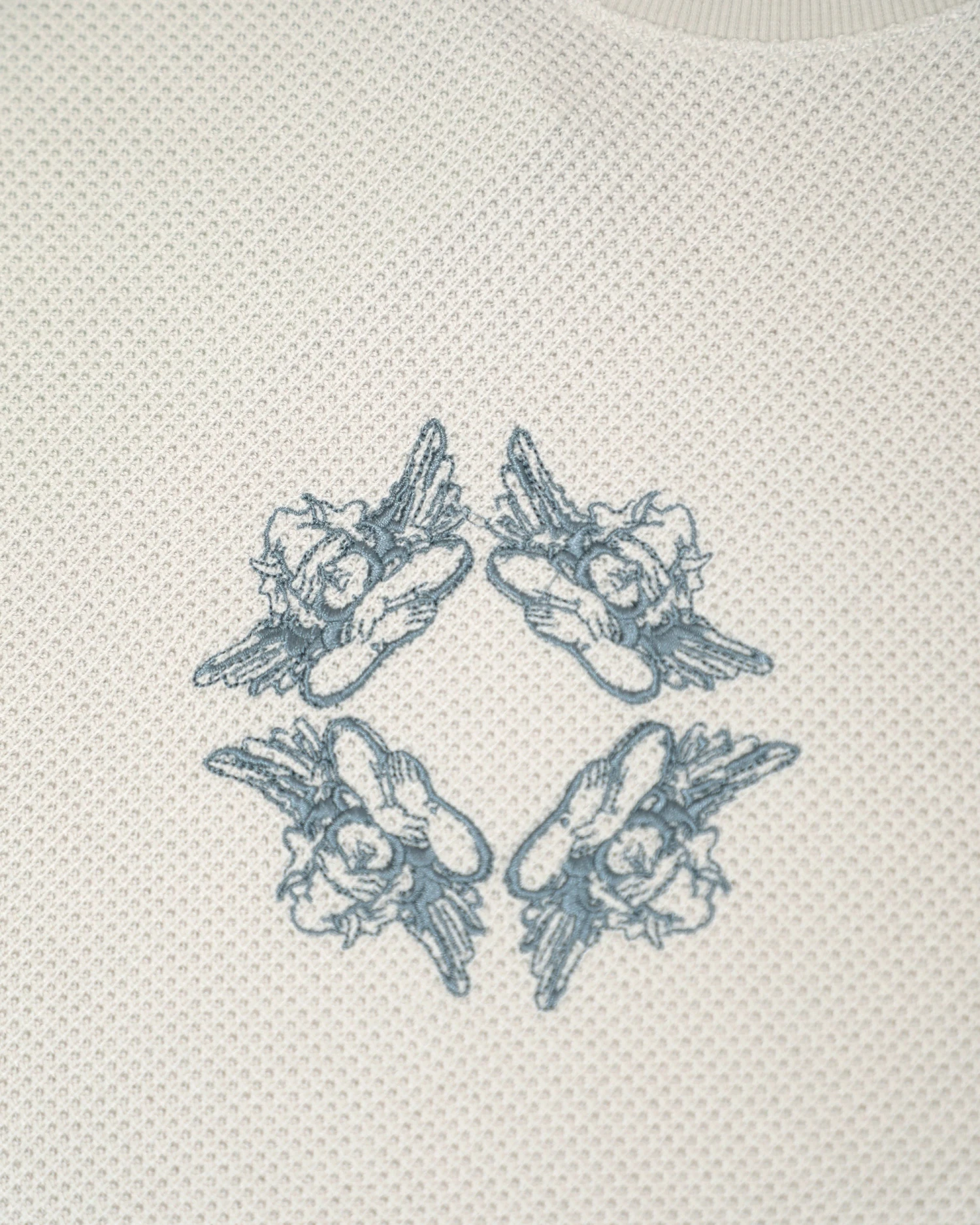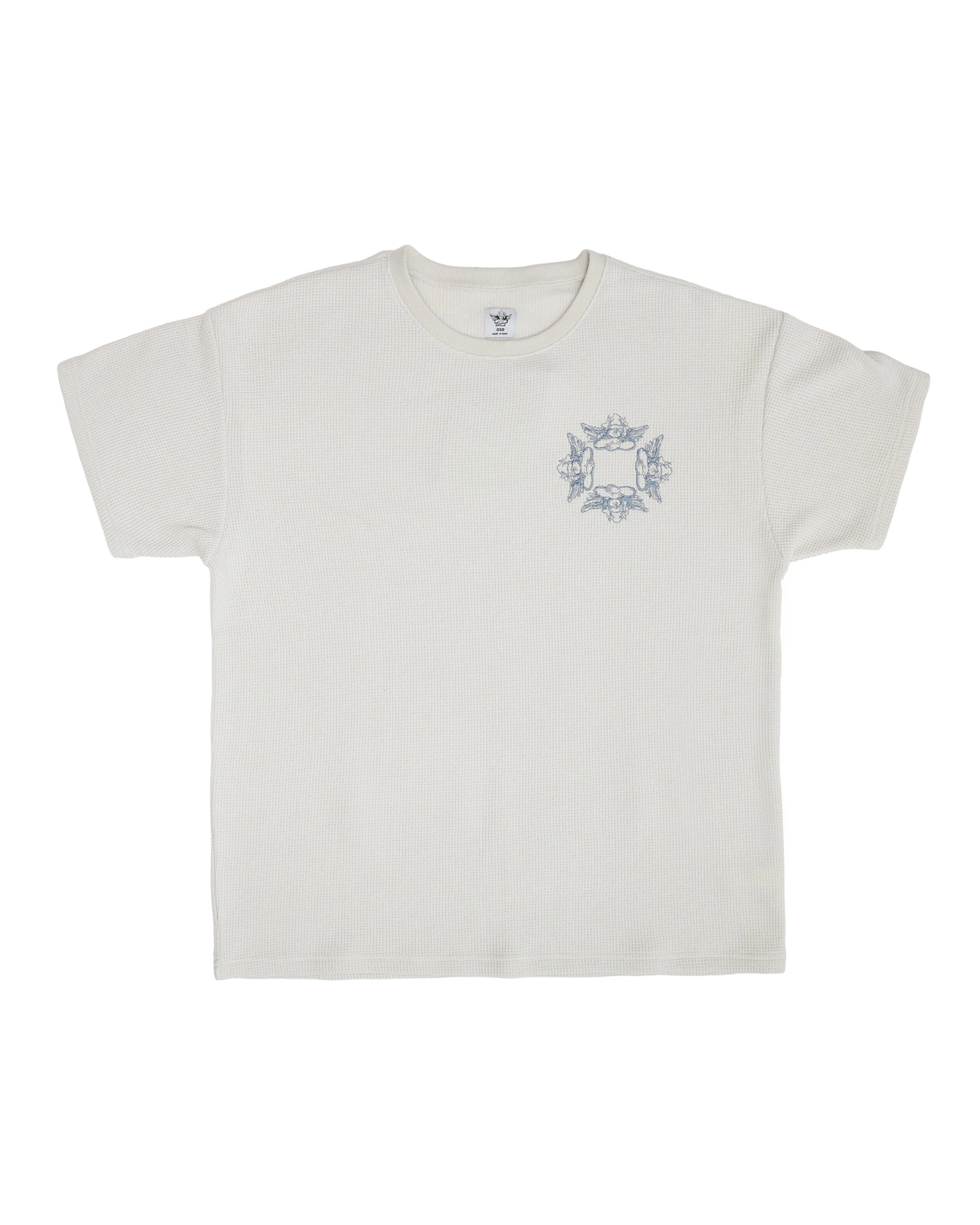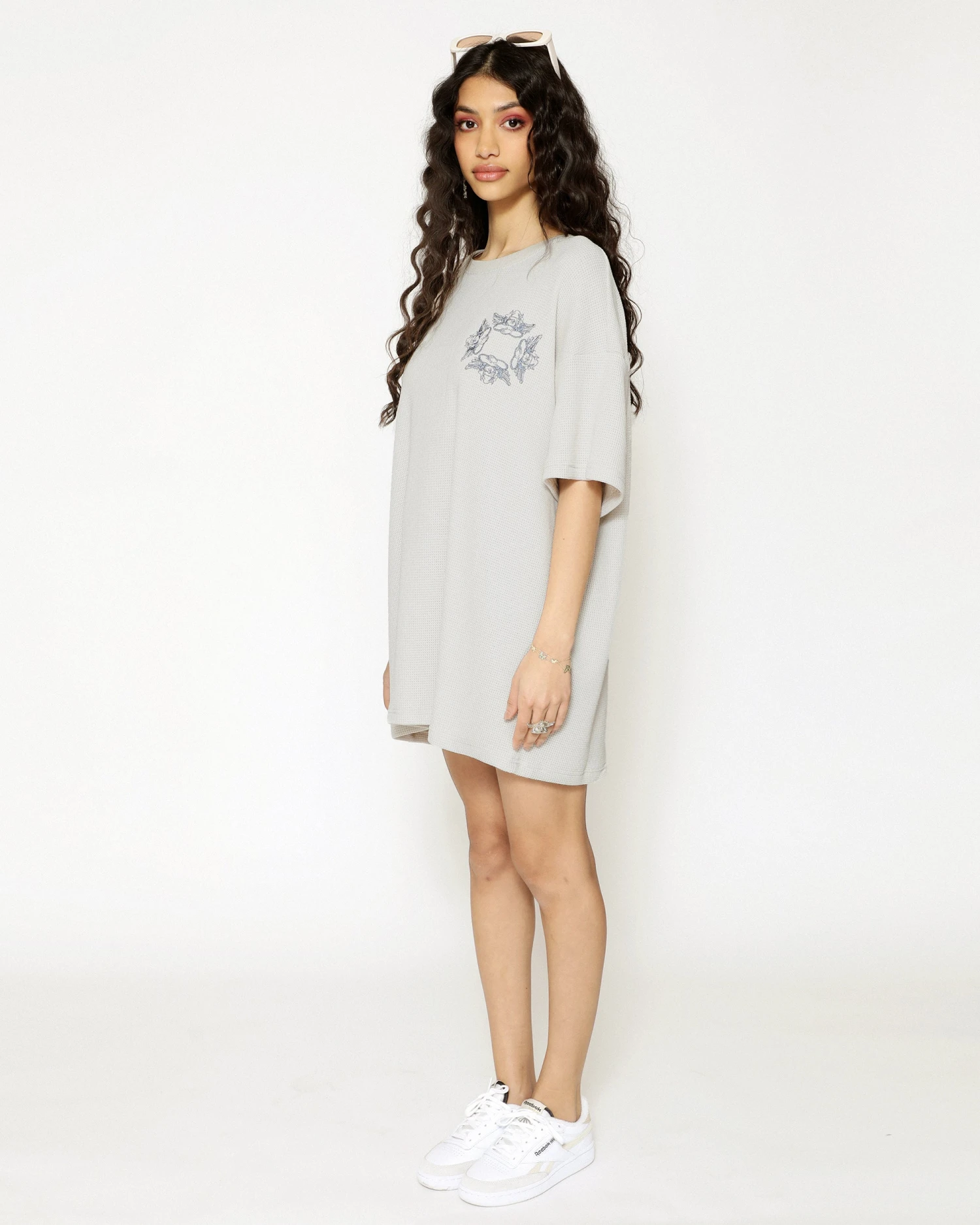 Light grey tee in soft thermal with an oversized fit. Features a ribbed neckline and embroidered front logos. Â
