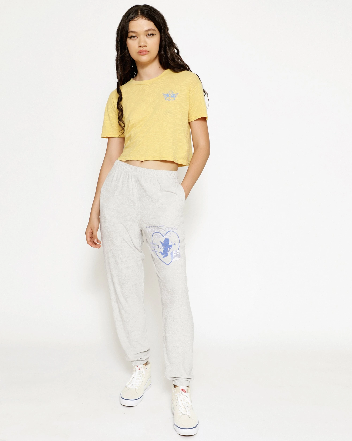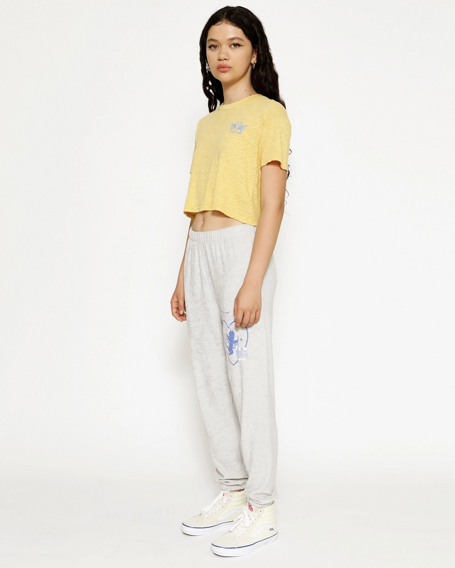 Cotton slub cropped baby tee in green. Lightweight and slightly sheer with distressed graphics.Â