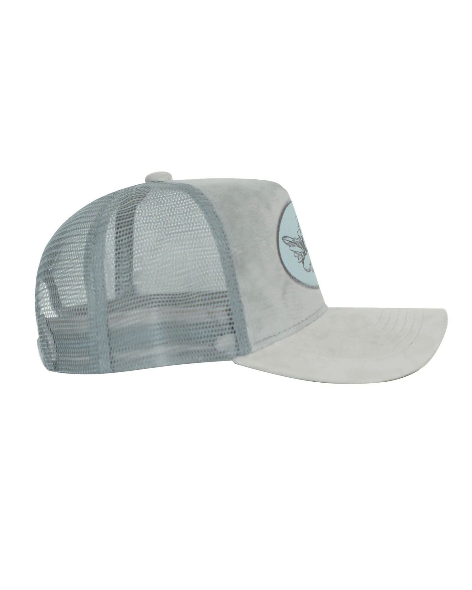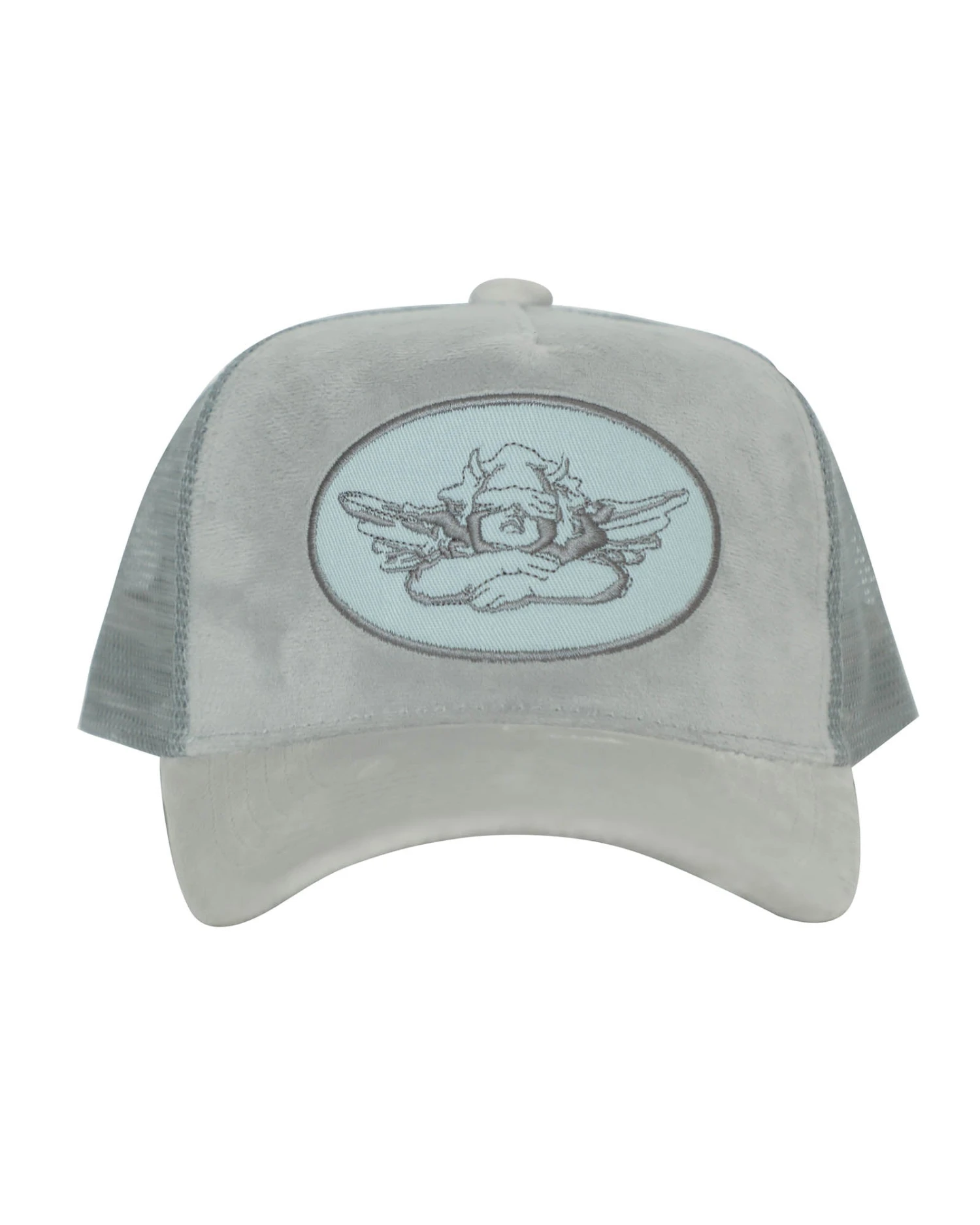 Grey trucker hat with light blue patch and velour fabric. Adjustable snapback.