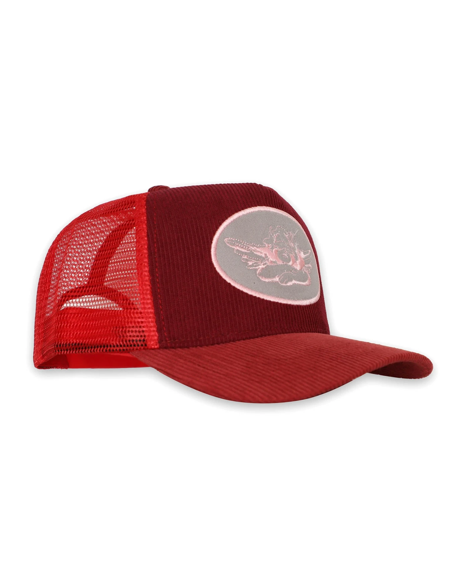 Deep red trucker hat with grey patch and burgundy corduroy. Adjustable snapback.Â