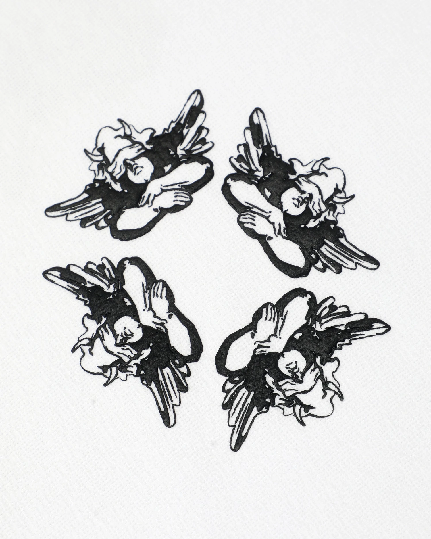 Inside out french terry fabric in white and black. Oversized hoodie featuring a dramatic hood and front and back printed graphics.