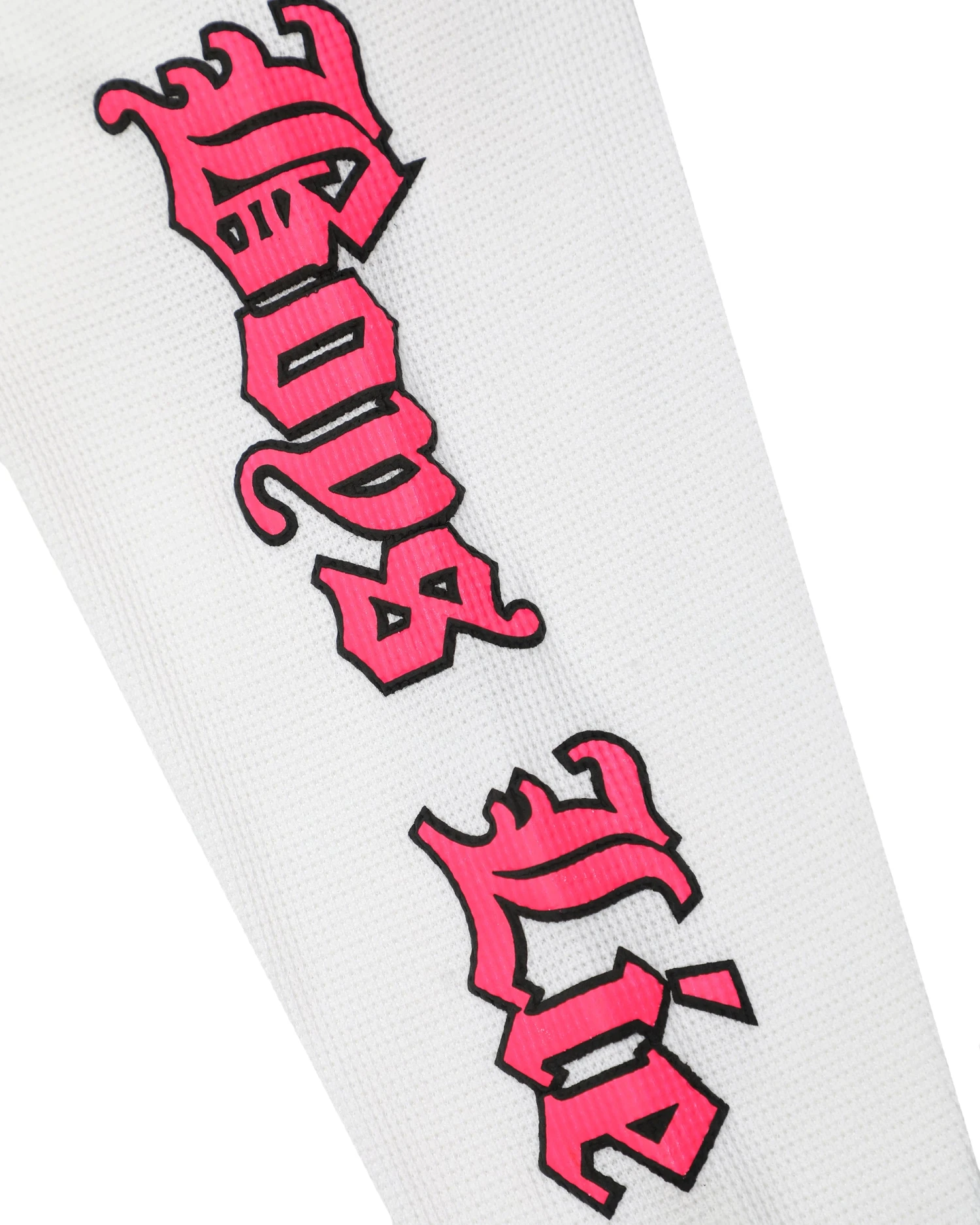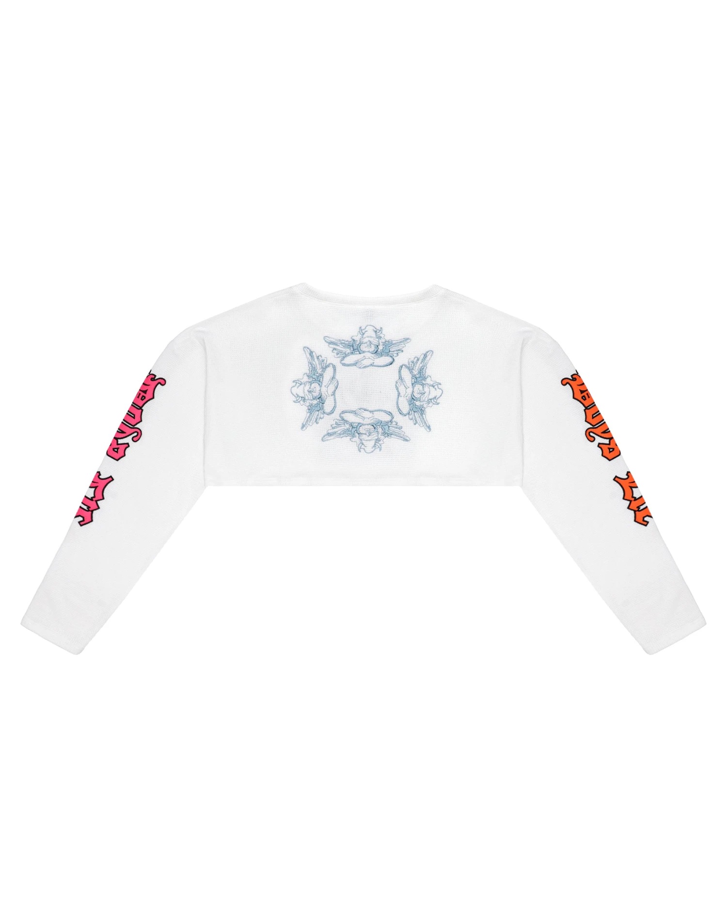 Oversized cropped longsleeve in white. Printed front graphic and sleeves with embroidered back logo.