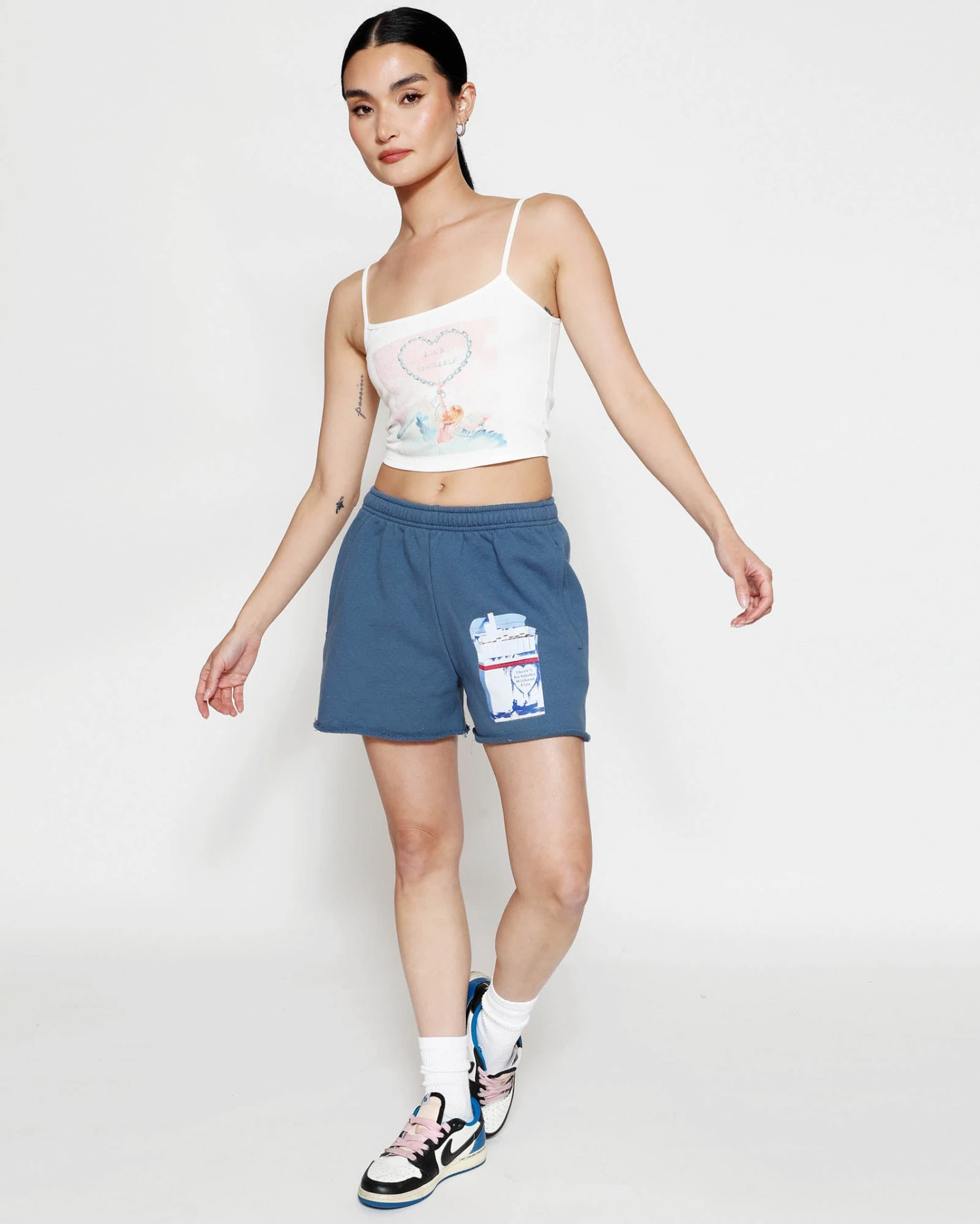 French terry fabric in navy. Mid-rise shorts with interior adjustable drawstring, side pockets, and a raw edge hem.Â