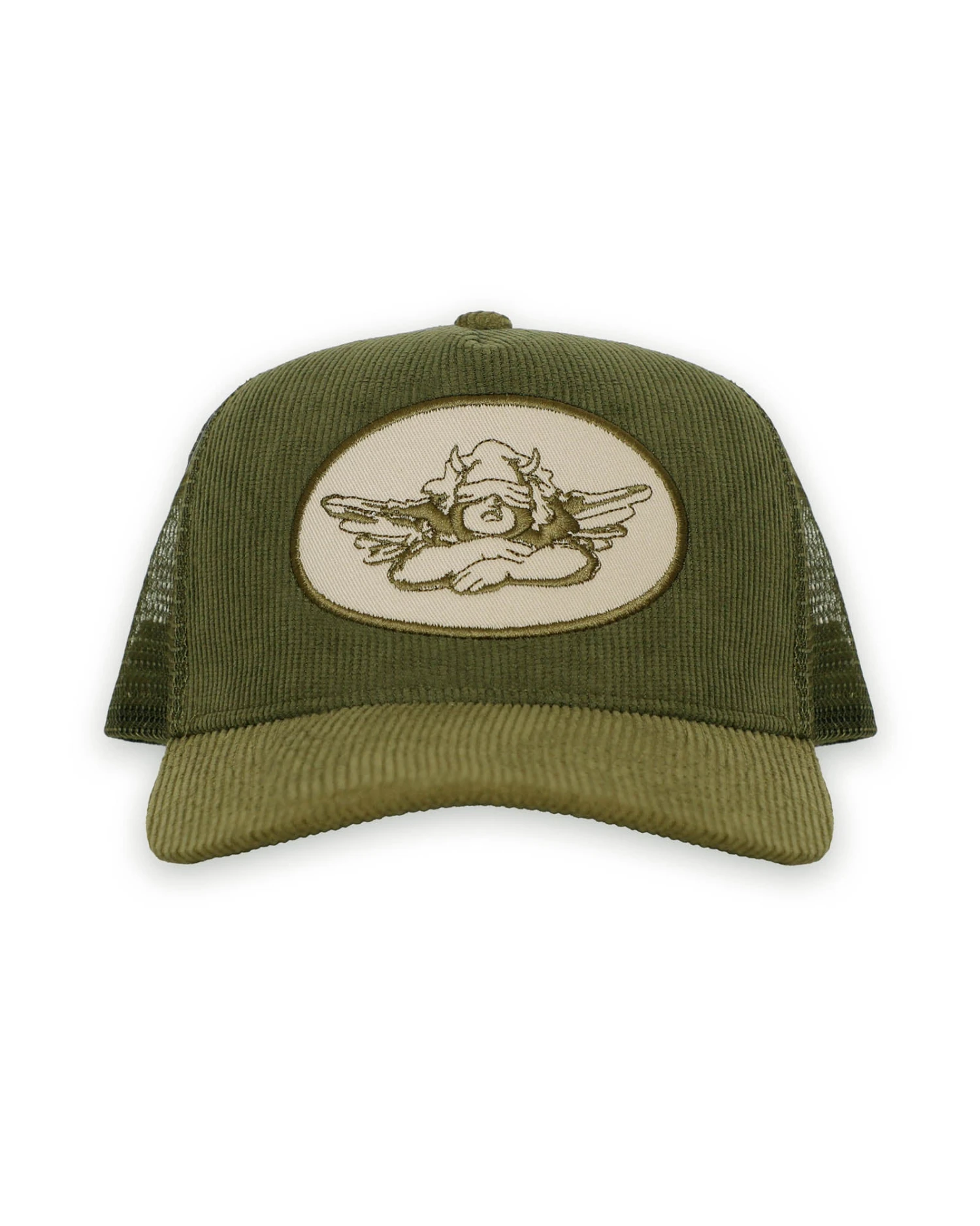 Olive green trucker hat with light green patch and olive corduroy. Adjustable snapback.Â