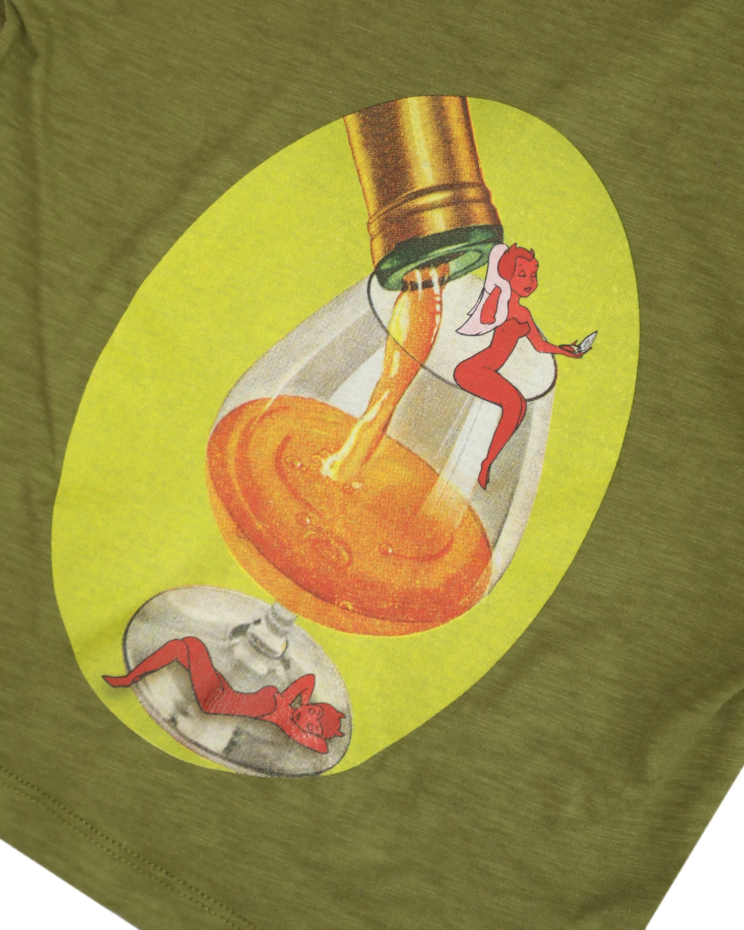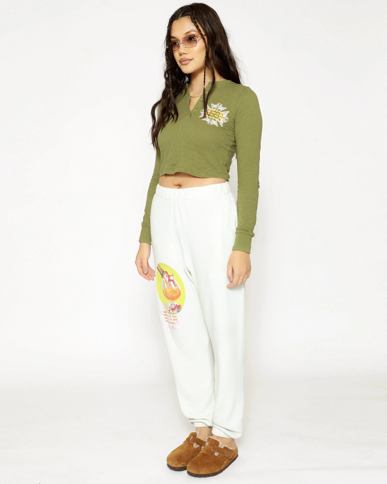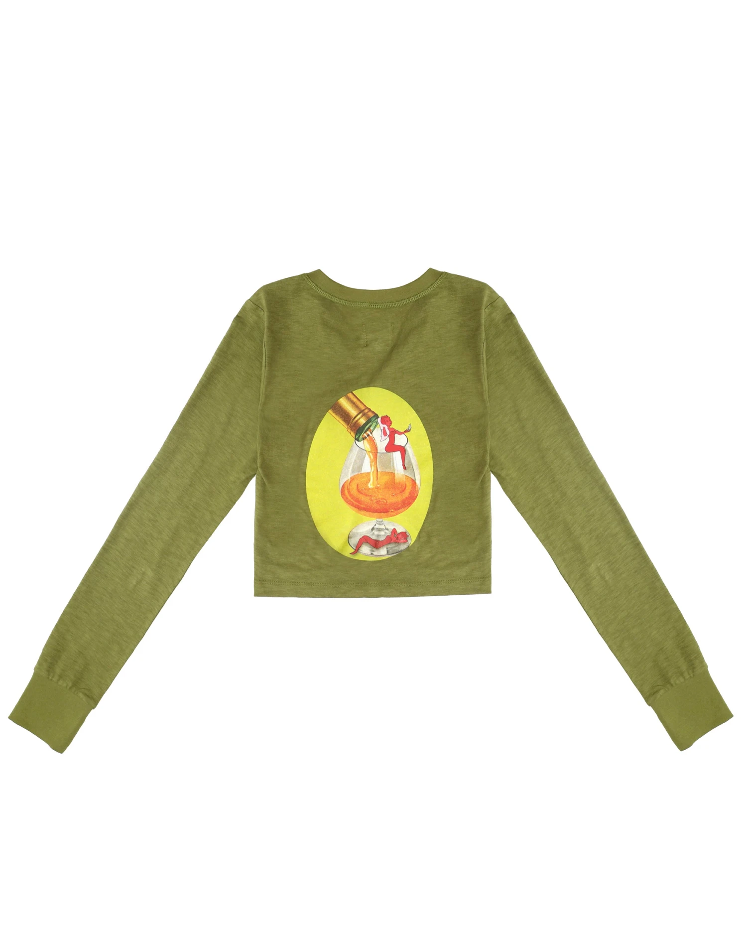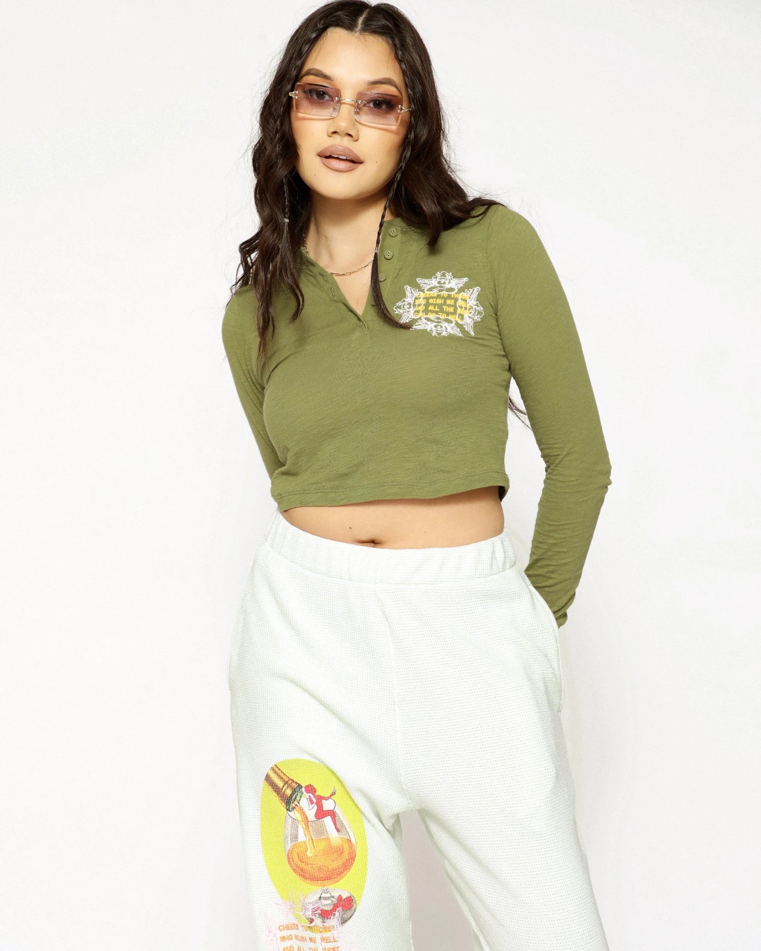 Olive green cropped henley long sleeve with button details and front embroidered graphic.Â
