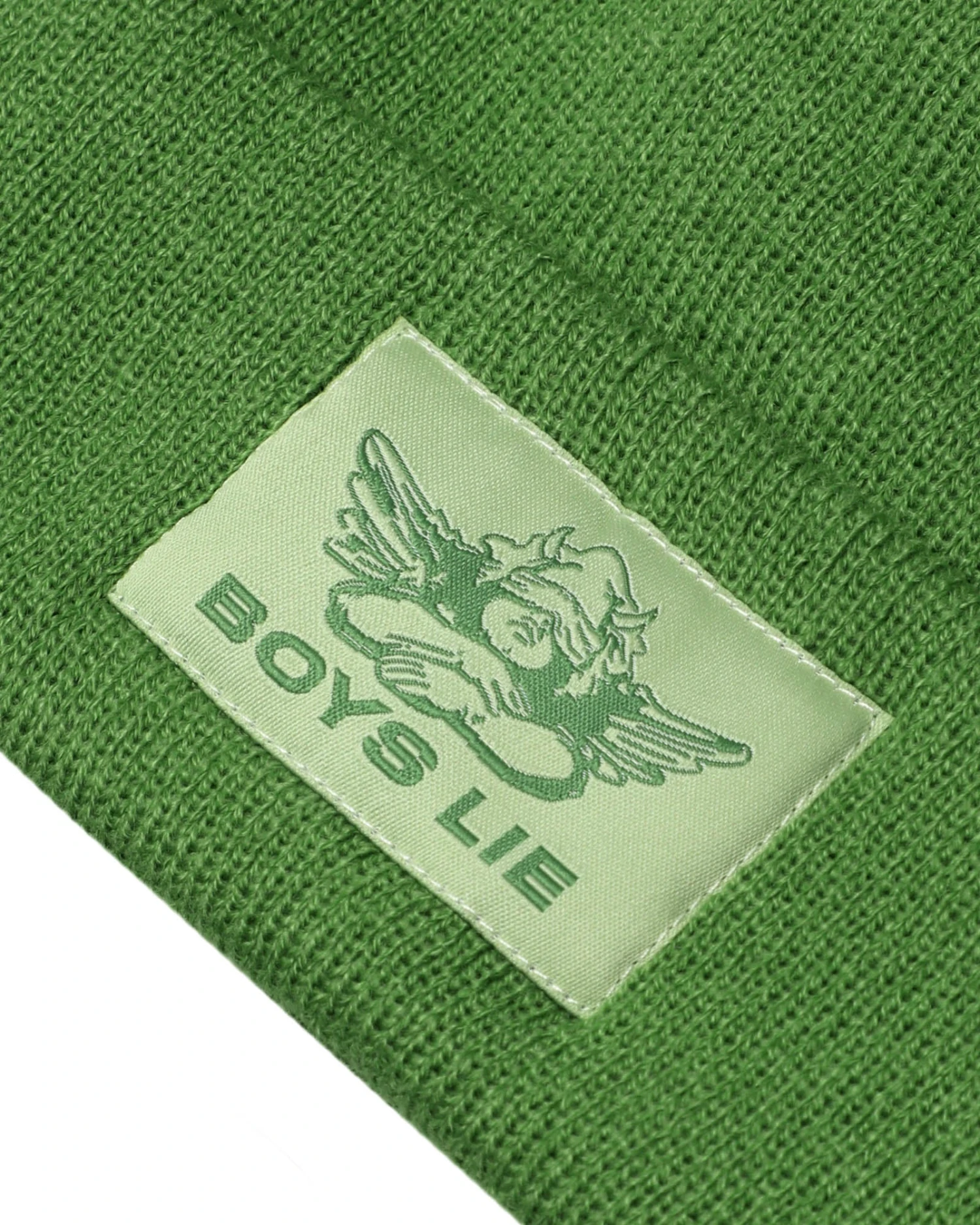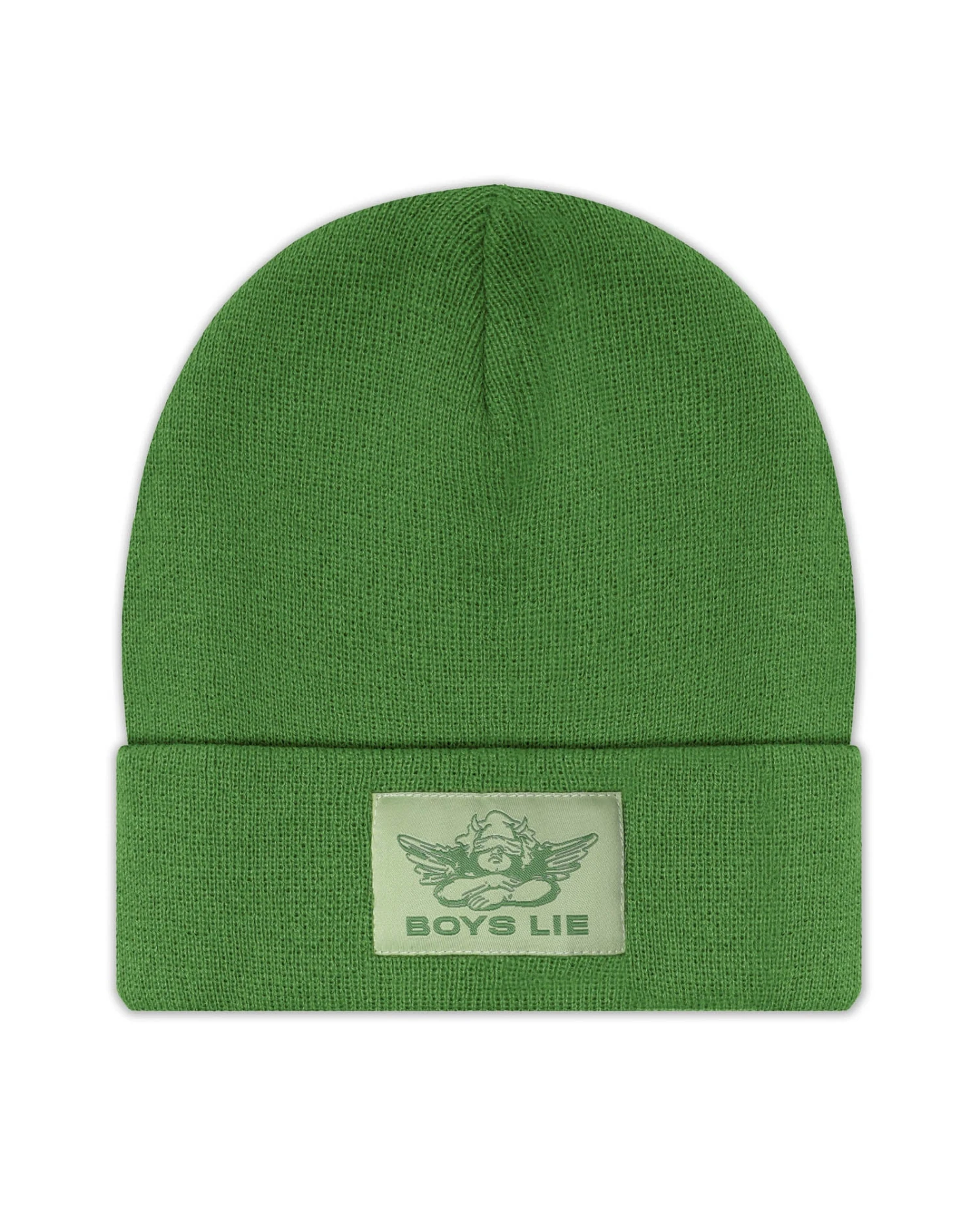 Olive green beanie with monochromatic olive Boys Lie logo patch.