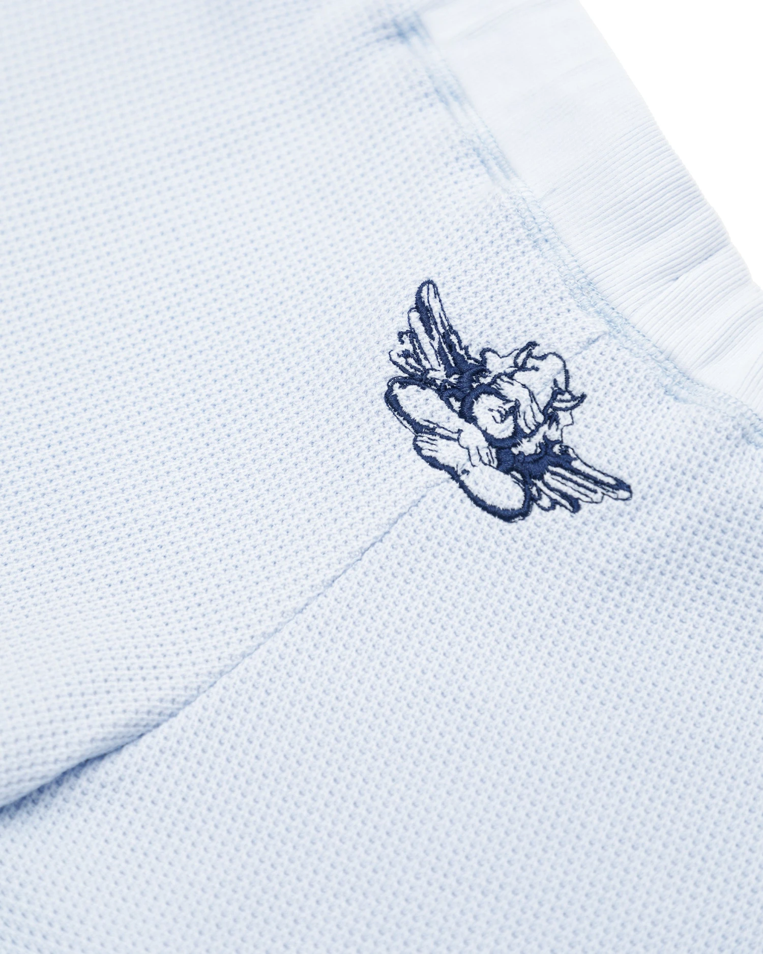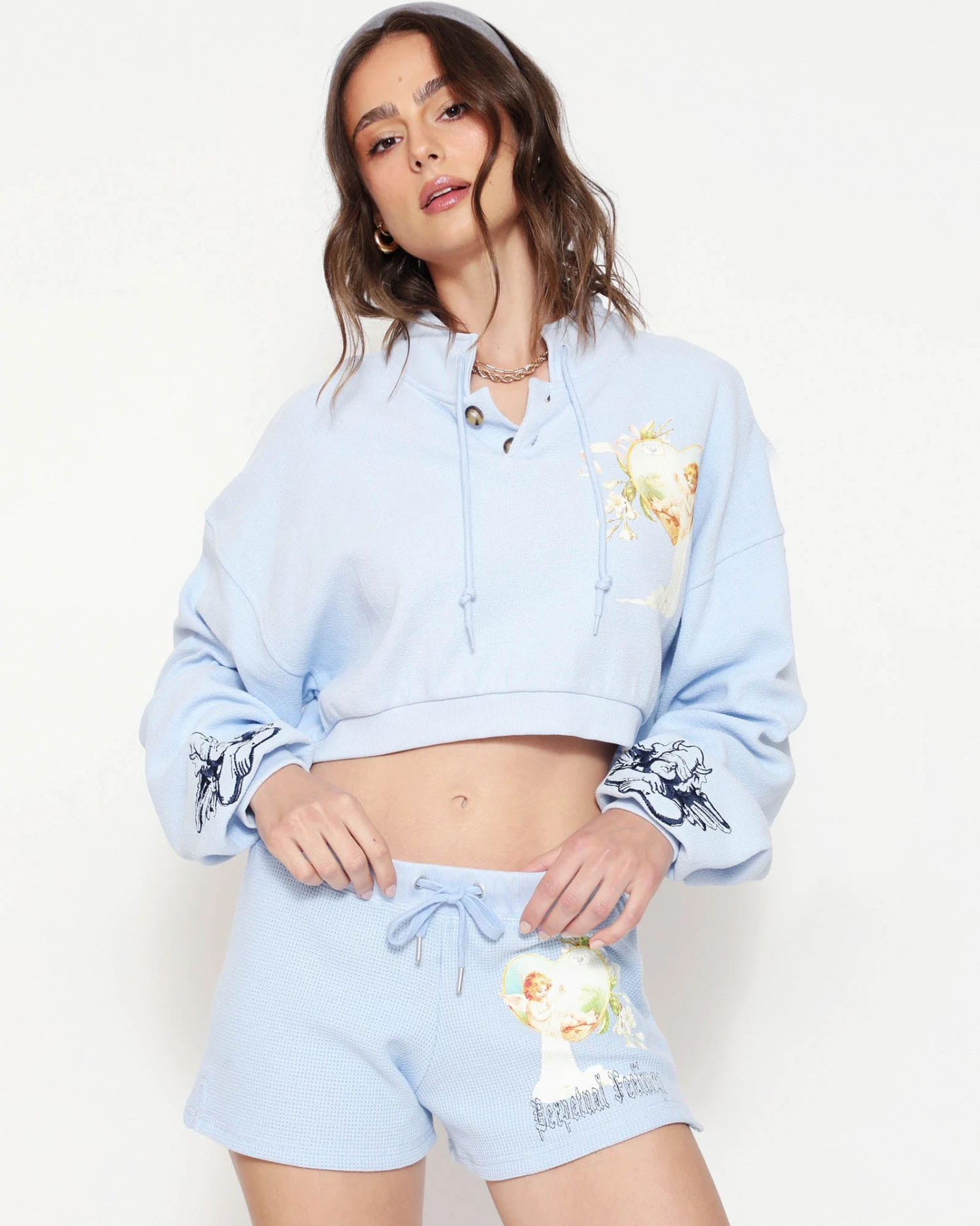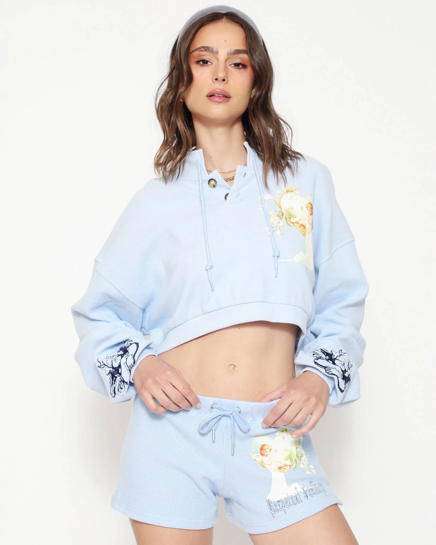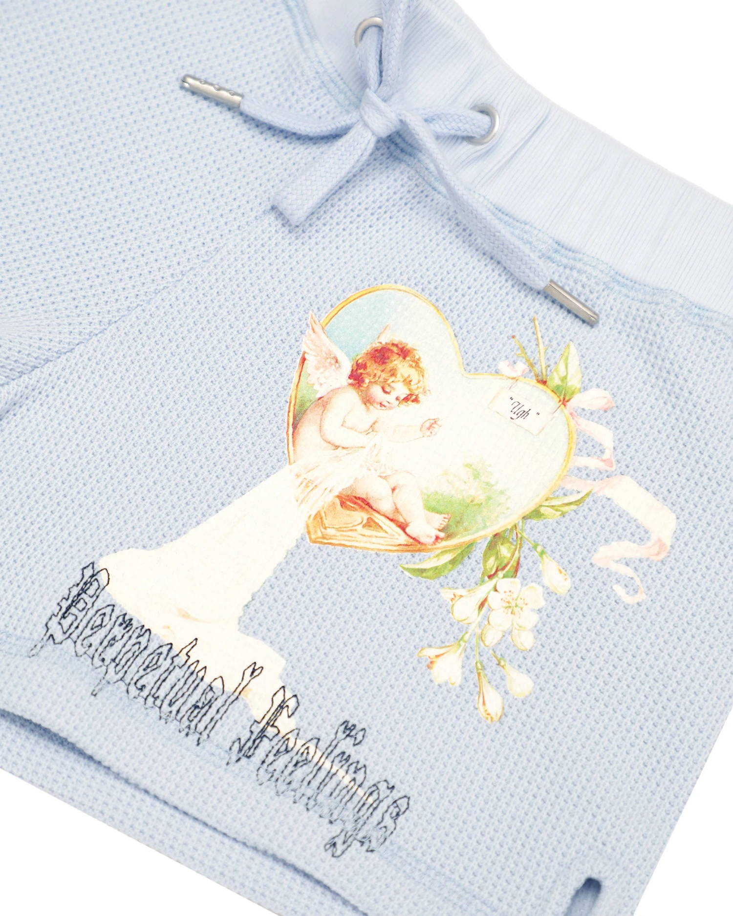 Soft thermal fabric in baby blue. Mid-rise shorts with adjustable drawstring and embroidery. Â