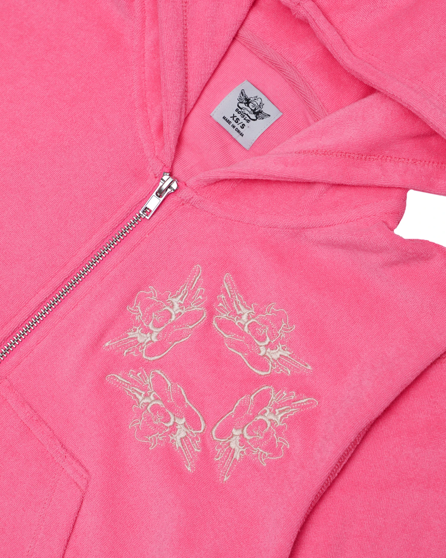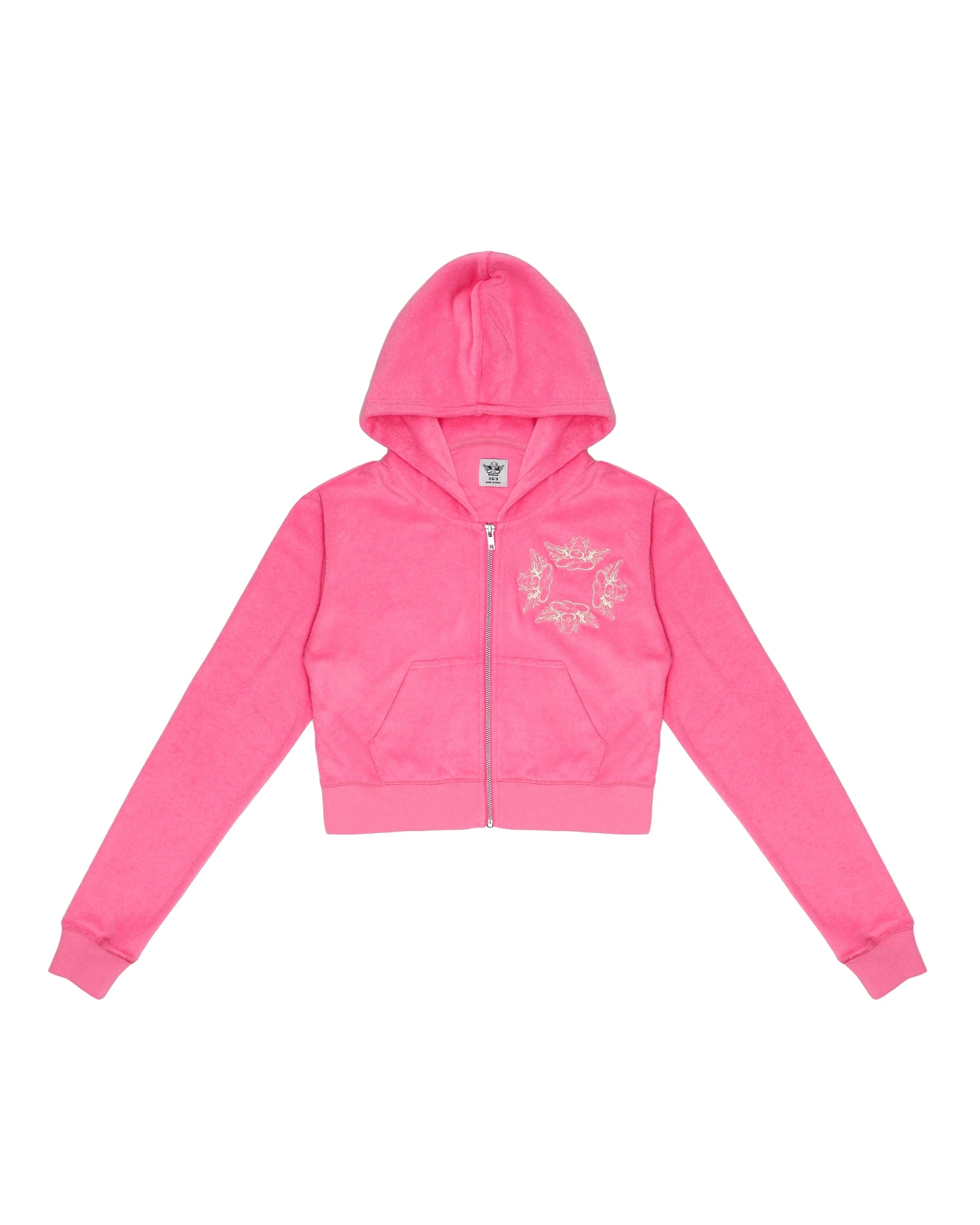 Lightweight terry cloth fabric in a neon pink. Zip up hoodie with cropped hem, front pockets, and ribbed cuffs. Features embroidered front logos.Â