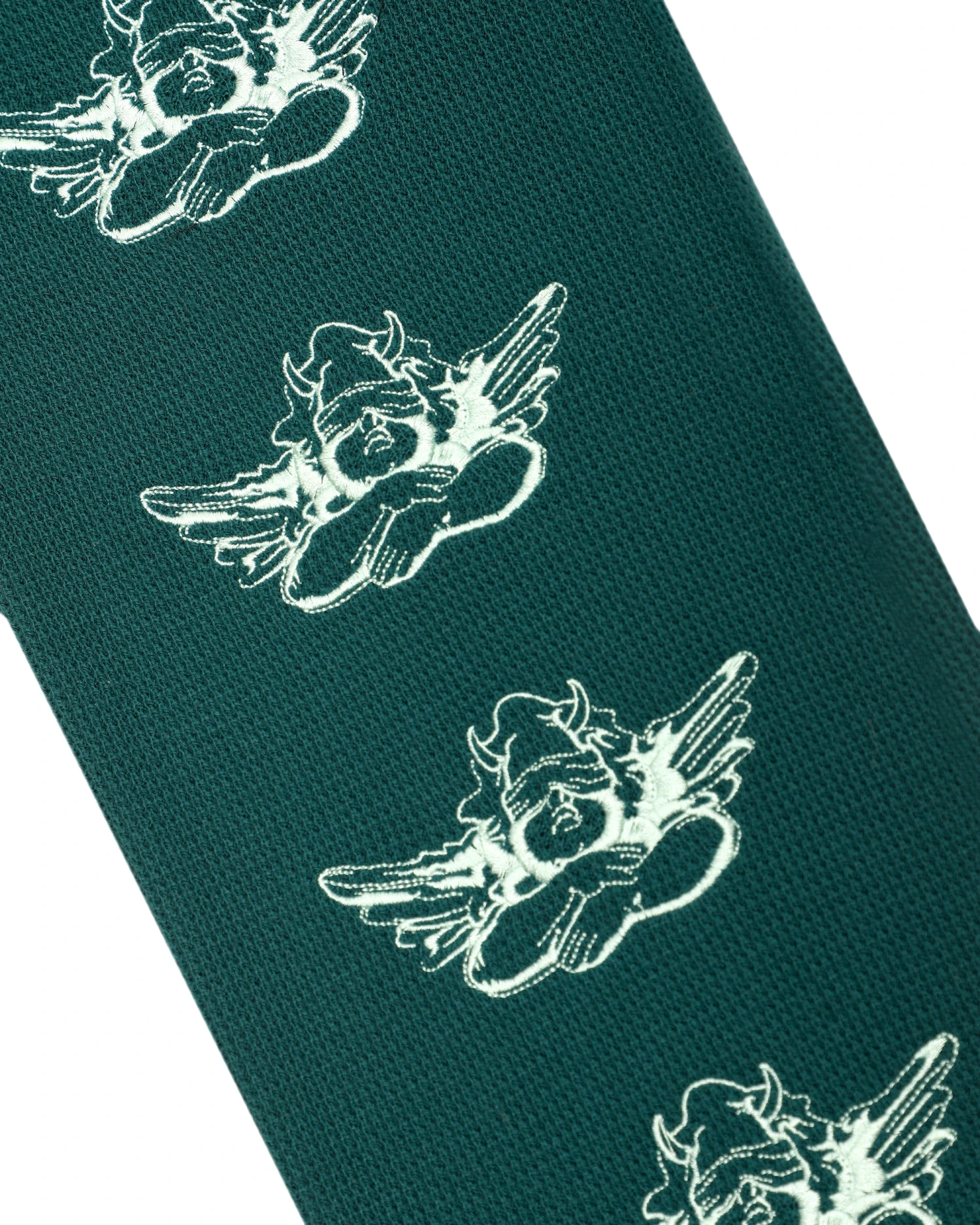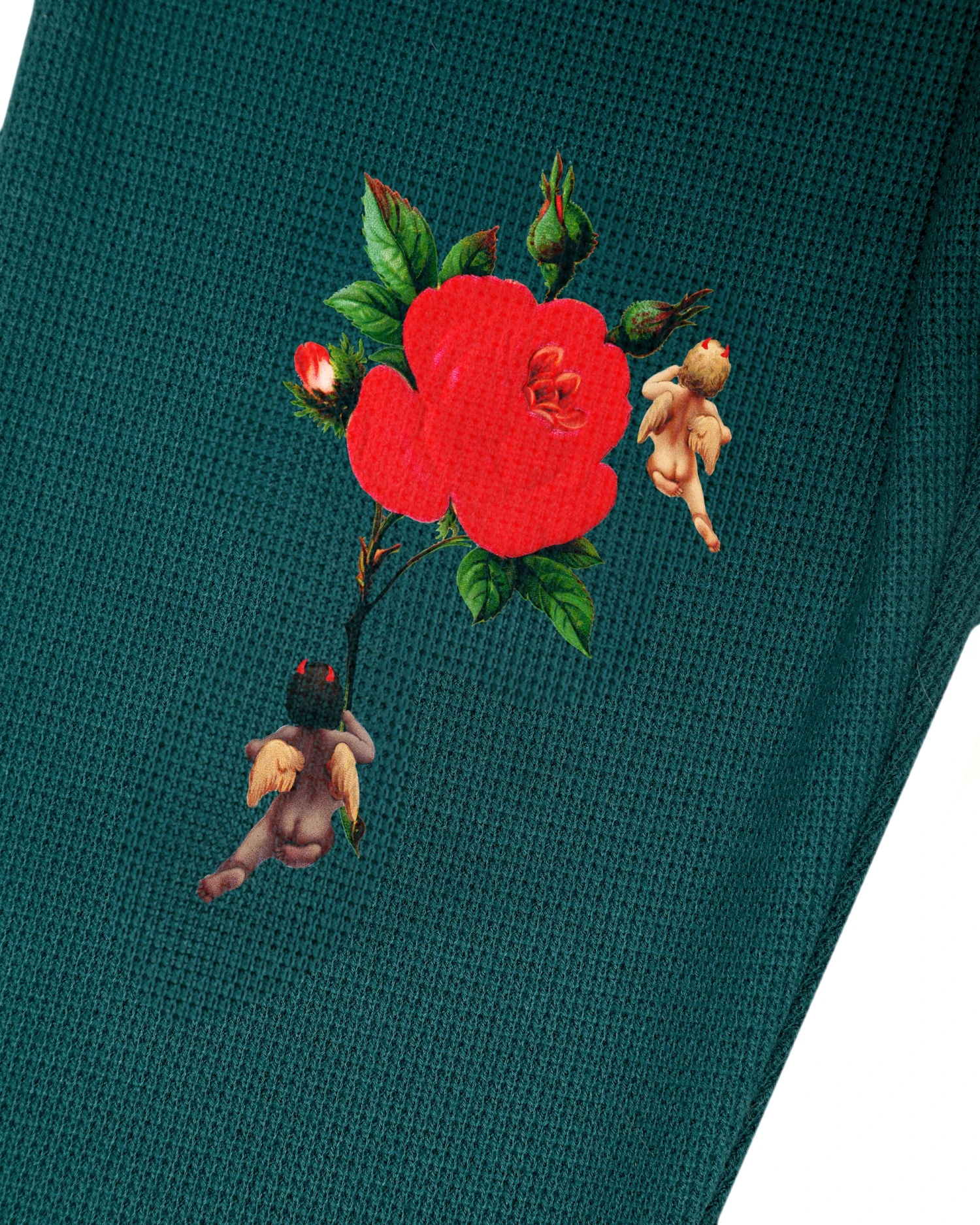 Soft thermal fabric in forest green. High rise sweatpants with back and side pockets, elastic waistband and cuffs. Embroidered front logos.Â