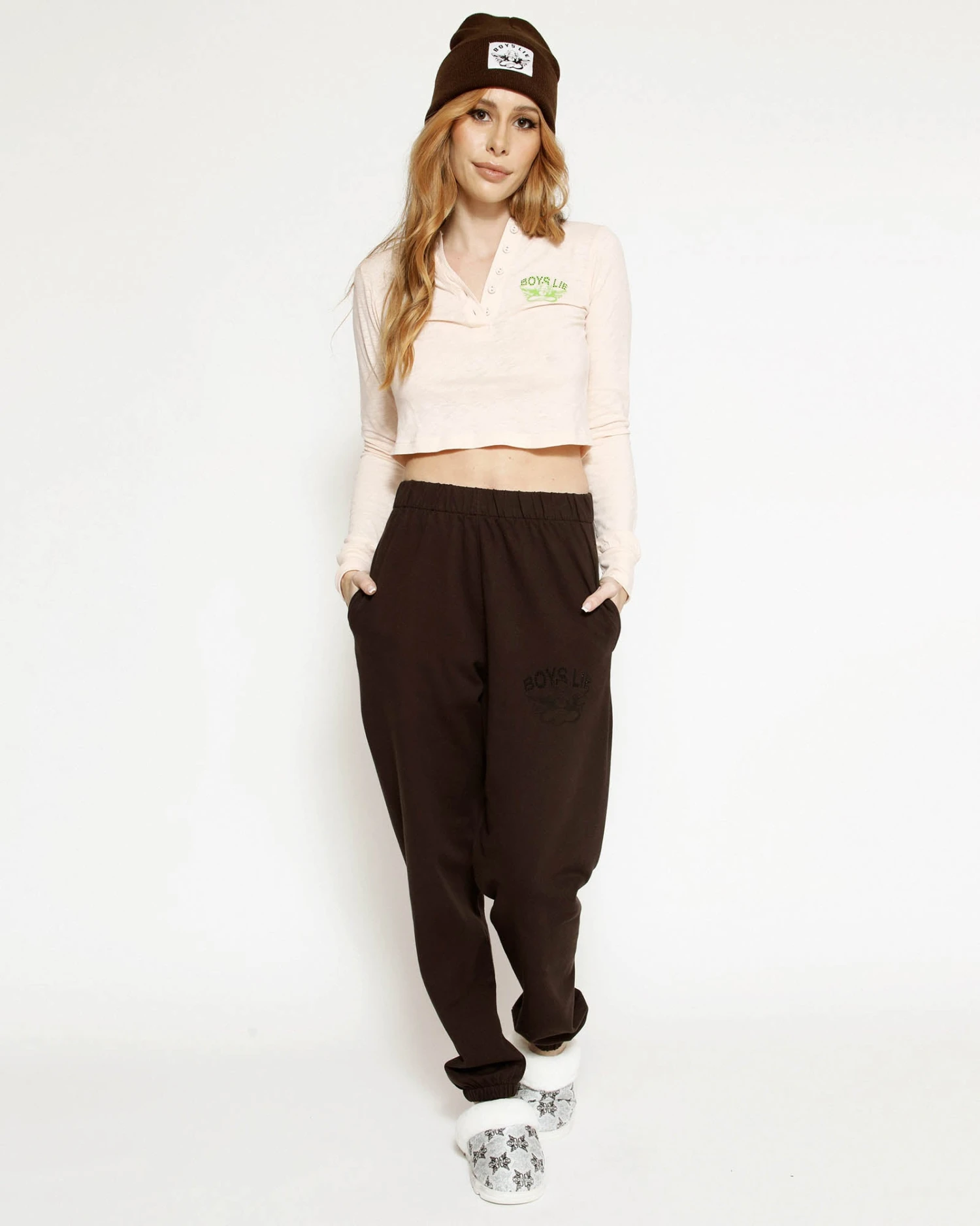 Lightweight fleece fabric in dark brown with rhinestone embellishments. High rise sweatpants with back and side pockets, elastic waistband and cuffs.