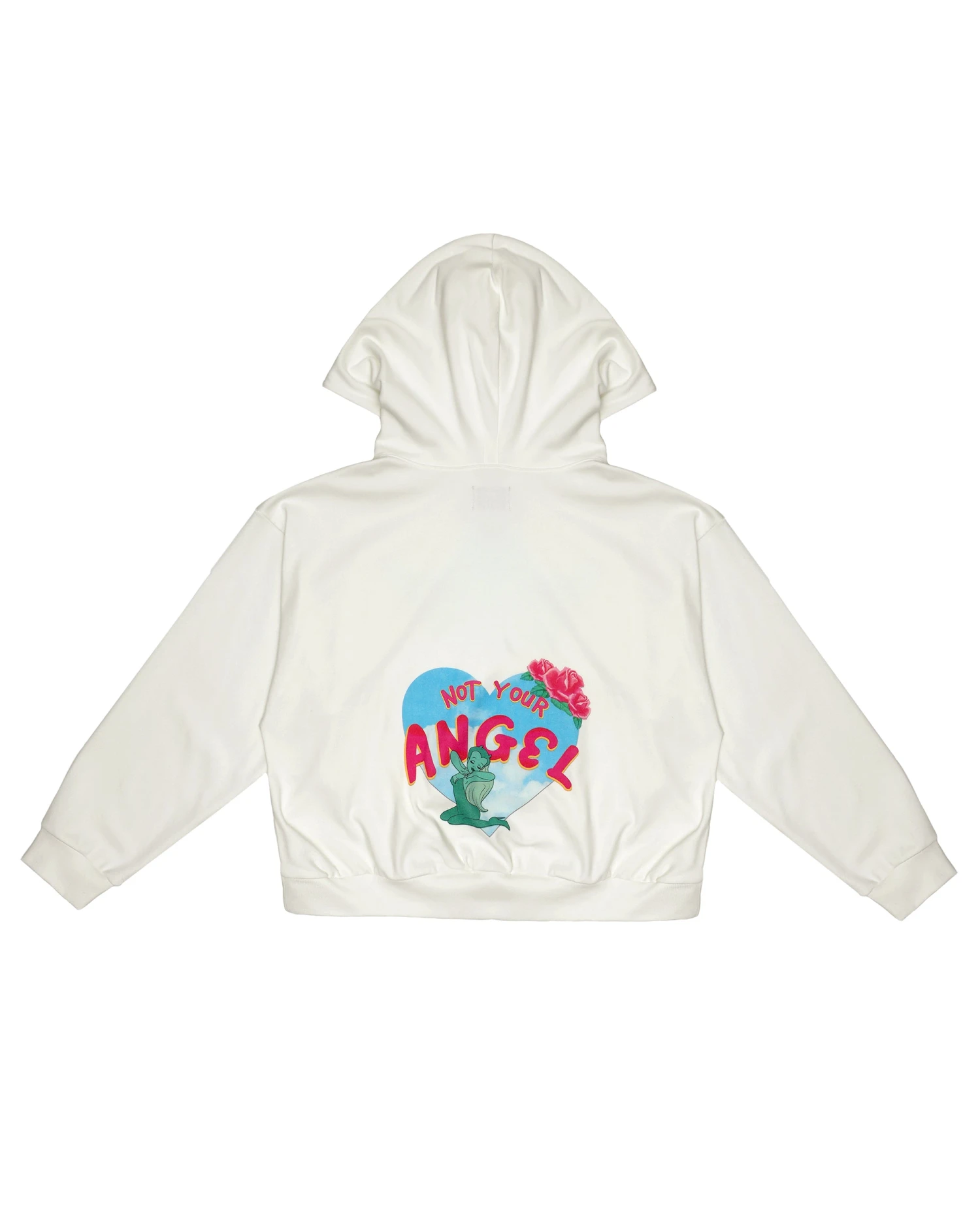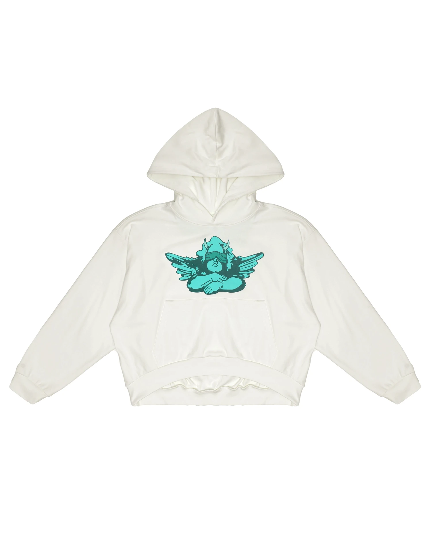 Heavyweight ribbed fabric in cream. Oversized cropped hoodie featuring a dramatic hood, front pocket, and slightly curved front hem.